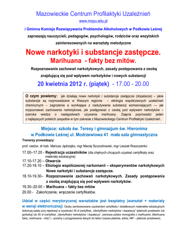Mazowieckie Centrum Profilaktyki Uzale nie www.mcpu.edu.pl i Gminna Komisja Rozwi zywania Problemów Alkoholowych w Podkowie Le nej zapraszaj nauczycieli, pedagogów, psychologów, rodziców oraz wszytskich zainteresowanych na warsztaty metodyczne Nowe narkotyki i substancje zast pcze. Marihuana - fakty bez mitów. Rozpoznawanie zachowa narkotykowych, zasady post powania z osob znajduj si pod wp ywem narkotyków i nowych substancji 20 kwietnia 2012 r. (pi tek) - 17.00 - 20.00 O czym powiemy: jak dzia aj nowe narkotyki i substancje zast pcze (dopalacze) – jakie substancje s rozprowadzane w Waszym regionie – etiologia wspó czesnych uzale nie chemicznych – zagro enie a wynikaj ce z nadu ywania substancji wzmacniaj cych –– jak rozpoznawa zachowania narkotykowe, jak post powa z osob pod wp ywem narkotyków – szeroka wiedza o nast pstwach u ywania marihuany. Zaj cia poprowadzi jeden z najlepszych polskich zespo ów w tym zakresie z Mazowieckiego Centrum Profilaktyki Uzale nie . Miejsce: szko a w. Teresy i gimnazjum w. Hieronima w Podkowie Le nej ul. Modrzewiowa 41 ma a sala gimnastyczna Trenerzy prowadz cy: prof. nadzw. dr hab. Mariusz J drzejko, mgr Maciej Szczodrowski, mgr Leszek Roszczenko 17.00–17.20 - Rejestracja uczestników (dla ch tnych chc cych uzyska certyfikaty oraz materia y edukacyjne) 17.10-17.20 – Otwarcie 17.20-18.10 – Etiologia wspó czesnej narkomanii – eksperymentów narkotykowych Nowe narkotyki i substancje zast pcze. 18.10-19.30– Rozpoznawanie zachowa narkotykowych. Zasady post powania z osob znajduj si pod wp ywem narkotyków. 19.30–20.00 – Marihuana – fakty bez mitów 20.00 - Zako czenie, wr czenie certyfikatów. Udzia w cz ci merytorycznej warsztatów jest bezp atny (warsztat + materia y w wersji elektronicznej). Osoby zainteresowane uzyskaniem certyfikatu i dodatkowych materia ów edukacyjnych dokonuj op aty przy rejestracji w wysoko ci 30 z (certyfikat, „Identyfikator narkotyków i dopalaczy” (p atno przelewem lub gotówk ) lub 50 z (certyfikat, „Identyfikator narkotyków i dopalaczy”, pierwsza polska monografia o marihuanie „Marihuana fakty, marihuana – mity”) – prosimy o przygotowanie danych do faktur (nazwa p atnika, adres, NIP – p atno przelewem).