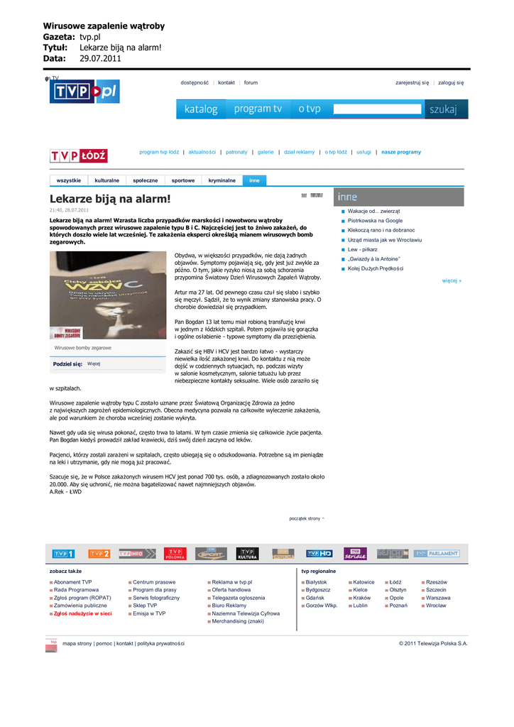 Wirusowe zapalenie w¹troby Gazeta: tvp.pl Tytu³: Lekarze bij¹ na alarm! Data: 29.07.2011 -A TVP Belsat BIP Program Katalog o TVP 1artyku 2 INFO Polonia Sport Kultura Historia HD Seriale Parlament TV Szukaj A Inne y łu + Az dzia dostępność kontakt forum zarejestruj się zaloguj się Białystok Bydgoszcz Gdańsk Gorzów Wielkopolski Katowice Kielce Kraków Lublin Łódź Olsztyn Opole Poznań Rzeszów Szczecin Warszawa Wrocław strona główna » łódź » aktualności » inne program tvp łódź | aktualności | patronaty | galerie | dział reklamy | o tvp łódź | usługi | nasze programy wszystkie kulturalne społeczne sportowe kryminalne inne Lekarze biją na alarm! 21:40, 28.07.2011 Wakacje od... zwierząt Lekarze biją na alarm! Wzrasta liczba przypadków marskości i nowotworu wątroby spowodowanych przez wirusowe zapalenie typu B i C. Najczęściej jest to żniwo zakażeń, do których doszło wiele lat wcześniej. Te zakażenia eksperci określają mianem wirusowych bomb zegarowych. Piotrkowska na Google Klekoczą rano i na dobranoc Urząd miasta jak we Wrocławiu Lew - piłkarz Wirusowe bomby zegarowe Podziel się: Więcej Obydwa, w większości przypadków, nie dają żadnych objawów. Symptomy pojawiają się, gdy jest już zwykle za późno. O tym, jakie ryzyko niosą za sobą schorzenia przypomina Światowy Dzień Wirusowych Zapaleń Wątroby. Artur ma 27 lat. Od pewnego czasu czuł się słabo i szybko się męczył. Sądził, że to wynik zmiany stanowiska pracy. O chorobie dowiedział się przypadkiem. Pan Bogdan 13 lat temu miał robioną transfuzję krwi w jednym z łódzkich szpitali. Potem pojawiła się gorączka i ogólne osłabienie - typowe symptomy dla przeziębienia. Zakazić się HBV i HCV jest bardzo łatwo - wystarczy niewielka ilość zakażonej krwi. Do kontaktu z nią może dojść w codziennych sytuacjach, np. podczas wizyty w salonie kosmetycznym, salonie tatuażu lub przez niebezpieczne kontakty seksualne. Wiele osób zaraziło się „Gwiazdy à la Antoine” Kolej Dużych Prędkości więcej » w szpitalach. Wirusowe zapalenie wątroby typu C zostało uznane przez Światową Organizację Zdrowia za jedno z największych zagrożeń epidemiologicznych. Obecna medycyna pozwala na całkowite wyleczenie zakażenia, ale pod warunkiem że choroba wcześniej zostanie wykryta. Nawet gdy uda się wirusa pokonać, często trwa to latami. W tym czasie zmienia się całkowicie życie pacjenta. Pan Bogdan kiedyś prowadził zakład krawiecki, dziś swój dzień zaczyna od leków. Pacjenci, którzy zostali zarażeni w szpitalach, często ubiegają się o odszkodowania. Potrzebne są im pieniądze na leki i utrzymanie, gdy nie mogą już pracować. Szacuje się, że w Polsce zakażonych wirusem HCV jest ponad 700 tys. osób, a zdiagnozowanych zostało około 20.000. Aby się uchronić, nie można bagatelizować nawet najmniejszych objawów. A.Rek - ŁWD początek strony zobacz także Abonament TVP Rada Programowa Zgłoś program (ROPAT) Zamówienia publiczne Zgłoś nadużycie w sieci ^ tvp regionalne Centrum prasowe Program dla prasy Serwis fotograficzny Sklep TVP Emisja w TVP mapa strony | pomoc | kontakt | polityka prywatności Reklama w tvp.pl Oferta handlowa Telegazeta ogłoszenia Biuro Reklamy Naziemna Telewizja Cyfrowa Merchandising (znaki) Białystok Bydgoszcz Gdańsk Gorzów Wlkp. Katowice Kielce Kraków Lublin Łódź Olsztyn Opole Poznań Rzeszów Szczecin Warszawa Wrocław © 2011 Telewizja Polska S.A.