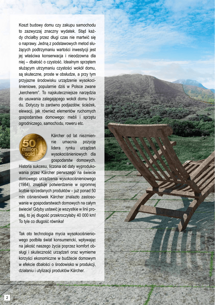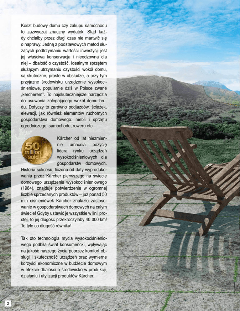 Koszt budowy domu czy zakupu samochodu to zazwyczaj znaczny wydatek. Stąd każdy chciałby przez długi czas nie martwić się o naprawy. Jedną z podstawowych metod służących podtrzymaniu wartości inwestycji jest jej właściwa konserwacja i nieodzowna dla niej – dbałość o czystość. Idealnym sprzętem służącym utrzymaniu czystości wokół domu, są skuteczne, proste w obsłudze, a przy tym przyjazne środowisku urządzenie wysokociśnieniowe, popularnie dziś w Polsce zwane „kercherem”. To najskuteczniejsze narzędzia do usuwania zalegającego wokół domu brudu. Dotyczy to zarówno podjazdów, ścieżek, elewacji, jak również elementów ruchomych gospodarstwa domowego: mebli i sprzętu ogrodniczego, samochodu, roweru etc. Kärcher od lat niezmiennie umacnia pozycję lidera rynku urządzeń wysokociśnieniowych dla gospodarstw domowych. Historia sukcesu, liczona od daty wyprodukowania przez Kärcher pierwszego na świecie domowego urządzenia wysokociśnieniowego (1984), znajduje potwierdzenie w ogromnej liczbie sprzedanych produktów – już ponad 50 mln ciśnieniówek Kärcher znalazło zastosowanie w gospodarstwach domowych na całym świecie! Gdyby ustawić je wszystkie w linii prostej, to jej długość przekroczyłaby 40 000 km! To tyle co długość równika! Tak oto technologia mycia wysokociśnieniowego podbiła świat konsumencki, wpływając na jakość naszego życia poprzez komfort obsługi i skuteczność urządzeń oraz wymierne korzyści ekonomiczne w budżecie domowym w efekcie dbałości o środowisko w produkcji, działaniu i utylizacji produktów Kärcher. 2