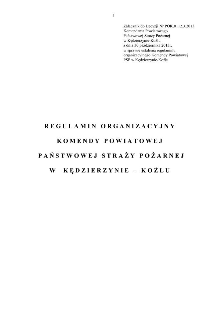 1 Załącznik do Decyzji Nr POK.0112.3.2013 Komendanta Powiatowego Państwowej Straży Pożarnej w Kędzierzynie-Koźlu z dnia 30 października 2013r. w sprawie ustalenia regulaminu organizacyjnego Komendy Powiatowej PSP w Kędzierzynie-Koźlu REGULAMIN ORGANIZACYJNY KOMENDY POWIATOWEJ PAŃSTWOWEJ STRAŻY POŻARNEJ W KĘDZIERZYNIE – KOŹLU 2 ROZDZIAŁ I Postanowienia ogólne § 1. Regulamin organizacyjny Komendy Powiatowej Państwowej Straży Pożarnej w Kędzierzynie - Koźlu zwanej dalej „komendą powiatową”, określa szczegółową organizację komendy powiatowej, w tym: 1) kierowanie pracą komendy powiatowej; 2) strukturę organizacyjną komendy powiatowej; 3) zadania wspólne i zakres działania poszczególnych komórek organizacyjnych; 4) wzory pieczęci i stempli; 5) liczbę i rodzaj stanowisk służbowych w komórkach organizacyjnych komendy powiatowej. § 2.1. Komenda jest zakwalifikowana do IV kategorii komend powiatowych Państwowej Straży Pożarnej. Terenem działania komendy powiatowej jest obszar powiatu kędzierzyńsko kozielskiego. 2. 3. Siedzibą komendy powiatowej jest miasto Kędzierzyn - Koźle ul. Kraszewskiego 12. § 3.1. Użyte w regulaminie organizacyjnym skróty oznaczają: 1) KW PSP - komendę wojewódzką Państwowej Straży Pożarnej; 2) OSP - ochotniczą straż pożarną; 3) jrg - jednostkę ratowniczo - gaśniczą Państwowej Straży Pożarnej; 4) ksr-g- krajowy system ratowniczo - gaśniczy; 5) PSP - Państwową Straż Pożarną; 6) SK KP PSP - Stanowisko Kierowania Komendanta Powiatowego Państwowej Straży Pożarnej. 3 ROZDZIAŁ II Kierowanie pracą komendy powiatowej § 4.1. Do podpisu i aprobaty Komendanta Powiatowego Państwowej Straży Pożarnej w Kędzierzynie - Koźlu zwanego dalej „komendantem powiatowym”, zastrzega się dokumentację: 1) dotyczącą zobowiązań majątkowych i finansowych, jako dysponenta środków budżetowych po parafowaniu głównego księgowego; projekty pism, decyzji i innych rozstrzygnięć w sprawach dotyczących dochodów i wydatków budżetowych, inwentaryzacji oraz postępowań dotyczących szkód wyrządzonych w majątku jednostki, są przedkładane komendantowi powiatowemu po uzyskaniu aprobaty głównego księgowego; 2) kierowaną do KW PSP, Komendy Głównej Państwowej Straży Pożarnej, centralnych organów państwa oraz wojewódzkiej administracji rządowej i samorządowej, wojewódzkiej administracji zespolonej, samorządowych jednostek organizacyjnych powiatu, organów kontroli państwowej, prokuratury, sądów, kierownictw związków zawodowych i organizacji społecznych; 3) pisma kierowane do senatorów i posłów; 4) odpowiedzi na skargi i wnioski dotyczące działalności zastępcy komendanta powiatowego, kierowników komórek organizacyjnych komendy powiatowej, pracowników; 5) zakresy czynności zastępcy komendanta powiatowego, oraz pracowników i strażaków komendy powiatowej; 6) zarządzenia, decyzje, rozkazy, delegacje służbowe, plany pracy i kontroli i inne dokumenty koordynujące działania organów ochrony przeciwpożarowej na terenie powiatu; 7) władcze akty administracyjne wydawane przez komendanta powiatowego jako organu administracji publicznej. 2. Jeżeli komendant powiatowy nie może pełnić obowiązków służbowych, jego zadania i kompetencje realizuje zastępca komendanta powiatowego. 3. Zastrzega się do podpisu i aprobaty zastępcy komendanta powiatowego dokumentację z zakresu merytorycznego działania nadzorowanych komórek organizacyjnych, z wyjątkiem wymienionych w ust. 1. lub wobec których kierownicy komórek organizacyjnych uzyskali 4 pisemne upoważnienie. 4. Komendant powiatowy lub zastępca komendanta powiatowego przyjmuje interesantów w sprawach skarg, wniosków, zażaleń i odwołań raz w tygodniu. 5. Dzień i godziny przyjęć interesantów w sprawach jak wyżej komendant podaje do powszechnej wiadomości poprzez wywieszenie jej na tablicy informacyjnej w budynku komendy. Rozdział III Struktura organizacyjna komendy powiatowej § 5.1 W skład komendy powiatowej wchodzą następujące komórki organizacyjne, które przy znakowaniu spraw i akt posługują się symbolami: 1) wydział operacyjno - szkoleniowy - symbol - PR 2) samodzielne stanowisko pracy ds. kontrolno - rozpoznawczych - symbol - PZ 3) samodzielne stanowisko pracy ds. organizacyjno - kadrowych - symbol - POK 4) sekcja finansów - symbol - PF 5) sekcja kwatermistrzowska - symbol - PT 6) Jednostka Ratowniczo - Gaśnicza nr 1 z siedzibą w Kędzierzynie - Koźlu, ul. Mostowa 33 7) - symbol PJRG-1 Jednostka Ratowniczo - Gaśnicza nr 2 z siedzibą w Kędzierzynie - Koźlu, ul. Kraszewskiego 12 - symbol PJRG-2 2. Zastępca komendanta powiatowego w realizacji zadań przy znakowaniu spraw i akt posługuje się symbolem: 1) w zakresie spraw ochrony informacji niejawnych - symbol - POIN 2) w zakresie spraw obronnych - symbol - PSO § 6.1. Komendantowi powiatowemu podlegają bezpośrednio: 5 1) sekcja finansów; 2) samodzielne stanowisko pracy ds. organizacyjno - kadrowych; 3) samodzielne stanowisko pracy ds. kontrolno - rozpoznawczych; 4) sekcja kwatermistrzowska; 5) wydział operacyjno - szkoleniowy w zakresie spraw BHP. 2. Zastępca komendanta powiatowego nadzoruje: 1) wydział operacyjno - szkoleniowy - w zakresie spraw operacyjnych, szkoleniowych, łączności i informatyki; 2) jednostki ratowniczo - gaśnicze, a także realizuje zadania określone w § 8. Rozdział IV Zadania wspólne i zakres działania poszczególnych komórek organizacyjnych § 7.1. Komórki organizacyjne mają obowiązek współdziałania i współpracy między sobą, a także współpracują z jednostkami organizacyjnymi ochrony przeciwpożarowej oraz innymi jednostkami administracji publicznej i organizacjami wykonującymi zadania na rzecz ochrony przeciwpożarowej i ratownictwa, a także realizują inne zadania z zakresu ochrony ludności. 2. W realizacji zadań obejmujących czynności kilku komórek organizacyjnych ich pr