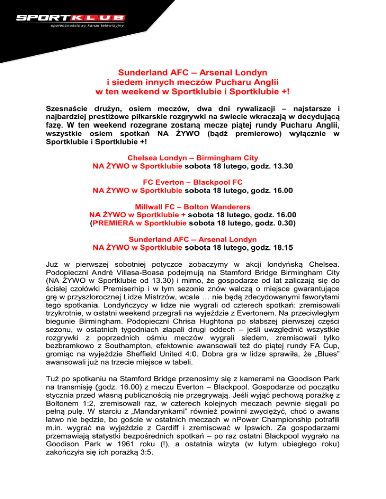 Sunderland AFC – Arsenal Londyn i siedem innych meczów Pucharu Anglii w ten weekend w Sportklubie i Sportklubie +! Szesnaście drużyn, osiem meczów, dwa dni rywalizacji – najstarsze i najbardziej prestiżowe piłkarskie rozgrywki na świecie wkraczają w decydującą fazę. W ten weekend rozegrane zostaną mecze piątej rundy Pucharu Anglii, wszystkie osiem spotkań NA ŻYWO (bądź premierowo) wyłącznie w Sportklubie i Sportklubie +! Chelsea Londyn – Birmingham City NA ŻYWO w Sportklubie sobota 18 lutego, godz. 13.30 FC Everton – Blackpool FC NA ŻYWO w Sportklubie sobota 18 lutego, godz. 16.00 Millwall FC – Bolton Wanderers NA ŻYWO w Sportklubie + sobota 18 lutego, godz. 16.00 (PREMIERA w Sportklubie sobota 18 lutego, godz. 0.30) Sunderland AFC – Arsenal Londyn NA ŻYWO w Sportklubie sobota 18 lutego, godz. 18.15 Już w pierwszej sobotniej potyczce zobaczymy w akcji londyńską Chelsea. Podopieczni André Villasa-Boasa podejmują na Stamford Bridge Birmingham City (NA ŻYWO w Sportklubie od 13.30) i mimo, że gospodarze od lat zaliczają się do ścisłej czołówki Premiserhip i w tym sezonie znów walczą o miejsce gwarantujące grę w przyszłorocznej Lidze Mistrzów, wcale … nie będą zdecydowanymi faworytami tego spotkania. Londyńczycy w lidze nie wygrali od czterech spotkań: zremisowali trzykrotnie, w ostatni weekend przegrali na wyjeździe z Evertonem. Na przeciwległym biegunie Birmingham. Podopieczni Chrisa Hughtona po słabszej pierwszej części sezonu, w ostatnich tygodniach złapali drugi oddech – jeśli uwzględnić wszystkie rozgrywki z poprzednich ośmiu meczów wygrali siedem, zremisowali tylko bezbramkowo z Southampton, efektownie awansowali też do piątej rundy FA Cup, gromiąc na wyjeździe Sheffield United 4:0. Dobra gra w lidze sprawiła, że „Blues” awansowali już na trzecie miejsce w tabeli. Tuż po spotkaniu na Stamford Bridge przenosimy się z kamerami na Goodison Park na transmisję (godz. 16.00) z meczu Everton – Blackpool. Gospodarze od początku stycznia przed własną publicznością nie przegrywają. Jeśli wyjąć pechową porażkę z Boltonem 1:2, zremisowali raz, w czterech kolejnych meczach pewnie sięgali po pełną pulę. W starciu z „Mandarynkami” również powinni zwyciężyć, choć o awans łatwo nie będzie, bo goście w ostatnich meczach w nPower Championship potrafili m.in. wygrać na wyjeździe z Cardiff i zremisować w Ipswich. Za gospodarzami przemawiają statystki bezpośrednich spotkań – po raz ostatni Blackpool wygrało na Goodison Park w 1961 roku (!), a ostatnia wizyta (w lutym ubiegłego roku) zakończyła się ich porażką 3:5. Równolegle do meczu Everton – Blackpool na londyńskim The Den Millwall zmierzy się z Boltonem (transmisja w Sportklubie + od godz. 16.00, premiera w Sportklubie o godz. 0.30). Jeśli przyjrzeć się wynikom „Lwów” z poprzednich rund, sobotnie spotkanie powinno zakończyć się … remisem. W trzeciej rundzie Millwall zremisowało bowiem bezbramkowo z Dagenham & Redbridge i dopiero w powtórzonym meczu wygrało pewnie 5:0. Podobną drogę podopieczni Kenny’ego Jacketta przeszli też w czwartej rundzie. Najpierw zremisowali z Southampton, dopiero tydzień później pokonali faworyzowanych rywali na ich obiekcie 3:2 i awansowali do dalszej fazy rozgrywek. Czy w sobotę będziemy świadkami podobnego scenariusza? Prawdziwym hitem soboty będzie starcie na Stadium of Light, w którym miejscowy Sunderland podejmie Arsenal Londyn (NA ŻYWO w Sportklubie o godz. 18.15). Drużyny te ledwie tydzień wcześniej mierzyły się na tym samym obiekcie, a stawką meczu były ligowe punkty. „Kanonierzy” wygrali 2:1, a sukces w dużej mierze zawdzięczają rewelacyjnie broniącemu w tym spotkaniu Wojciechowi Szczęsnemu i Thierry’emu Henry’emu, który w 90. minucie zdobył zwycięską bramkę. Była ta druga w tym sezonie wygrana londyńczyków nad „Czarnymi Kotami” – w październiku pokonali oni rywali na Emirates w takich samych rozmiarach. Dwie wygrane z rzędu nie oznaczają oczywiście, że i w sobotę to przyjezdni będą górą. Sunderland pod wodzą Martina O’Neilla prezentuje się znakomicie i stać go na sprawienie niespodzianki. W styczniu jego podopieczni rozegrali w lidze siedem meczów, odnosząc w nich aż pięć zwycięstw. Jedynymi przegranymi były wspomniana porażka z Arsenalem i 0:1 z Chelsea. W sobotę „Czarne Koty” spróbują więc przełamać kompleks faworyzowanych drużyn ze stolicy. Norwich City – Leicester City PREMIERA w Sportklubie niedziela 19 lutego, godz. 10.30 Crawley Town – Stoke City NA ŻYWO w Sportklubie niedziela 19 lutego, godz. 13.00 Stevenage FC – Tottenham Hotspur NA ŻYWO w Sportklubie niedziela 19 lutego, godz. 15.00 FC Liverpool – Brighton & Hove Albion NA ŻYWO w Sportklubie niedziela 19 lutego, godz. 17.30 Niedzielny maraton z FA Cup rozpoczynamy już o godz. 10.30 retransmisją sobotniego spotkania Norwich – Leicester. W potyczce tej zdecydowanymi faworytami będą występujący na co dzień w Premiership gospodarze. W lidze odnieśli oni ostatnio dwie ważne wygrane z Boltonem i Swansea, ogólnie od początku sezonu spisują się bardzo dobrze i zajmują w tabeli ósme miejsce. Jak na beniaminka w najwyższej klasie rozgrywkowej wynik znakomity. O godz. 13.00 zapraszamy na pierwszą niedzielną transmisję. Na Broadfield Stadium czwartoligowy Crawley Town podejmie Stoke City. Gospodarze to obok Stevenage jedyna drużyna z występujących jeszcze w FA Cup, która przygodę z rozgrywkami rozpoczynała od pierwszej rundy. Podopieczni Steve’a Evansa eliminowali kolejno Bury FC, Redbridge FC, Bristol City i Hull City, a więc rywali może nie z najwyższej półki, ale na pewno notowanych zdecydowanie wyżej. O kolejną niespodziankę i awans kosztem Stoke będzie jednak niesłychanie trudno. „The Potters” wprawdzie przegrali w lidze cztery ostatnie mecze, kadrowo biją jednak swoich rywali na