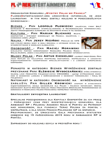 Organizator Konkursu „Wybitny Polak we Francji” FlorekEntertainment.org uroczyście informuje, ze jego Laureatami w tym roku zostali kolejno w poszczególnych dziedzinach : ! Biznes - Pan Leopold Płowiecki założyciel firmy BALT Extrusion w Montmorency wyspecjalizowanej w Neuroradiologii Interwencyjnej. Jedyny przedsiębiorca europejski na światowym rynku w tej dziedzinie. Kultura - Pan Marian Blicharz Muzyk, kompozytor i dyrygent mieszkający we Francji, założyciel i kierownik chóru „Piast”. Nauka - Pan Jerzy Niziński Pracuje od 1976 nad cyklem obiegu wody w skali regionu, a uzyskane wyniki są wykorzystywane w modelach globalnych. Osobowość - Pan Maciej Morawski wieloletni paryski korespondent Rozgłośni Polskiej Radia Wolna Europa, jeden z najlepszych polskich dziennikarzy informacyjnych. Młody Polak - Pan Artur Ciesielski laureat prestiżowej Prix Jean Kepler za najlepsza rozprawę doktorska. współdziała z uznanymi międzynarodowymi czasopismami specjalistycznymi i z liderami europejskiej gospodarki. ! Ponadto w kategorii Biznes Wyróżnienie zostało przyznane Pani Elżbiecie Wysoczańskiej, która stworzyła własną linie produktów pielęgnacyjnych VISOANSKA - łącząc wypracowane knowhow w dziedzinie luksusu z doświadczeniem z dziedziny farmakologii i pasją do pielęgnacji. Natomiast w kategorii Osobowość na wyróżnienie zasłużył Pan Gilles Krowicki ekspert w stosunkach międzynarodowych, działa szczególnie dla Polski i polskich notariuszy. Został odznaczony Złotym Krzyżem Zasługi przez prezydenta Bronisława Komorowskiego za dokonania w rozwijaniu polsko-francuskiej współpracy notarialnej. ! Gratulujemy zwycięstwa Laureatom! ! Specjalne podziękowania dla Kapituły Ekspertów za ich pracę i poświęcony czas przy rozstrzygnięciu konkursu, dla Ambasady RP i Polskiej Akademii Nauk w Paryżu za Patronat nad konkursem, dla fundacji Teraz Polska za pomysł i współprace, a dla Union Franco-Polonaise IdF za wsparcie. Przypominamy, ze Uroczysta Gala przyznania statuetek odbędzie się 15 października 2015 roku w Ambasadzie RP w Paryżu. ! Zapraszamy do kolejnej edycji w przyszłym roku !