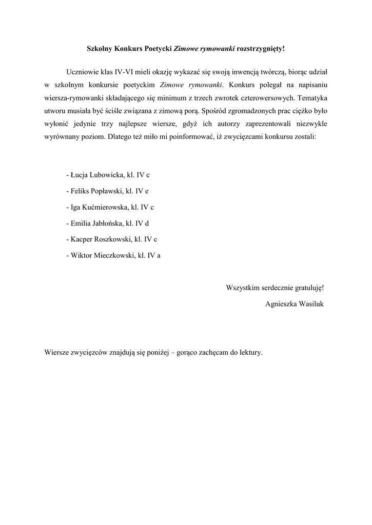 Szkolny Konkurs Poetycki Zimowe rymowanki rozstrzygnięty! Uczniowie klas IV-VI mieli okazję wykazać się swoją inwencją twórczą, biorąc udział w szkolnym konkursie poetyckim Zimowe rymowanki. Konkurs polegał na napisaniu wiersza-rymowanki składającego się minimum z trzech zwrotek czterowersowych. Tematyka utworu musiała być ściśle związana z zimową porą. Spośród zgromadzonych prac ciężko było wyłonić jedynie trzy najlepsze wiersze, gdyż ich autorzy zaprezentowali niezwykle wyrównany poziom. Dlatego też miło mi poinformować, iż zwycięzcami konkursu zostali: - Łucja Lubowicka, kl. IV c - Feliks Popławski, kl. IV e - Iga Kućmierowska, kl. IV c - Emilia Jabłońska, kl. IV d - Kacper Roszkowski, kl. IV c - Wiktor Mieczkowski, kl. IV a Wszystkim serdecznie gratuluję! Agnieszka Wasiluk Wiersze zwycięzców znajdują się poniżej – gorąco zachęcam do lektury. ZIMOWE RYMOWANKI Zimowy czar i magia (Łucja Lubowicka, kl. IV c) Napadało śniegu wiele, chodźcie mali przyjaciele. Ulepimy wnet bałwana, śniegowego super – pana. W śnieżki bawić się będziemy, a wieczorem odpoczniemy. Gdy już spać się położymy, o prezentach sobie śpimy. Choineczkę przyniesiemy, pięknie udekorujemy. Aby w święta czar i magia, w nasze serca się zakradła. Mroźny dzień (Feliks Popławski, kl. IV e) Sroga, biała, śnieżna zima i siarczysty mróz wciąż trzyma. Przez skrzypiący, biały śnieg mały chłopiec biegł. Przed górką zobaczył sanki i z czwartej klasy koleżanki. Dziewczynki z górki zjeżdżały i bardzo głośno się śmiały. Chłopiec wrócił do domu, nic nie mówił nikomu. Zabrał ze sobą narty, bo był bardzo uparty. Pobiegł na górę szybko jakby był sprytną rybką. Zjechał z górki szybkim susem jakby był śnieżnym duchem. Znowu wrócił do domu, nic nie mówił nikomu. Dumny bardzo był z siebie i było mu jak w niebie, bo pokonał mróz i już nie jest tchórz. Zimowy czar (Iga Kućmierowska, kl. IV c) Coraz krótsze dni się stają, ptaki wcale nie śpiewają. Mróz już szczypie w nasze uszy, co dzień w nocy śnieżek prószy. Rzeki lodem się pokryły, sosny białe suknie założyły. Wszystko wokół wygląda bajecznie, taki widok mógłby trwać wiecznie. Mówię do swej koleżanki: „Zuziu, szybko idź po sanki!” Ubieramy się cieplutko i bawimy wesolutko. Drzewa śniegiem otulone, w naszą stronę pochylone. Z dachów sopelki zwisają i się do nas uśmiechają. Popatrz na cudne śnieżynki, tańczą w słońcu jak dziewczynki. Piękne kształty przybierają, do zabawy zapraszają. Piękna nasza zima polska, od Pomorza, aż do Śląska. W żadnym kraju nie znajdziecie tych widoków – to już wiecie. Zimowa pora (Emilia Jabłońska, kl. IV d) Najzimniejsza pora roku, Pani Zima przy mym boku. Śniegiem po kolana prószy, sypie nawet w nasze uszy. Dzieciom zima nie przeszkadza, bo bałwanek dobrze im doradza. Gdy go lepią to się cieszą, ale do innych zabaw także śpieszą. Ten, kto zimę lubi, niech się śmieje, bo każdy ma tę wielką nadzieję, że co roku będzie wracać i nie będzie się zawracać. Zimowe pejzaże (Kacper Roszkowski, kl. IV c) Narysuję na oknie zimowe pejzaże, śniegiem usłane, jak sobie wymarzę. Będą bielutkie, oszronione czasem, muśnięte lekkim puchem, jak promień nad lasem. Widzę rodzinę, co do domu zmierza, chłopiec robi kulki ze śnieżnego pierza. Mama tuli dziewczynkę, co wypadła z sanek, a tata niesie choinkę i je ciastka z marcepanem. Ten zimowy czas to magia prawdziwa, bo widok zza okna to nie żaden dziwak. To dom mój i moja rodzina, taki zimowy obrazek me okno przypomina. Zima (Wiktor Mieczkowski, kl. IV a) Kiedy dni stają się coraz krótsze, kiedy noce są coraz dłuższe, wiatr za oknem mocno wieje, a błękit chmur ciemnieje. Płatki śniegu rozjaśniają świat, na polu swoje stopy odbił skrzat. Magiczny zapach w powietrzu się unosi, i na zewnątrz, na zewnątrz nas prosi. Chodźmy, razem ulepimy bałwanka, zmarzniemy w ręce z samego ranka. Będziemy się bawić i każdy wytrzyma, bo wcale nie straszna jest taka zima.