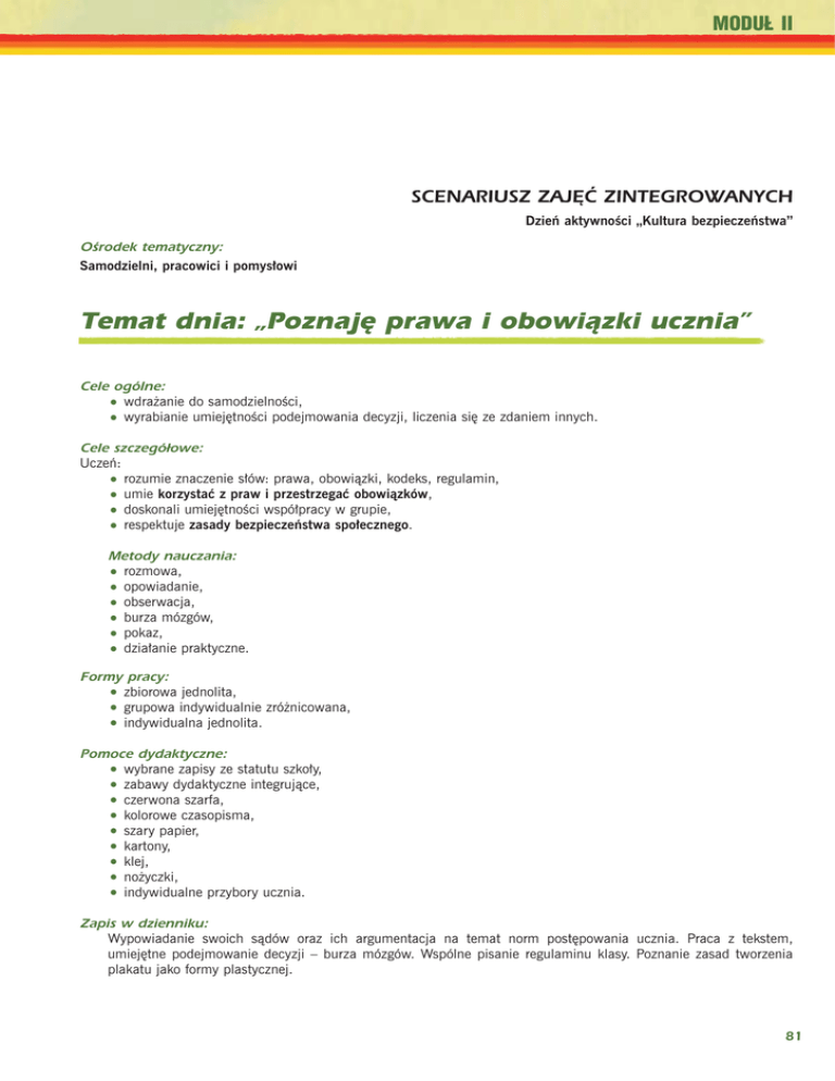 MODUŁ II SCENARIUSZ ZAJĘĆ ZINTEGROWANYCH Dzieñ aktywnoœci „Kultura bezpieczeñstwa” Ośrodek tematyczny: Samodzielni, pracowici i pomys³owi Temat dnia: „Poznaję prawa i obowiązki ucznia” Cele ogólne: • wdra¿anie do samodzielnoœci, • wyrabianie umiejêtnoœci podejmowania decyzji, liczenia siê ze zdaniem innych. Cele szczegółowe: Uczeñ: • rozumie znaczenie s³ów: prawa, obowi¹zki, kodeks, regulamin, • umie korzystaæ z praw i przestrzegaæ obowi¹zków, • doskonali umiejêtnoœci wspó³pracy w grupie, • respektuje zasady bezpieczeñstwa spo³ecznego. Metody nauczania: • rozmowa, • opowiadanie, • obserwacja, • burza mózgów, • pokaz, • dzia³anie praktyczne. Formy pracy: • zbiorowa jednolita, • grupowa indywidualnie zró¿nicowana, • indywidualna jednolita. Pomoce dydaktyczne: • wybrane zapisy ze statutu szko³y, • zabawy dydaktyczne integruj¹ce, • czerwona szarfa, • kolorowe czasopisma, • szary papier, • kartony, • klej, • no¿yczki, • indywidualne przybory ucznia. Zapis w dzienniku: Wypowiadanie swoich s¹dów oraz ich argumentacja na temat norm postêpowania ucznia. Praca z tekstem, umiejêtne podejmowanie decyzji – burza mózgów. Wspólne pisanie regulaminu klasy. Poznanie zasad tworzenia plakatu jako formy plastycznej. 81 ZASADY BEZPIECZNEGO ZACHOWANIA W SZKOLE Cele operacyjne Zadania dla uczniów Czynnoœci uczniów Pomoce dydaktyczne Wie, ¿e uczeñ ma prawa i obowi¹zki G³oœne odczytanie zapisu z tablicy: „NIESPODZIANKA”. Przeprowadzenie zabawy: „Poszukiwanie skarbu” W ró¿nych miejscach klasy ukryte s¹ kartoniki z pewn¹ informacj¹.Zadanie polega na ich odnalezieniu. Pracuj¹ w zespo³ach piêcioosobowych. Wybrane fragmenty ze statutu w³asnej szko³y, dotycz¹ce praw i obowi¹zków ucznia Potrafi g³oœno odczytaæ zapisany tekst. Rozumie znaczenie s³ów: prawo, obowi¹zek, statut, regulamin. Samodzielne czytanie ze zrozumieniem. Wszyscy uczniowie, posiadaj¹cy kartki z zapisem: „Uczeñ ma prawo...”, przechodz¹ na lew¹ stronê, a uczniowie z kartkami o treœci: „Uczeñ ma obowi¹zek...”, na praw¹ stronê sali lekcyjnej. Czerwona szarfa do podzielenia pomieszczenia klasowego. Umie korzystaæ z niektórych dokumentów. Potrafi œwiadomie podejmowaæ decyzje. Wyjaœnienie treœci wybranych fragmentów statutu szko³y. Pisanie w zeszytach Zapisuj¹ myœl przewodni¹ dnia aktywnoœci. Prawa i obowi¹zki uczniów polskich szkó³, zobowi¹zuj¹ siê do rzetelnej pracy w atmosferze bezpieczeñstwa, ¿yczliwoœci i szacunku. Umie odpowiedzieæ na pytanie: W jaki sposób mo¿na poprawiæ atmosferê w naszej klasie? Przygotowanie materia³u, do opracowania regulaminu klasowego. Burza mózgów. Zapisuj¹ na du¿ym arkuszu papieru wszystkie pomys³y. Na podstawie zgromadzonego materia³u s³ownikowego, redaguj¹ regulamin klasy. Szary arkusz papieru, kolorowe mazaki. Materia³ pomocniczy dla nauczyciela Umie samodzielnie dokoñczyæ wypowiedzi. Potrafi wskazaæ zalety i wady funkcjonowania swojej klasy. Rozumie zasadnoœæ korzystania z praw i przestrzegania obowi¹zków. Dokoñczenie zdañ otwartych, zgodnie z indywidualnymi odczuciami. Uzupe³niaj¹ wypowiedzi. Praca samodzielna. Karta pracy nr 1 Zna zasady tworzenia plakatu. Rozumie rolê podzia³u pracy. Wykonanie plakatu jako formy Wycinaj¹ twarze i ca³e postaci, plastycznej na temat „Bezpieczni, przedstawiaj¹ce pozytywne zdrowi i radoœni”. emocje i uczucia. Naklejaj¹ i tworz¹ kompozycjê zamkniêt¹. 82 Kolorowe czasopisma zawieraj¹ce fotografie twarzy dzieci. Du¿y arkusz kartonu kolorowego. Klej, no¿yczki. MODUŁ II MATERIAŁ POMOCNICZY DLA NAUCZYCIELA Regulamin Klasy 1. Nie przeszkadzamy innym. 2. Dyskutujemy o tym, co jest tematem zajêæ. 3. Nie krytykujemy (ka¿dy ma prawo do b³êdów). 4. Aktywnie uczestniczymy w pracy grupy. 5. Nie spóŸniamy siê. 6. Jesteœmy dla siebie ¿yczliwi i serdeczni. 7. Szanujemy zdanie innych. 8. Dbamy o bezpieczeñstwo i zdrowie w³asne oraz swoich kolegów. 83 83 ZASADY BEZPIECZNEGO ZACHOWANIA W SZKOLE KARTA PRACY UCZNIA NR 1. Uzupe³nij zdania: 1. Chcia³bym, ¿eby w klasie .............................................................................................................. .............................................................................................................................................................. .............................................................................................................................................................. 2. Martwi mnie .................................................................................................................................... .............................................................................................................................................................. .............................................................................................................................................................. 3. Podoba mi siê ................................................................................................................................. .............................................................................................................................................................. .............................................................................................................................................................. 84