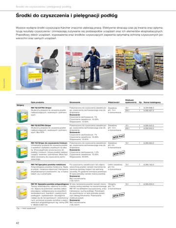 Środki do czyszczenia i pielęgnacji podłóg Środki do czyszczenia i pielęgnacji podłóg Szorowarki Wysoce wydajne środki czyszczące Kärcher znacznie ułatwiają pracę. Efektywnie skracają czas jej trwania oraz optymalizują rezultaty czyszczenia i zmniejszają zużywanie się podzespołów urządzeń oraz ich elementów eksploatacyjnych. Prawidłowy dobór urządzeń, wyposażenia oraz środków czyszczących zapewnia optymalną ochronę czyszczonych powierzchni oraz samych urządzeń. Opis produktu Stosowanie Właściwości RM 752 EXTRA Striper Skuteczny preparat do usuwania powłok nabłyszczających, woskowych i polimerowych. Przeznaczony do czyszczenia zasadnicze- Zasadowy go, czyszczenia zachowawczego oraz do pH: 13.4 stripowania. w koncentracie Dozowanie: Czyszczenie zachowawcze: 1% Czyszczenie zasadnicze: 10-20% Strippowanie: 10-50% Wielkość opakowania Op. Numer katalogowy Stripery 10 l 1 6.294-996.0 200 l 1 6.295-407.0 RM 752 EXTRA Striper Skuteczny preparat do usuwania powłok nabłyszczających, woskowych i polimerowych. Bez NTA. Przeznaczony do czyszczenia zasadnicze- Zasadowy 10 l go, czyszczenia zachowawczego oraz do pH: 13.4 200 l stripowania. w koncentracie Dozowanie: Czyszczenie zachowawcze: 1% free Czyszczenie zasadnicze: 10-20% NTAStrippowanie: 10-50% 1 6.295-542.0 1 6.295-543.0 RM 754 Striper do czyszczenia linoleum Uniwersalny preparat do usuwania powłok z wszelkich wykładzin wrażliwych na alkalia. W szczególności przeznaczony do podłóg z linoleum. Usuwa powłoki nabłyszczające, woskowe i polimerowe. Może być także stosowany do czyszczenia zachowawczego. Przeznaczony do czyszczenia zasadnicze- Zasadowy 10 l go, czyszczenia zachowawczego oraz do pH: 9.5 stripowania. w koncentracie Dozowanie: Czyszczenie zachowawcze: 1-3% free NTACzyszczenie zasadnicze: 10-20% Strippowanie: 20-50% 1 6.295-563.0 RM 740 Specjalna powłoka metaliczna Antypoślizgowa powłoka metaliczna. Nadaje połysk i zwiększa odporność intensywnie eksploatowanych powierzchni, np. w warsztatach czy w przemyśle. 10 l Po czyszczeniu zasadniczym lub zdjęciu Lekko zasadowy wierzchniej powłoki nanieść równomiernie pH: 8.5 pierwszą warstwę mopem lub wełnianą w koncentracie szczotką. Po godzinie schnięcia powtórzyć. W razie potrzeby nanieść trzecią warstwę. free Dozowanie: NTABez rozcieńczania (125 ml/m²) 1 6.295-155.0 RM 781 Specjalna powłoka antypoślizgowa Tworzy wodoodporną, odporną na ścieranie, dającą się polerować warstwę zabezpieczającą i pielęgnacyjną na wszystkich wodoodpornych, twardych i elastycznych podłogach i wykładzinach. Szczególnie nadaje się do hal sportowych i wielofunkcyjnych, ponieważ posiada certyfikat o właściwościach antypoślizgowych wg. normy DIN V 18032-2:2001-04. W celu naniesienia powłoki nanieść równo- Obojętny 10 l mierną cienką warstwę nie rozcieńczonego pH: 7.8 RM 781 na dokładnie wyczyszczoną, zneu- w koncentracie tralizowaną i suchą podłogę. Pozostawić do wyschnięcia i w razie potrzeby powtófree rzyć zabieg kilkukrotnie. Polerowanie NTAzwiększa połysk. Dozowanie: Bez rozcieńczania (125 ml/m²) 1 6.295-034.0 Powłoki Op. = ilość opakowań 42