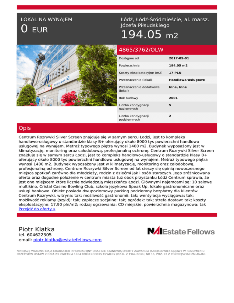 LOKAL NA WYNAJEM 0 EUR Łódź, Łódź-Śródmieście, al. marsz. Józefa Piłsudskiego 194.05 m2 4865/3762/OLW Dostępne od 2017-09-01 Powierzchnia 194,05 m2 Koszty eksploatacyjne (m2) 17 PLN Przeznaczenie (lokal) Handlowo/Usługowe Przeznaczenie dodatkowe (lokal) Inne, Inne Rok budowy 2001 Liczba kondygnacji naziemnych 5 Liczba kondygnacji podziemnych 2 Opis Centrum Rozrywki Silver Screen znajduje się w samym sercu Łodzi, jest to kompleks handlowo-usługowy o standardzie klasy B+ oferujący około 8000 tys powierzchni handlowo usługowej na wynajem. Metraż typowego piętra wynosi 1400 m2. Budynek wyposażony jest w klimatyzację, monitoring oraz całodobową, profesjonalną ochronę. Centrum Rozrywki Silver Screen znajduje się w samym sercu Łodzi, jest to kompleks handlowo-usługowy o standardzie klasy B+ oferujący około 8000 tys powierzchni handlowo usługowej na wynajem. Metraż typowego piętra wynosi 1400 m2. Budynek wyposażony jest w klimatyzację, monitoring oraz całodobową, profesjonalną ochronę. Centrum Rozrywki Silver Screen od lat cieszy się opinią nowoczesnego miejsca spotkań zarówno dla młodzieży, rodzin z dziećmi jak i osób starszych. Jego zróżnicowana oferta oraz dogodne położenie w centrum miasta tuż obok przystanku Łódź Centrum sprawia, że jest ono miejscem które licznie odwiedzają mieszkańcy Łodzi. Głównymi najemcami są: 10 salowe multikino, Cristal Casino Bowling Club, szkoła językowa Speak Up, lokale gastronomiczne oraz usługi bankowe. Obiekt posiada dwupoziomowy parking podziemny bezpłatny dla klientów Centrum Rozrywki. witryna: tak; możliwość gastronomii: tak; wentylacja wyciągowa: tak; możliwość reklamy (szyld): tak; zaplecze socjalne: tak; ogródek: tak; strefa dostaw: tak; koszty eksploatacyjne: 17,90 pln/m2; rodzaj ogrzewania: CO miejskie, powierzchnia magazynowa: tak Przejdź do oferty » Piotr Klatka tel. 604622305 email: [email protected] NINIEJSZE WARUNKI MAJĄ CHARAKTER INFORMACYJNY ORAZ NIE STANOWIĄ OFERTY ZAWARCIA JAKIEJKOLWIEK UMOWY W ROZUMIENIU PRZEPISÓW USTAW Z DNIA 23 KWIETNIA 1964 ROKU KODEKS CYWILNY (DZ.U. Z 1964 ROKU, NR 16, POZ. 93 Z PÓŹNIEJSZYMI ZMIANAMI. Powered by TCPDF (www.tcpdf.org)