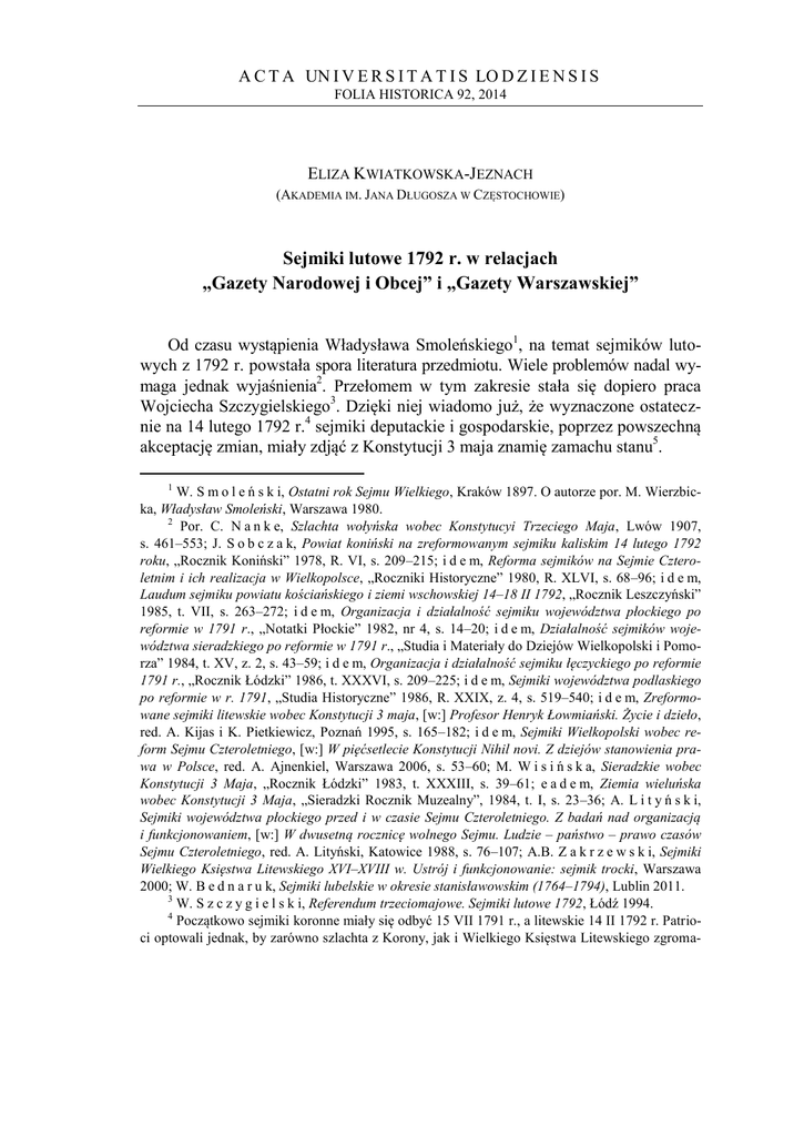 A C T A UN I V E R S I T A T I S LO D Z I E N S I S FOLIA HISTORICA 92, 2014 ELIZA KWIATKOWSKA-JEZNACH (AKADEMIA IM. JANA DŁUGOSZA W CZĘSTOCHOWIE) Sejmiki lutowe 1792 r. w relacjach „Gazety Narodowej i Obcej” i „Gazety Warszawskiej” Od czasu wystąpienia Władysława Smoleńskiego1, na temat sejmików lutowych z 1792 r. powstała spora literatura przedmiotu. Wiele problemów nadal wymaga jednak wyjaśnienia2. Przełomem w tym zakresie stała się dopiero praca Wojciecha Szczygielskiego3. Dzięki niej wiadomo już, że wyznaczone ostatecznie na 14 lutego 1792 r.4 sejmiki deputackie i gospodarskie, poprzez powszechną akceptację zmian, miały zdjąć z Konstytucji 3 maja znamię zamachu stanu5. 1 W. S m o l e ń s k i, Ostatni rok Sejmu Wielkiego, Kraków 1897. O autorze por. M. Wierzbicka, Władysław Smoleński, Warszawa 1980. 2 Por. C. N a n k e, Szlachta wołyńska wobec Konstytucyi Trzeciego Maja, Lwów 1907, s. 461–553; J. S o b c z a k, Powiat koniński na zreformowanym sejmiku kaliskim 14 lutego 1792 roku, „Rocznik Koniński” 1978, R. VI, s. 209–215; i d e m, Reforma sejmików na Sejmie Czteroletnim i ich realizacja w Wielkopolsce, „Roczniki Historyczne” 1980, R. XLVI, s. 68–96; i d e m, Laudum sejmiku powiatu kościańskiego i ziemi wschowskiej 14–18 II 1792, „Rocznik Leszczyński” 1985, t. VII, s. 263–272; i d e m, Organizacja i działalność sejmiku województwa płockiego po reformie w 1791 r., „Notatki Płockie” 1982, nr 4, s. 14–20; i d e m, Działalność sejmików województwa sieradzkiego po reformie w 1791 r., „Studia i Materiały do Dziejów Wielkopolski i Pomorza” 1984, t. XV, z. 2, s. 43–59; i d e m, Organizacja i działalność sejmiku łęczyckiego po reformie 1791 r., „Rocznik Łódzki” 1986, t. XXXVI, s. 209–225; i d e m, Sejmiki województwa podlaskiego po reformie w r. 1791, „Studia Historyczne” 1986, R. XXIX, z. 4, s. 519–540; i d e m, Zreformowane sejmiki litewskie wobec Konstytucji 3 maja, [w:] Profesor Henryk Łowmiański. Życie i dzieło, red. A. Kijas i K. Pietkiewicz, Poznań 1995, s. 165–182; i d e m, Sejmiki Wielkopolski wobec reform Sejmu Czteroletniego, [w:] W pięćsetlecie Konstytucji Nihil novi. Z dziejów stanowienia prawa w Polsce, red. A. Ajnenkiel, Warszawa 2006, s. 53–60; M. W i s i ń s k a, Sieradzkie wobec Konstytucji 3 Maja, „Rocznik Łódzki” 1983, t. XXXIII, s. 39–61; e a d e m, Ziemia wieluńska wobec Konstytucji 3 Maja, „Sieradzki Rocznik Muzealny”, 1984, t. I, s. 23–36; A. L i t y ń s k i, Sejmiki województwa płockiego przed i w czasie Sejmu Czteroletniego. Z badań nad organizacją i funkcjonowaniem, [w:] W dwusetną rocznicę wolnego Sejmu. Ludzie – państwo – prawo czasów Sejmu Czteroletniego, red. A. Lityński, Katowice 1988, s. 76–107; A.B. Z a k r z e w s k i, Sejmiki Wielkiego Księstwa Litewskiego XVI–XVIII w. Ustrój i funkcjonowanie: sejmik trocki, Warszawa 2000; W. B e d n a r u k, Sejmiki lubelskie w okresie stanisławowskim (1764–1794), Lublin 2011. 3 W. S z c z y g i e l s k i, Referendum trzeciomajowe. Sejmiki lutowe 1792, Łódź 1994. 4 Początkowo sejmiki koronne miały się odbyć 15 VII 1791 r., a litewskie 14 II 1792 r. Patrioci optowali jednak, by zarówno szlachta z Korony, jak i Wielkiego Księstwa Litewskiego zgroma- 50 ELIZA KWIATKOWSKA-JEZNACH Celem niniejszego artykułu jest przedstawienie sposobu prezentacji sejmików lutowych na łamach „Gazety Warszawskiej” oraz „Gazety Narodowej i Obcej”. W części pierwszej zostaną omówione relacje prasowe w ujęciu chronologicznym. W części drugiej postaram się ukazać różnice pomiędzy ówczesną a dzisiejszą oceną referendum trzeciomajowego. Gazety osiemnastowieczne donosiły o dwóch formach poparcia dla Konstytucji 3 maja przez sejmiki, tj. o przysiędze i o podziękowaniu. Władysław Smoleński dostrzegł też zgromadzenia obojętne wobec nowego ustroju. Inną interpretację przedstawił z kolei Wojciech Szczygielski. Jego zdaniem sejmiki zaprzysięgły, zaręczyły, podziękowały za Ustawę Rządową bądź też przemilczały jej uchwalenie. Przy czym autor ten tylko dwie pierwsze formy uznał za silne poparcie dla Konstytucji 3 maja. Należy odpowiedzieć na pytanie, dlaczego prasa w ten właśnie sposób przedstawiła wyniki sejmików lutowych 1792 r. oraz czy informowała rzetelnie? Zanim jednak przejdziemy do zasadniczej części rozważań, spróbujmy przedstawić ówcześnie działające tytuły prasowe. Na początku 1792 r. w Warszawie ukazywały się dwie gazety informacyjne6. Były to „Gazeta Warszawska”, kierowana przez eksjezuitę Stefana Łuskinę oraz „Gazeta Narodowa i Obca”, której redaktorami byli związani z obozem reform Julian Ursyn Niemcewicz, Józef Weyssenhoff i Tadeusz Mostowski. „Gazeta Warszawska” ukazywała się od 1774 r. i prezentowała konserwatywne poglądy redaktora7. Jego niechęć do oświeceniowych idei została utwierdziła się w lutym. Chcieli zyskać więcej czasu na zdobycie poparcia dla Konstytucji 3 maja na prowincji. Ostatecznie posłowie przegłosowali termin lutowy. Por. W. S m o l e ń s k i, op. cit., s. 259–260; W. S z c z y g i e l s k i, op. cit., s. 18–20. 5 Por. K. Z i e n k o w s k a, Spisek 3 maja, Warszawa 1991; J. M i c h a l s k i, Konstytucja 3 maja, Warszawa 1985; B. S z y n d l e r, Czy Sejm Czteroletni uchwalił Konstytucję 3 maja? Na tropie mitów narodowych, Warszawa 2010; A. G r z e ś k o w i a k - K r w a w i c z, Czy rewolucja może być legalna? 3 maja 1791 w oczach współczesnych, Warszawa 2011. Por. też A. S t r o y n o w s k i, Konstytucja, prawo, praworządność w epoce stanisławowskiej, [w:] Konstytucja Stanów Zjednoczonych Ameryki – reminiscencje w 220 rocznicę uchwalenia, 1787–2007, red. J. Daszyńska, Łódź 2009, s. 143–158. Kajetan Koźmian tak wspominał te wydarzenia: „Wkrótce jednak sejm uznał potrzebę silniejszego dzieła swego poparcia, wyd