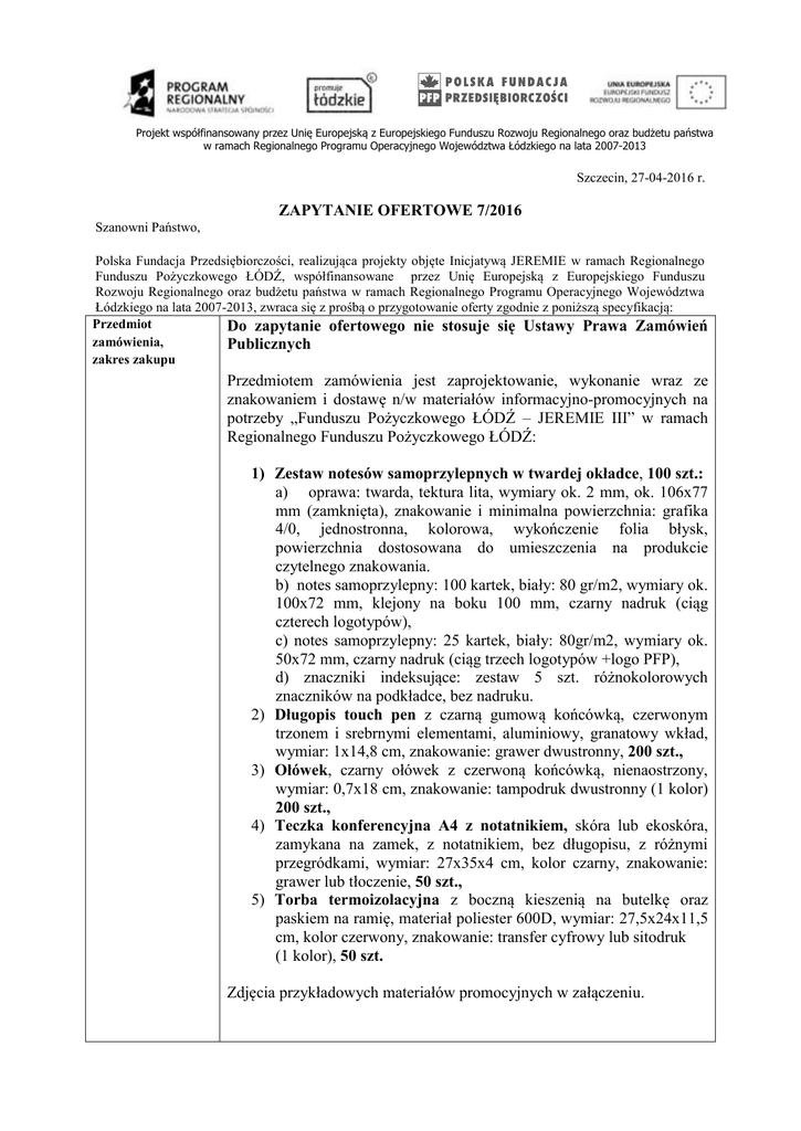 Projekt współfinansowany przez Unię Europejską z Europejskiego Funduszu Rozwoju Regionalnego oraz budżetu państwa w ramach Regionalnego Programu Operacyjnego Województwa Łódzkiego na lata 2007-2013 Szczecin, 27-04-2016 r. ZAPYTANIE OFERTOWE 7/2016 Szanowni Państwo, Polska Fundacja Przedsiębiorczości, realizująca projekty objęte Inicjatywą JEREMIE w ramach Regionalnego Funduszu Pożyczkowego ŁÓDŹ, współfinansowane przez Unię Europejską z Europejskiego Funduszu Rozwoju Regionalnego oraz budżetu państwa w ramach Regionalnego Programu Operacyjnego Województwa Łódzkiego na lata 2007-2013, zwraca się z prośbą o przygotowanie oferty zgodnie z poniższą specyfikacją: Przedmiot Do zapytanie ofertowego nie stosuje się Ustawy Prawa Zamówień zamówienia, Publicznych zakres zakupu Przedmiotem zamówienia jest zaprojektowanie, wykonanie wraz ze znakowaniem i dostawę n/w materiałów informacyjno-promocyjnych na potrzeby „Funduszu Pożyczkowego ŁÓDŹ – JEREMIE III” w ramach Regionalnego Funduszu Pożyczkowego ŁÓDŹ: 1) Zestaw notesów samoprzylepnych w twardej okładce, 100 szt.: a) oprawa: twarda, tektura lita, wymiary ok. 2 mm, ok. 106x77 mm (zamknięta), znakowanie i minimalna powierzchnia: grafika 4/0, jednostronna, kolorowa, wykończenie folia błysk, powierzchnia dostosowana do umieszczenia na produkcie czytelnego znakowania. b) notes samoprzylepny: 100 kartek, biały: 80 gr/m2, wymiary ok. 100x72 mm, klejony na boku 100 mm, czarny nadruk (ciąg czterech logotypów), c) notes samoprzylepny: 25 kartek, biały: 80gr/m2, wymiary ok. 50x72 mm, czarny nadruk (ciąg trzech logotypów +logo PFP), d) znaczniki indeksujące: zestaw 5 szt. różnokolorowych znaczników na podkładce, bez nadruku. 2) Długopis touch pen z czarną gumową końcówką, czerwonym trzonem i srebrnymi elementami, aluminiowy, granatowy wkład, wymiar: 1x14,8 cm, znakowanie: grawer dwustronny, 200 szt., 3) Ołówek, czarny ołówek z czerwoną końcówką, nienaostrzony, wymiar: 0,7x18 cm, znakowanie: tampodruk dwustronny (1 kolor) 200 szt., 4) Teczka konferencyjna A4 z notatnikiem, skóra lub ekoskóra, zamykana na zamek, z notatnikiem, bez długopisu, z różnymi przegródkami, wymiar: 27x35x4 cm, kolor czarny, znakowanie: grawer lub tłoczenie, 50 szt., 5) Torba termoizolacyjna z boczną kieszenią na butelkę oraz paskiem na ramię, materiał poliester 600D, wymiar: 27,5x24x11,5 cm, kolor czerwony, znakowanie: transfer cyfrowy lub sitodruk (1 kolor), 50 szt. Zdjęcia przykładowych materiałów promocyjnych w załączeniu. Informacje dodatkowe Materiały informacyjno-promocyjne muszą być zgodne z załączonymi zdjęciami lub zbliżone oraz powinny być wykonane z wysokiej jakości materiałów. Pola znakowania proponowanych materiałów informacyjnopromocyjnych muszą być wystarczająco duże, aby zmieściło się i było czytelne wymagane zestawienie. W związku z powyższym wymagana jest wizualizacja znakowania materiałów promocyjnych wraz z podaną wielkością znakowania. Materiały informacyjno-promocyjne muszą być zgodne z Księgą Identyfikacji Wizualnej Inicjatywy JEREMIE dla województwa łódzkiego, dostępnej na stronie http://www.jeremie.com.pl/promocja/identyfikacja/ Materiały informacyjno-promocyjne: Zestaw notesów samoprzylepnych w twardej okładce, torba izolacyjna, teczka konferencyjna muszą być oznakowane wg zestawienia rozszerzonego tj: logo Programu Regionalnego, logo województwa, logo Polskiej Fundacji Przedsiębiorczości, logo Unii Europejskiej (flaga, słowne odniesienie do Unii Europejskiej i Europejskiego Funduszu Rozwoju Regionalnego), informacja o współfinansowaniu projektu, hasło inicjatywy JEREMIE, logo inicjatywy JEREMIE, adres strony internetowej inicjatywy JEREMIE, notesy muszą być w kolorystyce inicjatywy JEREMIE, dodatkowo materiały muszą zawierać adres strony internetowej PFP. Materiały promocyjne: długopisy oraz ołówki muszą być oznakowane wg zestawienia minimalnego: ciąg 3 logotypów: logo Programu Regionalnego, logo województwa, logo Unii Europejskiej (flaga, słowne odniesienie do Unii Europejskiej i Europejskiego Funduszu Rozwoju Regionalnego), oraz logo Polskiej Fundacji Przedsiębiorczości. Projekty muszą zostać każdorazowo zaakceptowane przez Zamawiającego. Projekty oraz znakowanie materiałów informacyjno- promocyjnych w cenie. Koszt dostawy w cenie usługi. Miejsce dostawy: siedziba Zamawiającego Termin dostawy: do 21 dni od daty zaakceptowania projektu. Zamawiający udostępni logo PFP oraz zdjęcie do notesów w twardej okładce, Zamawiający zastrzega sobie prawo do odstąpienia od części zamówienia. Zamawiający zastrzega sobie prawo do wyłączenia części zamówienia. Zamawiający zastrzega sobie prawo do złożenia częściowego zamówienia. Nie dopuszcza się składania ofert częściowych. Forma płatności Przelew w terminie 14 dni od daty prawidłowo wystawionej faktury VAT przez Sprzedawcę na podstawie protokołu odbioru materiałów reklamowych. Termin ofert Podpisane oferty należy przesyłać do 06 maja 2016 roku (decyduje data wpływu) pocztą elektroniczną na adres [email protected], nadsyłania Oferta Kryteria wyboru Zleceniodawca faksem na numer 91 312 92 02, lub osobiście lub listownie na adres ul. Monte Cassino 32, 70-466 Szczecin. W przypadku wysyłania ofert za pomocą poczty elektronicznej sporządzoną ofertę należy wydrukować, podpisać, zeskanować i wysłać jako załącznik do maila. . Oferta musi być sporządzona poprzez wypełnienie METRYCZKI zgodnie ze wzorem i musi zawierać: Dokładny opis (kolor, wymiary, gramatura, rodzaj, zdjęcia, itp.) wraz z informacją o znakowaniu, Projekt wizualizacji znakowania wszystkich materiałów informacyjno-promocyjnych wraz z podaną wielkością znakowania, Wycenę (brutto) poszczególnych materiałów reklamowych, Termin realizacji zamówienia, Formę dostarczenia materiałów, Czas związania ofertą, Sposób zapłaty, I