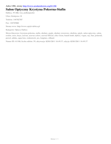 Adres URL strony http://www.urodaizdrowie.org/61180 Salon Optyczny Krystyna Pokorna-Stafin Dębica, 39-200, woj. podkarpackie Ulica: Kolejowa 18 Telefon: 146702707 Fax: 146765001 Strona www: http://www.optyk-debica.pl Kategorie: Optycy Dębica Słowa kluczowe: krystyna pokorna, stafin, okulary, gogle, okulary rowerowe, okulista, optyk, salon optyczny, salon, essilor, zeiss, hoya, acuvue, acuvue colors, acuvue bifocal, ciba vision, baush lomb, dębica, vogue, ray, ban, polaroid, persol, adidas, aqua lens, rodenstock, jzo, longines, silhuett Numer ID: 61180, liczba odsłon: 59, aktywacja: 02/01/2011 16:49:37, edycja: 02/01/2011 16:49:37 Strona 1 / 1