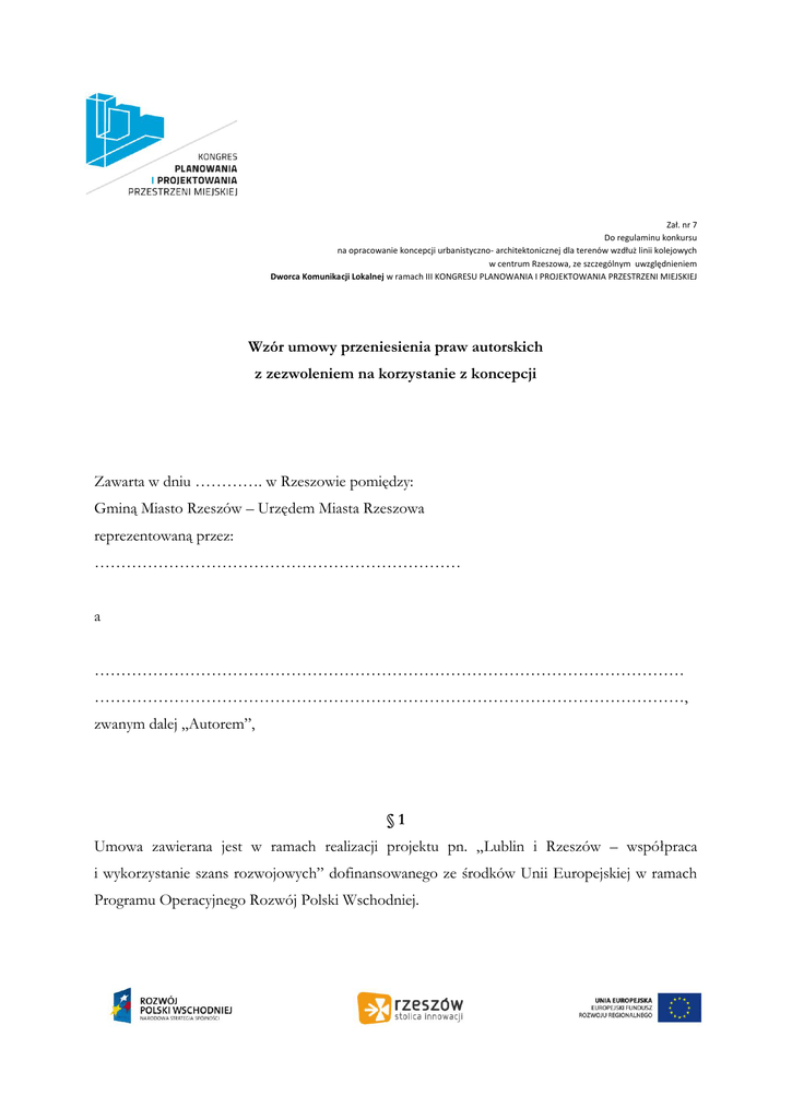 Zał. nr 7 Do regulaminu konkursu na opracowanie koncepcji urbanistyczno- architektonicznej dla terenów wzdłuż linii kolejowych w centrum Rzeszowa, ze szczególnym uwzględnieniem Dworca Komunikacji Lokalnej w ramach III KONGRESU PLANOWANIA I PROJEKTOWANIA PRZESTRZENI MIEJSKIEJ Wzór umowy przeniesienia praw autorskich z zezwoleniem na korzystanie z koncepcji Zawarta w dniu …………. w Rzeszowie pomiędzy: Gminą Miasto Rzeszów – Urzędem Miasta Rzeszowa reprezentowaną przez: …………………………………………………………… a ………………………………………………………………………………………………… …………………………………………………………………………………………………, zwanym dalej „Autorem”, §1 Umowa zawierana jest w ramach realizacji projektu pn. „Lublin i Rzeszów – współpraca i wykorzystanie szans rozwojowych” dofinansowanego ze środków Unii Europejskiej w ramach Programu Operacyjnego Rozwój Polski Wschodniej. §2 Autor oświadcza, że jest twórcą koncepcji urbanistyczno-architektonicznej dla terenów wzdłuż linii kolejowych w centrum Rzeszowa, ze szczególnym uwzględnieniem Dworca Komunikacji Lokalnej zgłoszonej do konkursu w ramach „III Kongresu Planowania i Projektowania Przestrzeni Miejskiej – Rzeszów 2014” – zwanej w dalszej części umowy „dziełem” oraz zapewnia, że przysługuje mu nieograniczone prawo majątkowe do dzieła i że dzieło stanowiące przedmiot umowy nie narusza praw autorskich osób trzecich. §3 1. Na mocy niniejszej umowy, Autor przenosi odpłatnie na Gminę Miasto Rzeszów autorskie prawa majątkowe do dzieła na polach eksploatacji dostępnych w dniu podpisania umowy oraz w czasie późniejszym nieograniczonym, bez względu na formę, układ i czas w szczególności zakresie: 1) publicznej prezentacji na wystawach, w środkach masowego przekazu, w publikacjach i materiałach informacyjnych, reklamowych i promocyjnych Gminy Miasto Rzeszów, w całości lub w dowolnie wybranej części, 2) publicznego udostępniania utworu w taki sposób, aby każdy mógł mieć do niego dostęp w miejscu i w czasie przez siebie wybranym w szczególności w Internecie, 3) w zakresie utrwalania i zwielokrotniania dzieła, w celu wykorzystania go w całości lub w części do realizacji zadań związanych z planowaniem przestrzennym, 4) użytkowania opracowania na własny użytek, dla potrzeb ustawowych i statutowych zadań Gminy Miasto Rzeszów, w tym w szczególności przekazać opracowania lub ich dowolny element a także ich kopie: a) Wykonawcom biorącym udział w postępowaniu o udzielenie zamówień publicznych, jako część specyfikacji warunków zamówienia, b) Stronom trzecim biorącym udział w procesie inwestycyjnym, 5) wprowadzania opracowania lub ich elementy do pamięci komputera na dowolnej liczbie własnych stanowisk komputerowych, 6) zwielokrotniania opracowania lub ich elementy dowolną techniką. 2. Za przeniesienie praw autorskich do dzieła Autor otrzyma wynagrodzenie w wysokości ……………. zł brutto (słownie: …… złotych 00/100 brutto). Wypłata wynagrodzenia nastąpi w formie bezgotówkowej, przelewem na konto wskazane w rachunku bądź fakturze w terminie do14 dni od dostarczenia do siedziby organizatora prawidłowo wystawionego rachunku bądź faktury (ze środków Dz. 921, rozdz. 92195, par. 6067 i par. 6069). 3. Autor wyraża zgodę dla Gminy Miasto Rzeszów na wykonanie dokumentacji projektowej na podstawie koncepcji i udostępnienia koncepcji osobom trzecim, w szczególności stronom postępowań administracyjnych. 4. Przeniesienie praw dotyczy dzieła w stanie w jakim znajduje się w dniu przeniesienia oraz w każdym następnym dniu włącznie z dokonywanymi przez Autora zmianami, poprawkami, rozbudową, uzupełnieniami i modyfikacjami. §4 Strony postanawiają, że wszelkie publikacje dzieła zawierać będą informację o autorze dzieła i okolicznościach jego powstania. §5 Umowa niniejsza zostaje zawarta w formie pisemnej pod rygorem nieważności. Zmiany i uzupełnienia umowy muszą być dokonywane za zgodą stron na piśmie. §6 Do spraw nieuregulowanych w niniejszej umowie, a dotyczących jej przedmiotu, mają zastosowanie przepisy ustawy z dnia 4 lutego 1994 r. o prawie autorskim i prawach pokrewnych (Dz. U. 2006 r. Nr 90 poz. 631 z późn. zm.), a także przepisy kodeksu cywilnego. §7 Spory wynikłe w związku z realizacją powyższej umowy zostaną one poddane pod rozstrzygnięcie sądowi w Rzeszowie. §8 Umowa została sporządzona w dwóch jednobrzmiących egzemplarzach, po jednym dla każdej ze stron. Autor Gmina Miasto Rzeszów