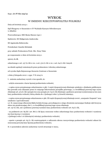 Sygn. akt IV Ka 123/13 WYROK W IMIENIU RZECZYPOSPOLITEJ POLSKIEJ Dnia 26 kwietnia 2013 r. Sąd Okręgowy w Szczecinie w IV Wydziale Karnym Odwoławczym w składzie: Przewodnicząca: SSO Beata Marzec (spr.) Sędziowie: SO Małgorzata Jankowska SO Agnieszka Bobrowska Protokolant: Kamila Michalak przy udziale Prokuratora Prok. Okr. Ilony Talar po rozpoznaniu w dniu 26 kwietnia 2013 r. sprawy A. K. oskarżonego z art. 157 § 2 kk w zw. z art. 57a § 1 kk w zw. z art. 64 § 1 kk i innych na skutek apelacji wniesionych przez prokuratora i obrońcę oskarżonego od wyroku Sądu Rejonowego Szczecin-Centrum w Szczecinie z dnia 5 listopada 2012 r. sygn. V K 1204/11 I. zmienia zaskarżony wyrok w ten sposób, że: - uchyla orzeczenie o karze łącznej pozbawienia wolności, - z opisu czynu przypisanego oskarżonemu w pkt. I części dyspozytywnej eliminuje ustalenie o działaniu publicznym bez powodu oraz okazaniu przez to rażącego lekceważenia porządku prawnego, a z kwalifikacji prawnej tego czynu eliminuje art. 57a § 1 kk i przepis ten oraz przepis art. 64 § 1 kk eliminuje z podstawy prawnej wymierzonej za ten czyn kary pozbawienia wolności, którą obniża do 1 (jednego) roku i 3 (trzech) miesięcy, - z opisu czynu przypisanego oskarżonemu w pkt. III części dyspozytywnej eliminuje zwrot: „szarpanie i kopanie” oraz ustalenie o spowodowaniu u J. K. masywnego stłuczenia kłębu kciuka lewego, powodującym u niego obrażenia naruszające funkcje ręki lewej na okres nie przekraczający dni 7, a z kwalifikacji prawnej tego czynu eliminuje art. 157 § 2 kk, zaś z podstawy prawnej wymiaru kary pozbawienia wolności art. 64 § 1 kk, - na podstawie art. 85 kk i art. 86 § 1 kk łączy orzeczone wobec oskarżonego kary pozbawienia wolności i wymierza mu karę łączną w wymiarze 1 (jednego) roku i 10 (dziesięciu) miesięcy pozbawienia wolności, - oparte o przepis art. 63 § 1 kk rozstrzygnięcie o zaliczeniu okresu rzeczywistego pozbawienia wolności odnosi do orzeczonej powyżej kary łącznej pozbawienia wolności, II. w pozostałym zakresie zaskarżony wyrok utrzymuje w mocy, III. zasądza od oskarżonego na rzecz Skarbu Państwa wydatki za postępowanie odwoławcze i wymierza mu 300 (trzysta) złotych opłaty za obie instancje. Sygn. akt IV Ka 123/13 UZASADNIENIE Sąd Rejonowy Szczecin-Centrum w Szczecinie wyrokiem z dnia 05 listopada 2012r. (sygn. akt V K 1204/11) uznał oskarżonego A. K. za winnego tego, że: - w dniu 21 października 2009r. w S., na pl. (...), działając publicznie i bez powodu, będąc uprzednio karanym wyrokiem łącznym Sądu Okręgowego w Jeleniej Górze z dnia 17 października 2003r., sygn. akt III K 123/03, zmienionego następnie wyrokiem sądu Apelacyjnego we Wrocławiu z dnia 12 lutego 2004r., sygn. akt IIAKa 10/04, za przestępstwo z art. 279 § 1 kk w zw. z art. 12 kk i art. 64 § 1 kk i za przestępstwo z art. 13 § 1 kk w zw. z art. 282 kk, popełnione z groźbą użycia przemocy, na karę łączną 5 lat i 6 miesięcy pozbawienia wolności, w tym obejmującą karę 3 lat i 3 miesięcy pozbawienia wolności na przestępstwo z art. 13 § 1 kk w zw. z art. 282 kk, którą to karę łączną odbywał w okresie 17.08.198r. do 19.08.1998r., od 9.09.1998r. do 10.09.1998r., oraz od 2.11.2000r. do 30.06.2005r., uderzył pięścią w twarz L. M., w wyniku czego powstał u niej siniec powiek prawego oka, co skutkowało naruszeniem czynności narządu jakim jest oko prawe, na okres nie dłuższy niż 7 dni, okazując przez to rażące lekceważenie porządku prawnego, tj. z art. 157 § 2 kk w zw. z art. 57a § 1 kk w zw. z art. 64 § 1 kk i za przestępstwo to, na podstawie art. 157 § 2 kk w zw. z art. 57a § 1 kk w zw. z art. 64 § 1 kk wymierzył mu karę 1 roku i 6 miesięcy pozbawienia wolności; - w dniu 21 października 2009r. w S., na pl. (...), będąc uprzednio karanym wyrokiem łącznym Sądu Okręgowego w Jeleniej Górze z dnia 17 października 2003r., sygn. akt III K 123/03, zmienionego następnie wyrokiem sądu Apelacyjnego we Wrocławiu z dnia 12 lutego 2004 r., sygn. akt IIAKa 10/04, za przestępstwo z art. 279 § 1 kk w zw. z art. 12 kk i art. 64 § 1 kk i za przestępstwo z art. 13 § 1 kk w zw. z art. 282 kk, popełnione z groźbą użycia przemocy, na karę łączną 5 lat i 6 miesięcy pozbawienia wolności, obejmującą karę 3 lat i 3 miesięcy pozbawienia wolności za przestępstwo z art. 13 § 1 kk w zw. z art. 282 kk, którą to karę łączną obywał w okresie 17.08.198r. do 19.08.1998r., od 9.09.1998r. do 10.09.1998r., oraz od 2.11.2000r. do 30.06.2005r., podczas i w związku z pełnieniem przez umundurowanych funkcjonariuszy policji J. K., A. S. (1) i P. S. obowiązków służbowych, znieważył ich słowami powszechnie uznanymi za obelżywe oraz naruszył nietykalność cielesną J. K. i P. S. poprzez ich uderzenie, szarpanie i kopanie, a nadto uderzył w dłoń J. K. w wyniku czego doznał on masywnego stłuczenia kłębu kciuka lewego, co spowodowało u niego obrażenia naruszając funkcję ręki lewej na okres nie przekraczający dni 7, przy czym stosując przemoc i groźbę pozbawienia wolności zmuszał wymienionych funkcjonariuszy policji do zaniechania przeprowadzenia prawnej czynności służbowej w postaci jego zatrzymania, tj. czynu z art. 226 § 1 kk w zb. z art. 222 § 1 kk w zb. z art. 157 § 2 kk w zb. z art. 224 § 2 kk w zw. z art. 11 § 2 kk w zw. z art. 64 § 1 kk i za przestępstwo to, na podstawie art. 224 § 2 kk w zw. z art. 11 § 3 kk w zw. z art. 64 § 1 kk, wymierzył mu karę 1 roku pozbawienia wolności. Zasądził od A. K. na rzecz L. M. kwotę 2000 tysięcy złotych wraz z ustawowymi odsetkami od dnia 12 sierpnia 2010r, tytułem zadośćuczynienia za doznaną krzywdę. Na podstawie art. 85 § 1 kk połączył orzeczone kary pozbawienia wolności i wymierzył karę łączną 2 lat pozbawienia wolności. Na podstawie art. 63 § 1 kk, na poczet orzeczonej kary zaliczył okres rzeczywistego pozbawienia w