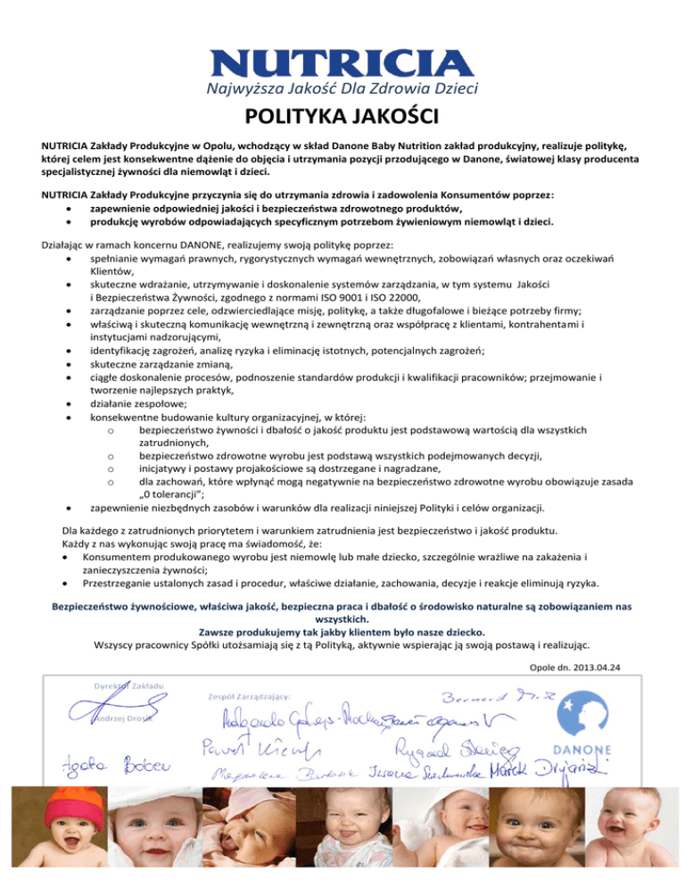 Najwyższa Jakość Dla Zdrowia Dzieci POLITYKA JAKOŚCI NUTRICIA Zakłady Produkcyjne w Opolu, wchodzący w skład Danone Baby Nutrition zakład produkcyjny, realizuje politykę, której celem jest konsekwentne dążenie do objęcia i utrzymania pozycji przodującego w Danone, światowej klasy producenta specjalistycznej żywności dla niemowląt i dzieci. NUTRICIA Zakłady Produkcyjne przyczynia się do utrzymania zdrowia i zadowolenia Konsumentów poprzez: zapewnienie odpowiedniej jakości i bezpieczeństwa zdrowotnego produktów, produkcję wyrobów odpowiadających specyficznym potrzebom żywieniowym niemowląt i dzieci. Działając w ramach koncernu DANONE, realizujemy swoją politykę poprzez: spełnianie wymagań prawnych, rygorystycznych wymagań wewnętrznych, zobowiązań własnych oraz oczekiwań Klientów, skuteczne wdrażanie, utrzymywanie i doskonalenie systemów zarządzania, w tym systemu Jakości i Bezpieczeństwa Żywności, zgodnego z normami ISO 9001 i ISO 22000, zarządzanie poprzez cele, odzwierciedlające misję, politykę, a także długofalowe i bieżące potrzeby firmy; właściwą i skuteczną komunikację wewnętrzną i zewnętrzną oraz współpracę z klientami, kontrahentami i instytucjami nadzorującymi, identyfikację zagrożeń, analizę ryzyka i eliminację istotnych, potencjalnych zagrożeń; skuteczne zarządzanie zmianą, ciągłe doskonalenie procesów, podnoszenie standardów produkcji i kwalifikacji pracowników; przejmowanie i tworzenie najlepszych praktyk, działanie zespołowe; konsekwentne budowanie kultury organizacyjnej, w której: o bezpieczeństwo żywności i dbałość o jakość produktu jest podstawową wartością dla wszystkich zatrudnionych, o bezpieczeństwo zdrowotne wyrobu jest podstawą wszystkich podejmowanych decyzji, o inicjatywy i postawy projakościowe są dostrzegane i nagradzane, o dla zachowań, które wpłynąć mogą negatywnie na bezpieczeństwo zdrowotne wyrobu obowiązuje zasada „0 tolerancji”; zapewnienie niezbędnych zasobów i warunków dla realizacji niniejszej Polityki i celów organizacji. Dla każdego z zatrudnionych priorytetem i warunkiem zatrudnienia jest bezpieczeństwo i jakość produktu. Każdy z nas wykonując swoją pracę ma świadomość, że: Konsumentem produkowanego wyrobu jest niemowlę lub małe dziecko, szczególnie wrażliwe na zakażenia i zanieczyszczenia żywności; Przestrzeganie ustalonych zasad i procedur, właściwe działanie, zachowania, decyzje i reakcje eliminują ryzyka. Bezpieczeństwo żywnościowe, właściwa jakość, bezpieczna praca i dbałość o środowisko naturalne są zobowiązaniem nas wszystkich. Zawsze produkujemy tak jakby klientem było nasze dziecko. Wszyscy pracownicy Spółki utożsamiają się z tą Polityką, aktywnie wspierając ją swoją postawą i realizując. Opole dn. 2013.04.24