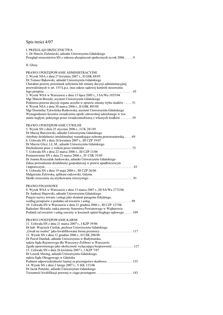 Spis treści 4/07 I. PRZEGLĄD ORZECZNICTWA 1. Dr Marcin Zieleniecki, adiunkt Uniwersytetu Gdańskiego Przegląd orzecznictwa SN z zakresu ubezpieczeń społecznych za rok 2006 . . . . . 9 II. Glosy PRAWO I POSTĘPOWANIE ADMINISTRACYJNE 2. Wyrok NSA z dnia 27 kwietnia 2007 r., II GSK 68/05 Dr Tomasz Bąkowski, adiunkt Uniwersytetu Gdańskiego Charakter prawny przesłanek uchylenia lub zmiany decyzji administracyjnej przewidzianych w art. 155 k.p.a. oraz zakres sądowej kontroli stosowania tego przepisu . . . . . . . . . . . . . . . . . . . . . . . . . . . . . . . . . . . . . . . . . . . . . . . . . . . . . . 45 3. Wyrok WSA w Warszawie z dnia 13 lipca 2005 r., I SA/Wa 1035/04 Mgr Marcin Brzeski, asystent Uniwersytetu Gdańskiego Podstawa prawna decyzji organu uczelni w sprawie zmiany trybu studiów . . . . . 51 4. Wyrok NSA z dnia 30 marca 2006 r., II GSK 403/05 Mgr Dominika Tykwińska-Rutkowska, asystent Uniwersytetu Gdańskiego Wynagrodzenie kosztów świadczenia opieki zdrowotnej udzielonego w tzw. stanie nagłym, pokrytego przez świadczeniobiorcę z własnych środków . . . . . . . 59 PRAWO I POSTĘPOWANIE CYWILNE 5. Wyrok SN z dnia 25 stycznia 2006 r., I CK 281/05 Dr Maciej Barczewski, adiunkt Uniwersytetu Gdańskiego Atrybuty działalności intelektualnej warunkujące ochronę prawnoautorską. . . . . 69 6. Uchwała SN z dnia 26 kwietnia 2007 r., III CZP 19/07 Dr Marcin Glicz, LL.M., adiunkt Uniwersytetu Gdańskiego Dochodzenie praw z weksla przez remitenta . . . . . . . . . . . . . . . . . . . . . . . . . . . . . 75 7. Uchwała SN z dnia 22 marca 2006 r., III CZP 13/06 Postanowienie SN z dnia 23 marca 2006 r., IV CSK 35/05 Dr Joanna Kruczalak-Jankowska, adiunkt Uniwersytetu Gdańskiego Zakaz prowadzenia działalności gospodarczej w prawie upadłościowym i naprawczym . . . . . . . . . . . . . . . . . . . . . . . . . . . . . . . . . . . . . . . . . . . . . . . . . . . . . . 83 8. Uchwała SN z dnia 19 maja 2006 r., III CZP 26/06 Małgorzata śelewska, aplikant radcowski, Gdynia Skutki zrzeczenia się uŜytkowania wieczystego . . . . . . . . . . . . . . . . . . . . . . . . . . . 91 PRAWO FINANSOWE 9. Wyrok WSA w Warszawie z dnia 13 marca 2007 r., III SA/Wa 2772/06 Dr Andrzej Majewski, adiunkt Uniwersytetu Gdańskiego Pojęcie nazwy towaru i usługi jako element paragonu fiskalnego, według przepisów o podatku od towarów i usług . . . . . . . . . . . . . . . . . . . . . . . . . 99 10. Uchwała SN w Warszawie z dnia 21 grudnia 2006 r., III CZP 127/06 Radosław Skwarło, radca prawny Starostwa Powiatowego w Wejherowie Podatek od towarów i usług zawarty w kosztach opinii biegłego sądowego . . . . . 109 PRAWO I POSTĘPOWANIE KARNE 11. Uchwała SN z dnia 21 marca 2007 r., I KZP 39/06 Dr hab. Wojciech Cieślak, profesor Uniwersytetu Gdańskiego „Gwałt na osobie” jako kwalifikowana forma przemocy . . . . . . . . . . . . . . . . . . . . 117 12. Wyrok SN z dnia 12 grudnia 2006 r., II CSK 280/06 Dr Paweł Daniluk, adiunkt Uniwersytetu w Białymstoku, sędzia Sądu Rejonowego dla Warszawy-śoliborz w Warszawie Zgoda uprawnionego jako okoliczność wyłączająca bezprawność . . . . . . . . . . . . . 127 13. Uchwała SN z dnia 26 kwietnia 2007 r., I KZP 7/07 Dr Leszek Mering, adiunkt Uniwersytetu Gdańskiego, sędzia Sądu Okręgowego w Gdańsku Podmiot odpowiedzialności karnej za przestępstwo skarbowe. . . . . . . . . . . . . . . . 135 14. Wyrok SN z dnia 2 lutego 2007 r., V KK 133/06 Dr Jacek Potulski, adiunkt Uniwersytetu Gdańskiego ToŜsamość kwalifikacji prawnej w ciągu przestępstw . . . . . . . . . . . . . . . . . . . . . . 143 15. Uchwała SN z dnia 20 grudnia 2006 r., I KZP 29/06 Dr Krzysztof Woźniewski, adiunkt Uniwersytetu Gdańskiego Elektroniczne nośniki informacji w procesie karnym. . . . . . . . . . . . . . . . . . . . . . . 149 16. Wyrok SN z dnia 5 grudnia 2006 r., III KK 273/06 Dr Wojciech Zalewski, adiunkt Uniwersytetu Gdańskiego Skuteczna prohibicja narkotykowa, czyli o szczelności regulacji prawnokarnej w walce z narkomanią . . . . . . . . . . . . . . . . . . . . . . . . . . . . . . . . . . . . . . . . . . . . . . . 159 PRAWO PRACY I UBEZPIECZEŃ SPO£ECZNYCH 17. Wyrok SN z dnia 9 lutego 2006 r., II PK 159/05 Dr hab. Alina Wypych-śywicka, profesor Uniwersytetu Gdańskiego Ochrona stosunku pracy pracowników odwołanych ze stanowiska w wieku przedemerytalnym . . . . . . . . . . . . . . . . . . . . . . . . . . . . . . . . . . . . . . . . . . 171 18. Wyrok SN z dnia 15 lutego 2006 r., II PZP 13/05 Dr Monika Tomaszewska, adiunkt Uniwersytetu Gdańskiego Dopuszczalność wypowiedzenia stosunku pracy w czasie urlopu wychowawczego . . . . . . . . . . . . . . . . . . . . . . . . . . . . . . . . . . . . . . 177