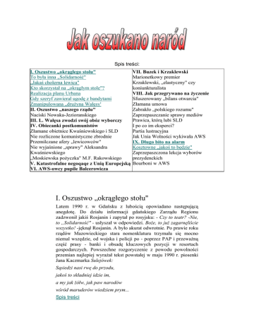 Spis treści: I. Oszustwo „okrągłego stołu" To była inna „Solidarność" „Jakaś cholerna lewica" Kto skorzystał na „okrągłym stole"? Realizacja planu Urbana Gdy szeryf zawierał ugodę z bandytami Zmanipulowana „drużyna Wałęsy' II. Oszustwo „naszego rządu" Naciski Nowaka-Jezioranskiego III. L. Wałęsa zwodzi swój obóz wyborczy IV. Obiecanki postkomunistów Złamane obietnice Kwaśniewskiego i SLD Nie rozliczone komunistyczne zbrodnie Przemilczane afery „lewicowców" Nie wyjaśnione „sprawy" Aleksandra Kwaśniewskiego „Moskiewska pożyczka" M.F. Rakowskiego V. Katastrofalne negoqaqe z Unią Europejską VI. AWS-owcy pupile Balcerowicza VII. Buzek i Krzaklewski Marionetkowy premier Krzaklewski, „elastyczny" czy koniunkturalista VIII. Jak przegrywano na życzenie Sfuszerowany „bilans otwarcia" Złamana umowa Zabrakło „polskiego rozumu" Zaprzepaszczanie sprawy mediów Prawica, którą lubi SLD I po co im eksperci? Partia lustracyjna Jak Unia Wolności wykiwała AWS IX. Długo bito na alarm Kosztowne „jakoś to będzie" Zaprzepaszczona lekcja wyborów prezydenckich Bourboni w AWS I. Oszustwo „okrągłego stołu" Latem 1990 r. w Gdańsku z lubością opowiadano następującą anegdotę. Do działu informacji gdańskiego Zarządu Regionu zadzwonił jakiś Rosjanin i zapytał po rosyjsku: - Czy to teatr? -Nie, to „Solidarność" - usłyszał w odpowiedzi. Boże, to już zagarnęliście wszystko! -jęknął Rosjanin. A było akurat odwrotnie. Po prawie roku rządów Mazowieckiego stara nomenklatura trzymała się mocno niemal wszędzie, od wojska i policji po - poprzez PAP i przeważną część prasy - banki i obsadę kluczowych pozycji w resortach gospodarczych. Powszechne rozgoryczenie z powodu powolności przemian najlepiej wyrażał tekst powstałej w maju 1990 r. piosenki Jana Kaczmarka Sulejówek: Sąsiedzi nasi rwę do przodu, jakoś to składniej idzie im, a my jak żółw, jak paw narodów wśród maruderów wiedziem prym... Spis treści To była inna „Solidarność" Dlaczego polskie zmiany dekomunizacyjne okazały się tak powolne i tak nikłe w odróżnieniu od sąsiedniej Czechosłowacji, pomimo że w Polsce przez lata była bez porównania większa niż w Czechach opozycja antykomunistyczna? Pomimo świetnej tradycji 16 miesięcy „Solidarności" w latach 1980-1981, które wstrząsnęły całym światem komunistycznym. I kolejne pytanie, dlaczego dziś „Solidarność" jako ruch tak mocno przygasła, i dla jakże wielu kojarzy się z czymś wielce nieudanym, zaprzepaszczonym, niefortunnym, spychanym na margines? Jak doszło do takiej kompromitacji „Solidarności" AD 2001? Aby to zrozumieć trzeba pamiętać o jednym fakcie zasadniczym. „Solidarność" lat 1980-1981 była czymś zupełnie innym niż ruch, na jakim oparł się „nasz rząd" Tadeusza Mazowieckiego w 1989 roku. I czymś zupełnie innym niż ruch, którego przedstawiciele przejęli ster rządu w 1997 roku pod firmą AWS-u. W sierpniu 1980 r. „Solidarność" była ruchem chrześcijańskopatriotycznym, którego główną siłę stanowili rozmodleni stoczniowcy w kaskach, strajkujący wśród furkotu biało-czerwonych chorągiewek. Stoczniowcy wiedzieli czego chcą i żadne namowy KOR-owskich doradców nie mogły skłonić ich do miarkowania żądań. Lewicowa opozycja laicka nie mogła zdobyć większego wpływu ani u nich, a ni u przeważającej części 10-milionowej „Solidarności" z 1981 roku. Na jej pierwszym zjeździe jesienią 1981 roku wyraźnie dominowały poglądy nurtu patriotycznego, „prawdziwych Polaków" jak zgryźliwie wspominali później ich kosmopolityczni KOR-owscy oponenci spod znaku Michnika, Kuronia, Borusewicza czy Celińskiego. Ku wzburzeniu całej warszawskiej lewicowej „elitki" jej największy guru - Bronisław Geremek fatalnie przegrał w wyborach na jesiennym zjeździe „S" w 1981 r. Nie zdołał wejść nawet do 100 osobowego składu Krajowej Komisji Solidarności. Adam Michnik z goryczą wspominał, że nie opublikował ani jednego tekstu na łamach tygodnika „Solidarność" w 1981 roku; nikt mu wówczas nawet nie zaproponował współpracy z tym głównym solidarnościowym periodykiem! W osiem lat później, w 1989 roku, wszystko niebywale się odmieniło. Geremek był głównym rozdającym karty w Obywatelskim Klubie Parlamentarnych. Ateista i kosmopolita Michnik był naczelnym redaktorem jedynej solidarnościowej gazety wydawanej w imieniu chrześcijańskich i patriotycznych mas solidarnościowych. Dawna opozycyjna lewica laicka przejęła różne kluczowe pozycje w środowiskach rozpoczynających budowę zrębów III Rzeczypospolitej i zdominowała tzw. „nasz rząd" Tadeusza Mazowieckiego. Patriotyczne i chrześcijańskie kręgi dawnej opozycji solidarnościowej zostały zmarginalizowane i zepchnięte w cień katolewicowych sojuszników byłych Korowców (głównie środowisk z „Tygodnika Powszechnego" i „Więzi"). Jak doszło do tak niebywałej ewolucji? Co umożliwiło przejęcie przez opozycyjną lewicę laicką rządu dusz w bastionach chrześcijańskiej i patriotycznej „Solidarności" w ciągu ośmiu lat rządów Jaruzelskiego? Kluczy do zrozumienia tej szokującej ewolucji trzeba szukać głównie w skutkach represji stanu wojennego i późniejszej wyrafinowanej polityki ludzi Jaruzelskiego, starannie promujących przeróżnymi środkami najbardziej odpowiadające ich interesom środowiska opozycyjne. Represje stanu wojennego i późniejszych lat rządów jaruzelszczyzny odegrały podstawową rolę w złamaniu kręgosłupa opozycji, wytrzebienia jej najbardziej odważnych i nonkonformistycznych przedstawicieli. W 1990 roku mówiono o około 100 postaciach „Solidarności" zamordowanych w okresie od grudnia 1981 roku; przypuszczalnie było ich znacznie więcej, choć prawie nic o tym nie wiemy. Tak jak prawie nikt nie pamięta o zamordowaniu już w kwietniu 1983 roku w sfingowanym wypadku samochodowym duchowego 
