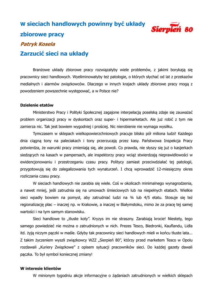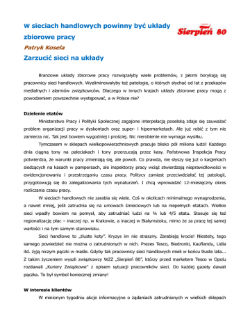 W sieciach handlowych powinny być układy zbiorowe pracy Patryk Kosela Zarzucić sieci na układy Branżowe układy zbiorowe pracy rozwiązałyby wiele problemów, z jakimi borykają się pracownicy sieci handlowych. Wyeliminowałyby też patologie, o których słychać od lat z przekazów medialnych i alarmów związkowców. Dlaczego w innych krajach układy zbiorowe pracy mogą z powodzeniem powszechnie występować, a w Polsce nie? Dzielenie etatów Ministerstwo Pracy i Polityki Społecznej zagajone interpelacją poselską zdaje się zauważać problem organizacji pracy w dyskontach oraz super- i hipermarketach. Ale już robić z tym nie zamierza nic. Tak jest bowiem wygodniej i prościej. Nic nierobienie nie wymaga wysiłku. Tymczasem w sklepach wielkopowierzchniowych pracuje blisko pół miliona ludzi! Każdego dnia ciągną tony na paleciakach i tony przerzucają przez kasy. Państwowa Inspekcja Pracy potwierdza, że warunki pracy zmieniają się, ale powoli. Co prawda, nie słyszy się już o kasjerkach siedzących na kasach w pampersach, ale inspektorzy pracy wciąż stwierdzają nieprawidłowości w ewidencjonowaniu i przestrzeganiu czasu pracy. Politycy zamiast przeciwdziałać tej patologii, przygotowują się do zalegalizowania tych wynaturzeń. I chcą wprowadzić 12-miesięczny okres rozliczania czasu pracy. W sieciach handlowych nie zarabia się wiele. Coś w okolicach minimalnego wynagrodzenia, a nawet mniej, jeśli zatrudnia się na umowach śmieciowych lub na niepełnych etatach. Wielkie sieci wpadły bowiem na pomysł, aby zatrudniać ludzi na ¾ lub 4/5 etatu. Stosuje się też regionalizację płac – inaczej np. w Krakowie, a inaczej w Białymstoku, mimo że za pracę tej samej wartości i na tym samym stanowisku. Sieci handlowe to „tłuste koty”. Kryzys im nie straszny. Zarabiają krocie! Niestety, tego samego powiedzieć nie można o zatrudnionych w nich. Prezes Tesco, Biedronki, Kauflandu, Lidla itd. żyją niczym pączki w maśle. Gdyby tak pracownicy sieci handlowych mieli w końcu tłuste lata... Z takim życzeniem wyszli związkowcy WZZ „Sierpień 80”, którzy przed marketem Tesco w Opolu rozdawali „Kuriery Związkowe” z opisem sytuacji pracowników sieci. Do każdej gazety dawali pączka. To był symbol koniecznej zmiany! W interesie klientów W minionym tygodniu akcje informacyjne o żądaniach zatrudnionych w wielkich sklepach zostały przeprowadzone właśnie w Opolu i w Sosnowcu. W bieżącym tygodniu są kolejne miasta. Klienci marketów popierają walkę o poprawę warunków pracy i płacy. Tłumaczymy im ponadto, że działania w tym kierunku są także w ich interesie. Nikt bowiem nie lubi stać w kolejkach do kas czy przeszukiwać źle zaopatrzone półki z towarem. Nie może być inaczej, gdy sieci, tłumacząc się oszczędnościami, przetrzebiają personel. Czyżby zatem znana w handlu zasada „klient nasz pan” odeszła do lamusa?! Nie jest rozwiązaniem wprowadzenie kas samoobsługowych. Do nich sceptycznie podchodzą osoby starsze. Zresztą nawet kasując się w automatach, potrzebna jest obecności pracownika, by zdjął zabezpieczenia antykradzieżowe. Maszyny często nie przyjmują danych banknotów czy monet. Nie jest rozwiązaniem wprowadzenie godzinowych norm tempa skanowania. Kasjerka musi kasować niczym robot, bardzo szybko i automatycznie. Ale to powoduje problemy. Zakupy klientów się mieszkają. Tego, który już zapłacił i pakuje swój towar z tym, którego produkty są dopiero kasowane. Nie jest rozwiązaniem tzw. multiskilling, a więc w przypadku kolejek do kas, wzywanie do ich obsługi pracowników innych działów. Bo wtedy nie ma kto wyłożyć towaru z palet na półki. Rozwiązaniem jest tylko zwiększenie ilości zatrudnienia w sieciówkach. Optymalizacja zatrudnienia do potrzeb klientów. Jeśli menedżerowie sieci handlowych nie pojmą tego, że pracownicy są bardzo opłacalną inwestycją, to stracą. Klienci odejdą do tych sklepów i firm handlowych, gdzie mniejsze są kolejki. Bo promocje promocjami, ale dziś czas to pieniądz. Nie ma co tracić ani czasu, ani pieniędzy tkwiąc w kolejkach przypominających czasy minionej epoki. Władysław Kosiniak-Kamysz, minister pracy wiele razy w mediach stwierdzał, że rząd będzie „tworzył nowe miejsca pracy” i „walczył o każde miejsca pracy”. Wskazujemy szefowi resortu pracy miejsca, od których trzeba zacząć. To wielkie sieci handlowe, gdzie dziś pracuje zbyt mała liczba ludzi. Niech zacznie działać! Związki razem 25 stycznia wszystkie pięć związków zawodowych działających w sieci Tesco Polska: WZZ „Sierpień 80”, NSZZ „Solidarność”, NSZZ „Solidarność 80”, OPZZ „Konfederacja Pracy” i ZZ Pracowników Handlu wystąpiły do pracodawcy z sześcioma żądaniami. Pierwsze dotyczy podwyżek płac o 10% dla pracowników podstawowych i liderów we wszystkich grupach płacowych i o 5% dla kierowników. Kolejny postulat to zniesienie regionalizacji płac (za pracę tej samej wartości i na tym samym stanowisku w Tesco inną pensję dostaje się np. w woj. śląskim, a inną w małopolskim czy mazowieckim). Trzecie żądanie to wzrost o 100% ekwiwalentu za pranie odzieży roboczej. Dalej jest zmniejszenie normy skanowania produktów na kasie z obecnych 1500 do 1200 produktów na godzinę. Punkt piąty to zmniejszenie transakcji z udziałem Club Card z 60% do 40%. Ostatni postulat dotyczy zwiększenia odpisu na Zakładowy Fundusz Świadczeń Socjalnych. Związkowcy pytani o możliwość zorganizowania protestów czy też strajku odpowiadają, że liczą na porozumienie z zarządem Tesco i spełnienie ich żądań, które wychodzą naprzeciw oczekiwaniom nie tylko pracowników, ale i klientów. Co będzie w przypadku braku porozumienia? Możliwe są akcje protestacyjne, a nawet strajkowe. 20 lutego minie piąta rocznica pierwszego w Polsce strajku w hipermarkecie. Miało to miejsce w Tesco w Tychach. Na jego czele stanę