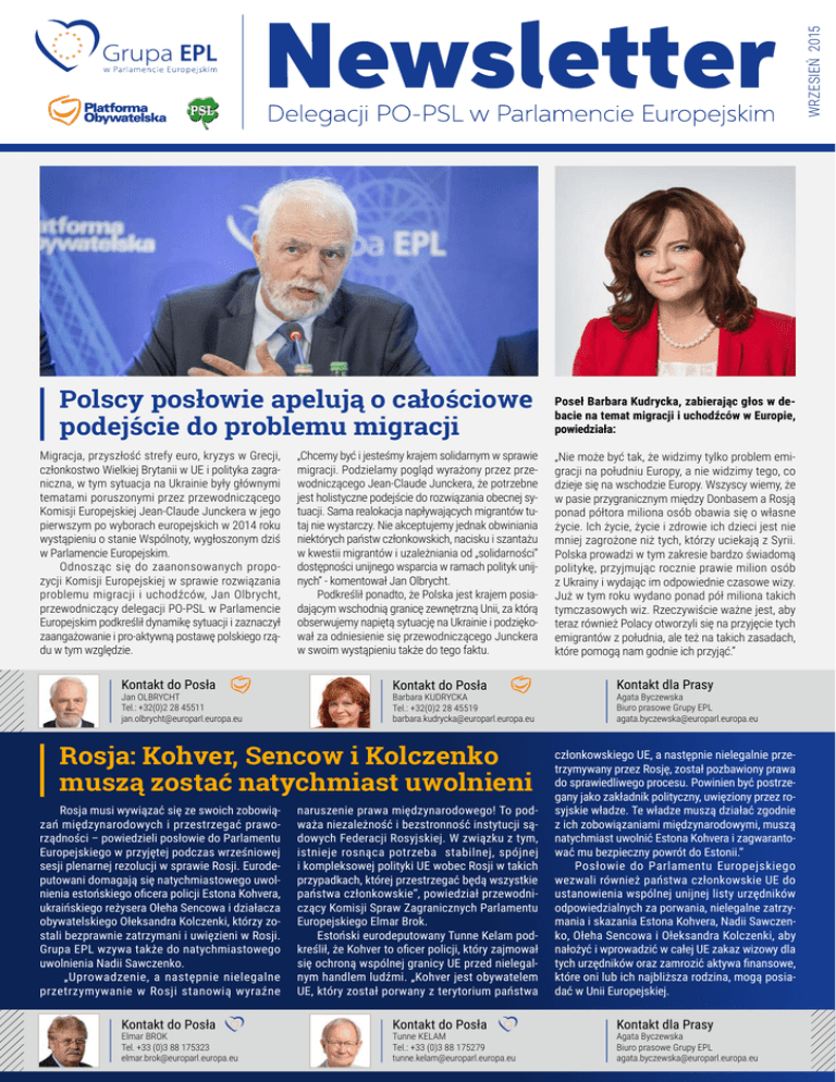 WRZESIEŃ 2015 Polscy posłowie apelują o całościowe podejście do problemu migracji Migracja, przyszłość strefy euro, kryzys w Grecji, członkostwo Wielkiej Brytanii w UE i polityka zagraniczna, w tym sytuacja na Ukrainie były głównymi tematami poruszonymi przez przewodniczącego Komisji Europejskiej Jean-Claude Junckera w jego pierwszym po wyborach europejskich w 2014 roku wystąpieniu o stanie Wspólnoty, wygłoszonym dziś w Parlamencie Europejskim. Odnosząc się do zaanonsowanych propozycji Komisji Europejskiej w sprawie rozwiązania problemu migracji i uchodźców, Jan Olbrycht, przewodniczący delegacji PO-PSL w Parlamencie Europejskim podkreślił dynamikę sytuacji i zaznaczył zaangażowanie i pro-aktywną postawę polskiego rządu w tym względzie. Kontakt do Posła Jan OLBRYCHT Tel.: +32(0)2 28 45511 [email protected] „Chcemy być i jesteśmy krajem solidarnym w sprawie migracji. Podzielamy pogląd wyrażony przez przewodniczącego Jean-Claude Junckera, że potrzebne jest holistyczne podejście do rozwiązania obecnej sytuacji. Sama realokacja napływających migrantów tutaj nie wystarczy. Nie akceptujemy jednak obwiniania niektórych państw członkowskich, nacisku i szantażu w kwestii migrantów i uzależniania od „solidarności” dostępności unijnego wsparcia w ramach polityk unijnych” - komentował Jan Olbrycht. Podkreślił ponadto, że Polska jest krajem posiadającym wschodnią granicę zewnętrzną Unii, za którą obserwujemy napiętą sytuację na Ukrainie i podziękował za odniesienie się przewodniczącego Junckera w swoim wystąpieniu także do tego faktu. Kontakt do Posła Barbara KUDRYCKA Tel.: +32(0)2 28 45519 [email protected] Rosja: Kohver, Sencow i Kolczenko muszą zostać natychmiast uwolnieni Rosja musi wywiązać się ze swoich zobowiązań międzynarodowych i przestrzegać praworządności – powiedzieli posłowie do Parlamentu Europejskiego w przyjętej podczas wrześniowej sesji plenarnej rezolucji w sprawie Rosji. Eurodeputowani domagają się natychmiastowego uwolnienia estońskiego oficera policji Estona Kohvera, ukraińskiego reżysera Ołeha Sencowa i działacza obywatelskiego Ołeksandra Kolczenki, którzy zostali bezprawnie zatrzymani i uwięzieni w Rosji. Grupa EPL wzywa także do natychmiastowego uwolnienia Nadii Sawczenko. „Uprowadzenie, a następnie nielegalne przetrzymywanie w Rosji stanowią wyraźne Kontakt do Posła Elmar BROK Tel. +33 (0)3 88 175323 [email protected] naruszenie prawa międzynarodowego! To podważa niezależność i bezstronność instytucji sądowych Federacji Rosyjskiej. W związku z tym, istnieje rosnąca potrzeba stabilnej, spójnej i kompleksowej polityki UE wobec Rosji w takich przypadkach, której przestrzegać będą wszystkie państwa członkowskie”, powiedział przewodniczący Komisji Spraw Zagranicznych Parlamentu Europejskiego Elmar Brok. Estoński eurodeputowany Tunne Kelam podkreślił, że Kohver to oficer policji, który zajmował się ochroną wspólnej granicy UE przed nielegalnym handlem ludźmi. „Kohver jest obywatelem UE, który został porwany z terytorium państwa Kontakt do Posła Tunne KELAM Tel.: +33 (0)3 88 175279 [email protected] Poseł Barbara Kudrycka, zabierając głos w debacie na temat migracji i uchodźców w Europie, powiedziała: „Nie może być tak, że widzimy tylko problem emigracji na południu Europy, a nie widzimy tego, co dzieje się na wschodzie Europy. Wszyscy wiemy, że w pasie przygranicznym między Donbasem a Rosją ponad półtora miliona osób obawia się o własne życie. Ich życie, życie i zdrowie ich dzieci jest nie mniej zagrożone niż tych, którzy uciekają z Syrii. Polska prowadzi w tym zakresie bardzo świadomą politykę, przyjmując rocznie prawie milion osób z Ukrainy i wydając im odpowiednie czasowe wizy. Już w tym roku wydano ponad pół miliona takich tymczasowych wiz. Rzeczywiście ważne jest, aby teraz również Polacy otworzyli się na przyjęcie tych emigrantów z południa, ale też na takich zasadach, które pomogą nam godnie ich przyjąć.” Kontakt dla Prasy Agata Byczewska Biuro prasowe Grupy EPL [email protected] członkowskiego UE, a następnie nielegalnie przetrzymywany przez Rosję, został pozbawiony prawa do sprawiedliwego procesu. Powinien być postrzegany jako zakładnik polityczny, uwięziony przez rosyjskie władze. Te władze muszą działać zgodnie z ich zobowiązaniami międzynarodowymi, muszą natychmiast uwolnić Estona Kohvera i zagwarantować mu bezpieczny powrót do Estonii.” Posłowie do Parlamentu Europejskiego wezwali również państwa członkowskie UE do ustanowienia wspólnej unijnej listy urzędników odpowiedzialnych za porwania, nielegalne zatrzymania i skazania Estona Kohvera, Nadii Sawczenko, Ołeha Sencowa i Ołeksandra Kolczenki, aby nałożyć i wprowadzić w całej UE zakaz wizowy dla tych urzędników oraz zamrozić aktywa finansowe, które oni lub ich najbliższa rodzina, mogą posiadać w Unii Europejskiej. Kontakt dla Prasy Agata Byczewska Biuro prasowe Grupy EPL [email protected] Raport z sesji plenarnej Parlamentu Europejskiego 7-10 września 2015 r. Miejski wymiar polityki UE - Inwestycje na rzecz wzrostu gospodarczego i zatrudnienia Parlament Europejski przyjął sprawozdanie w sprawie miejskiego wymiaru polityki UE. Popiera w nim zaproponowane przez Komisję Europejską stworzenie agendy miejskiej, lecz idzie o krok dalej i nawołuje, by z czasem przekształciła się ona w politykę miejską UE. Jan Olbrycht Martwi mnie brak integracji działań Komisji w różnych wymiarach, np. w zakresie inicjatywy smart cities. Obserwuję również brak koordynacji różnych jej wydziałów. Rozwiązanie tej kwestii byłoby pierwszym krokiem we właściwym kierunku. Oczekuję, że prace nad agendą miejską doprowadzą z czasem do stworzenia unijnej polityki miejskiej, czyli polityki Unii wobec miast. Danuta Jazłowiecka autorka projektu opinii Komisji Zatrudnienia i Spraw So