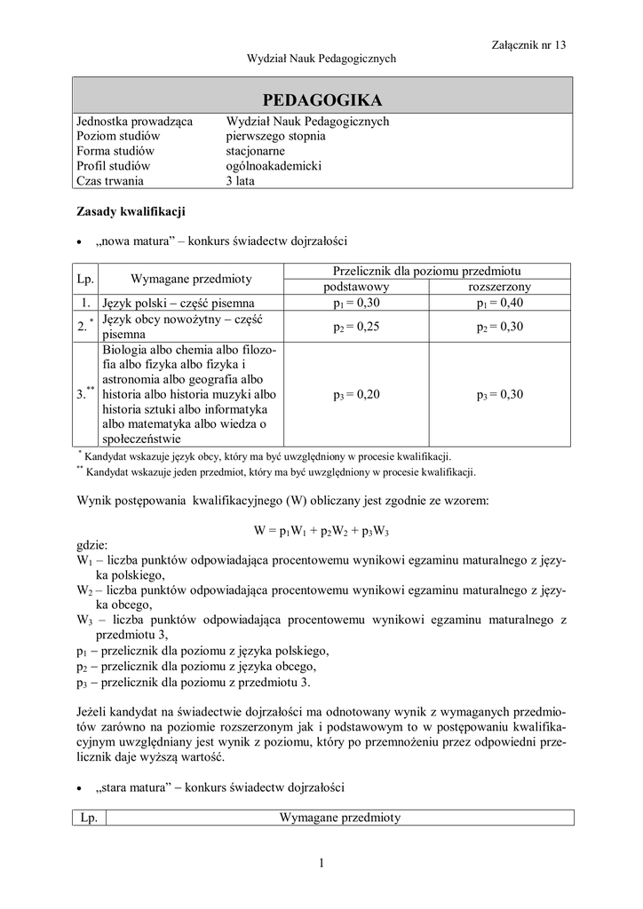 Załącznik nr 13 Wydział Nauk Pedagogicznych PEDAGOGIKA Jednostka prowadząca Poziom studiów Forma studiów Profil studiów Czas trwania Wydział Nauk Pedagogicznych pierwszego stopnia stacjonarne ogólnoakademicki 3 lata Zasady kwalifikacji „nowa matura” – konkurs świadectw dojrzałości Lp. Wymagane przedmioty 1. Język polski część pisemna Język obcy nowożytny część 2. * pisemna Biologia albo chemia albo filozofia albo fizyka albo fizyka i astronomia albo geografia albo ** 3. historia albo historia muzyki albo historia sztuki albo informatyka albo matematyka albo wiedza o społeczeństwie * ** Przelicznik dla poziomu przedmiotu podstawowy rozszerzony p1 = 0,30 p1 = 0,40 p2 = 0,25 p2 = 0,30 p3 = 0,20 p3 = 0,30 Kandydat wskazuje język obcy, który ma być uwzględniony w procesie kwalifikacji. Kandydat wskazuje jeden przedmiot, który ma być uwzględniony w procesie kwalifikacji. Wynik postępowania kwalifikacyjnego (W) obliczany jest zgodnie ze wzorem: W = p1W1 + p2W2 + p3W3 gdzie: W1 – liczba punktów odpowiadająca procentowemu wynikowi egzaminu maturalnego z języka polskiego, W2 – liczba punktów odpowiadająca procentowemu wynikowi egzaminu maturalnego z języka obcego, W3 – liczba punktów odpowiadająca procentowemu wynikowi egzaminu maturalnego z przedmiotu 3, p1 przelicznik dla poziomu z języka polskiego, p2 przelicznik dla poziomu z języka obcego, p3 przelicznik dla poziomu z przedmiotu 3. Jeżeli kandydat na świadectwie dojrzałości ma odnotowany wynik z wymaganych przedmiotów zarówno na poziomie rozszerzonym jak i podstawowym to w postępowaniu kwalifikacyjnym uwzględniany jest wynik z poziomu, który po przemnożeniu przez odpowiedni przelicznik daje wyższą wartość. „stara matura” konkurs świadectw dojrzałości Lp. Wymagane przedmioty 1 Załącznik nr 13 Wydział Nauk Pedagogicznych 1. Język polski* *W przypadku dwóch różnych ocen na egzaminie dojrzałości (z egzaminu pisemnego i ustnego) kandydat wskazuje ocenę wyższą. Oceny z egzaminu dojrzałości przelicza się na punkty zgodnie z tabelą: Ocena (skala 1-6) Punkty za ocenę Ocena (skala 2-5) Punkty za ocenę dopuszczająca (2) dostateczna (3) dobra (4) bardzo dobra (5) celująca (6) 30 50 70 90 100 dostateczna (3) dobra (4) bardzo dobra (5) 40 75 100 PEDAGOGIKA Jednostka prowadząca Poziom studiów Forma studiów Profil studiów Czas trwania Wydział Nauk Pedagogicznych pierwszego stopnia niestacjonarne ogólnoakademicki 3 lata Zasady kwalifikacji „nowa matura” – konkurs świadectw dojrzałości Lp. Wymagane przedmioty 1. Język polski część pisemna Język obcy nowożytny część 2. * pisemna Biologia albo chemia albo filozofia albo fizyka albo fizyka i astronomia albo geografia albo 3.** historia albo historia muzyki albo historia sztuki albo informatyka albo matematyka albo wiedza o społeczeństwie * Przelicznik dla poziomu przedmiotu podstawowy rozszerzony p1 = 0,30 p1 = 0,40 p2 = 0,25 p2 = 0,30 p3 = 0,20 p3 = 0,30 Kandydat wskazuje język obcy, który ma być uwzględniony w procesie kwalifikacji. Kandydat wskazuje jeden przedmiot, który ma być uwzględniony w procesie kwalifikacji. ** Wynik postępowania kwalifikacyjnego (W) obliczany jest zgodnie ze wzorem: W = p1W1 + p2W2 + p3W3 gdzie: W1 – liczba punktów odpowiadająca procentowemu wynikowi egzaminu maturalnego z języka polskiego, 2 Załącznik nr 13 Wydział Nauk Pedagogicznych W2 – liczba punktów odpowiadająca procentowemu wynikowi egzaminu maturalnego z języka obcego, W3 – liczba punktów odpowiadająca procentowemu wynikowi egzaminu maturalnego z przedmiotu 3, p1 przelicznik dla poziomu z języka polskiego, p2 przelicznik dla poziomu z języka obcego, p3 przelicznik dla poziomu z przedmiotu 3. Jeżeli kandydat na świadectwie dojrzałości ma odnotowany wynik z wymaganych przedmiotów zarówno na poziomie rozszerzonym jak i podstawowym to w postępowaniu kwalifikacyjnym uwzględniany jest wynik z poziomu, który po przemnożeniu przez odpowiedni przelicznik daje wyższą wartość. „stara matura” – konkurs świadectw dojrzałości Lp. 1. Język polski* Wymagane przedmioty *W przypadku dwóch różnych ocen na egzaminie dojrzałości (z egzaminu pisemnego i ustnego) kandydat wskazuje ocenę wyższą. Oceny z egzaminu dojrzałości przelicza się na punkty zgodnie z tabelą: Ocena (skala 1-6) Punkty za ocenę Ocena (skala 2-5) Punkty za ocenę dopuszczająca (2) dostateczna (3) dobra (4) bardzo dobra (5) celująca (6) 30 50 70 90 100 dostateczna (3) dobra (4) bardzo dobra (5) 40 75 100 PEDAGOGIKA MEDIALNA Jednostka prowadząca Poziom studiów Forma studiów Profil studiów Czas trwania Wydział Nauk Pedagogicznych pierwszego stopnia stacjonarne ogólnoakademicki 3 lata Zasady kwalifikacji Lp. „nowa matura” – konkurs świadectw dojrzałości Wymagane przedmioty 1. Język polski część pisemna Język obcy nowożytny część 2. * pisemna Przelicznik dla poziomu przedmiotu podstawowy rozszerzony p1 = 0,30 p1 = 0,40 p2 = 0,25 3 p2 = 0,30 Załącznik nr 13 Wydział Nauk Pedagogicznych 3.** * ** Biologia albo chemia albo filozofia albo fizyka albo fizyka i astronomia albo geografia albo historia albo historia muzyki albo historia sztuki albo informatyka albo matematyka albo wiedza o społeczeństwie p3 = 0,20 p3 = 0,30 Kandydat wskazuje język obcy, który ma być uwzględniony w procesie kwalifikacji. Kandydat wskazuje jeden przedmiot, który ma być uwzględniony w procesie kwalifikacji. Wynik postępowania kwalifikacyjnego (W) obliczany jest zgodnie ze wzorem: W = p1W1 + p2W2 + p3W3 gdzie: W1 – liczba punktów odpowiadająca procentowemu wynikowi egzaminu maturalnego z języka polskiego, W2 – liczba punktów odpowiadająca procentowemu wynikowi egzaminu maturalnego z języka obcego, W3 – liczba punktów odpowiadająca procentowemu wynikowi egzaminu maturalnego z przedmiotu 3, p1 przelicznik dla poziomu z języka polskiego, p2 przelicznik dla poziomu z języka obcego, p