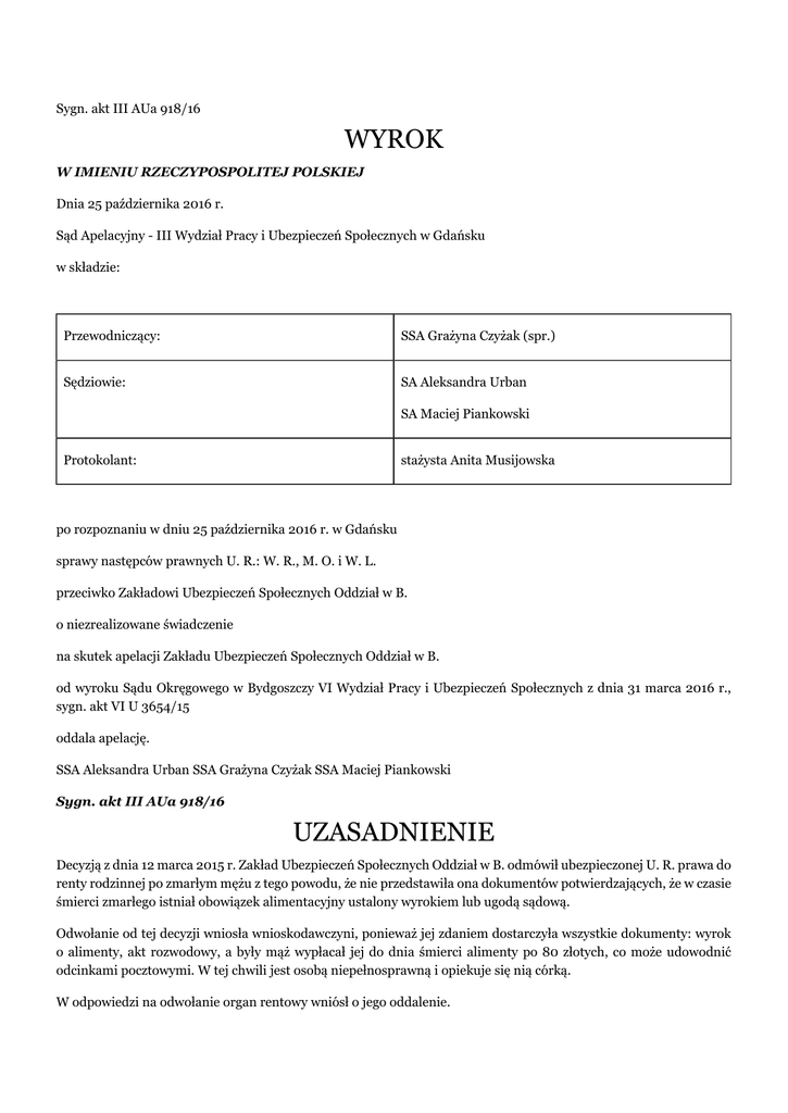 Sygn. akt III AUa 918/16 WYROK W IMIENIU RZECZYPOSPOLITEJ POLSKIEJ Dnia 25 października 2016 r. Sąd Apelacyjny - III Wydział Pracy i Ubezpieczeń Społecznych w Gdańsku w składzie: Przewodniczący: SSA Grażyna Czyżak (spr.) Sędziowie: SA Aleksandra Urban SA Maciej Piankowski Protokolant: stażysta Anita Musijowska po rozpoznaniu w dniu 25 października 2016 r. w Gdańsku sprawy następców prawnych U. R.: W. R., M. O. i W. L. przeciwko Zakładowi Ubezpieczeń Społecznych Oddział w B. o niezrealizowane świadczenie na skutek apelacji Zakładu Ubezpieczeń Społecznych Oddział w B. od wyroku Sądu Okręgowego w Bydgoszczy VI Wydział Pracy i Ubezpieczeń Społecznych z dnia 31 marca 2016 r., sygn. akt VI U 3654/15 oddala apelację. SSA Aleksandra Urban SSA Grażyna Czyżak SSA Maciej Piankowski Sygn. akt III AUa 918/16 UZASADNIENIE Decyzją z dnia 12 marca 2015 r. Zakład Ubezpieczeń Społecznych Oddział w B. odmówił ubezpieczonej U. R. prawa do renty rodzinnej po zmarłym mężu z tego powodu, że nie przedstawiła ona dokumentów potwierdzających, że w czasie śmierci zmarłego istniał obowiązek alimentacyjny ustalony wyrokiem lub ugodą sądową. Odwołanie od tej decyzji wniosła wnioskodawczyni, ponieważ jej zdaniem dostarczyła wszystkie dokumenty: wyrok o alimenty, akt rozwodowy, a były mąż wypłacał jej do dnia śmierci alimenty po 80 złotych, co może udowodnić odcinkami pocztowymi. W tej chwili jest osobą niepełnosprawną i opiekuje się nią córką. W odpowiedzi na odwołanie organ rentowy wniósł o jego oddalenie. Sąd Okręgowy w Bydgoszczy - VI Wydział Pracy i Ubezpieczeń Społecznych wyrokiem z dnia 31 marca 2016 r. w sprawie VI U 3654/15 zmienił zaskarżoną decyzję organu rentowego w ten sposób, że przyznał prawo do niezrealizowanego świadczenia, tj. renty rodzinnej należnego zmarłej U. R. za okres od 27 lutego 2015 r. do dnia 4 sierpnia 2015 r. W. R. (punkt pierwszy) oraz oddalił odwołanie względem pozostałych następców prawnych (punkt drugi). Podstawę tego rozstrzygnięcia stanowiły następujące ustalenia i rozważania Sądu pierwszej instancji. Po śmierci męża F. R. U. R. złożyła w dniu 27 lutego 2015 r. wniosek o przyznanie prawa do renty rodzinnej w myśl art. 70 ustawy z dnia 17 grudnia 1998 r. o emeryturach i rentach z Funduszu Ubezpieczeń Społecznych (t.j. Dz.U. z 2016 r., poz. 887 ze zm.). Przedmiotem badania było to, czy w dniu śmierci męża miała ona prawo do alimentów ustalonych ugodą sądową lub wyrokiem sądowym. W tej sytuacji Sąd Okręgowy rozpoczął postępowanie dowodowe, które zawiesił na skutek tego, że ubezpieczona zmarła w dniu 4 sierpnia 2015 r., a następnie podjął te postępowanie na wniosek złożony przez następców prawnych dzieci U. R.: W. L., M. O. i W. R. prowadził dalej postępowanie dowodowe. Wszystkie te osoby zeznawały w trakcie rozprawy, że alimenty były płacone przez F. R. do dnia jego śmierci, przy czym M. O. zeznała, że widziała nawet jak ojciec płacił alimenty tak długo, jak żył i listonosz przynosił te alimenty. Również potwierdziła to W. L.. Również W. R. stwierdziła, że do dnia śmierci matka przebywała z nią, było to wspólne gospodarstwo domowe również potwierdziła okoliczność płacenia alimentów przez zmarłego ojca po 80 zł miesięcznie. Także przedstawiono wyrok Sądu Rejonowego w Inowrocławiu z dnia 8 stycznia 1988 r., z którego wynikało, że zasądzono od F. R. na rzecz pozwanej U. R. alimenty po 7.000 złotych płatne z góry do dnia 10-go każdego miesiąca z 8 % zwłoki w razie płatności każdej z rat. Te alimenty ustalone wyrokiem Sądu Rejonowego w 1988 r., na skutek pozwu ponownie wniesionego przez U. R. zostały zmienione i zawarto wówczas ugodę, z której wynikało, że pozwany, czyli F. R. zobowiązuje się płacić na rzecz U. R. w miejsce alimentów zasądzonych właśnie wyrokiem Sądu Rejonowego alimenty w wysokości 20 procent jego renty inwalidzkiej z wyłączeniem dodatku pielęgnacyjnego i dodatku indeksacyjnego, przy czym płatne one były do dnia 10-go każdego miesiąca. Zdaniem Sądu wszystkie te dokumenty oraz zeznania świadków świadczą o tym, że zmarły F. R. płacił rozwiedzionej małżonce alimenty do dnia swojej śmierci, a zatem ubezpieczona spełniała wszystkie warunki wymienione w art. 70 ustawy emerytalnej. Pomimo, że była osobą rozwiedzioną to miała prawo do alimentów ze strony męża i wówczas przysługuje jej prawo do renty rodzinnej po zmarłym F. R.. Na skutek tego, że U. R. zmarła, do procesu wstąpili dzieci ubezpieczonej. Tylko te dzieci, które składały taki wniosek mogły wstąpić zgodnie z art. 136 ustawy emerytalnej. Sąd Okręgowy ocenił, że w tej sytuacji zaszła pierwsza przesłanka, a więc można było wypłacić należne świadczenie dzieciom, z którymi prowadziła wspólne gospodarstwo domowe, bo właśnie taką osobą była tylko W. R. i dlatego też Sąd przyznał prawo do niezrealizowanego świadczenia, a więc renty rodzinnej po zmarłej należnej jej do dnia śmierci tylko i wyłącznie W. R.. Stwierdzając, że skoro prowadziła wspólne gospodarstwo domowe razem z W. R. nie było potrzeby poszukiwania już dalszych następców prawnych, czego Sąd nie mógł wiedzieć, albowiem dopiero po przesłuchaniu wszystkich świadków się okazała ta okoliczność i w związku z tym oddalił odwołanie względem pozostałych następców prawnych uznając, iż renta rodzinna należy się tylko i wyłącznie W. R., dlatego też w punkcie pierwszym wyroku zmieniono decyzję zgodnie z art. 477 14 § 1 k.p.c., a w punkcie drugim oddalono względem pozostałych następców prawnych na podstawie artykułu 477 14 § 2 k.p.c. Apelację od wyroku wywiódł organ rentowy zaskarżając go w części, tj. co do punktu pierwszego i zarzucił: - naruszenie norm prawa materialnego - art. 70 ust. 3 w zw. z art. 136 ustawy z dnia 17 grudnia 1998 r. o emeryturach 