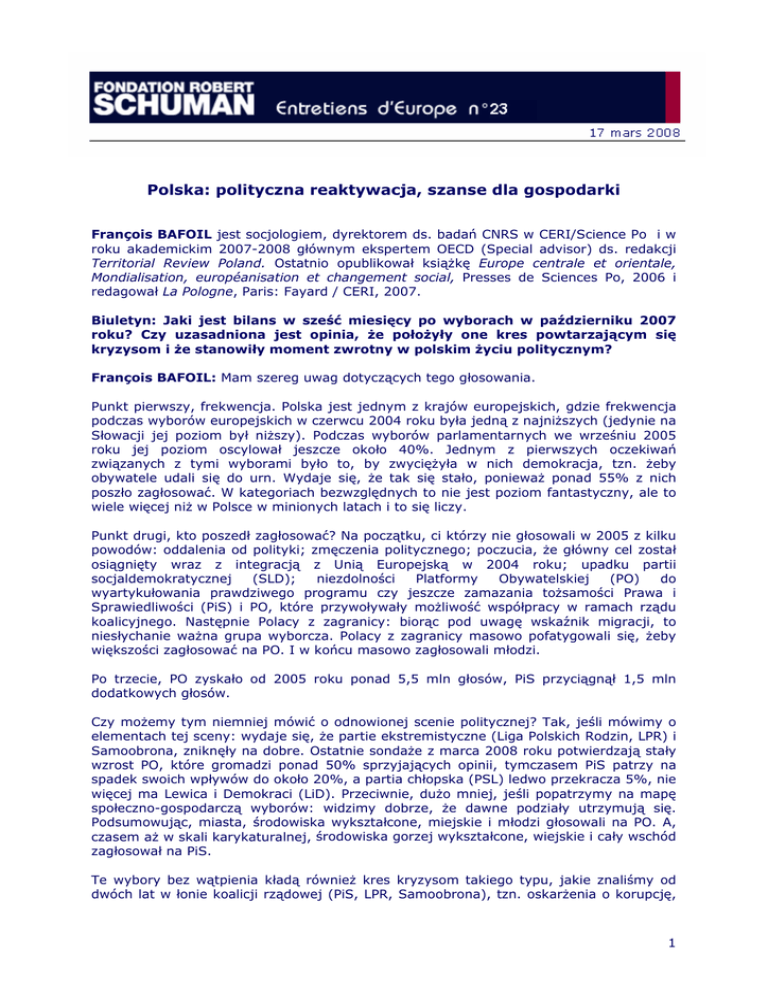 Polska: polityczna reaktywacja, szanse dla gospodarki François BAFOIL jest socjologiem, dyrektorem ds. badań CNRS w CERI/Science Po i w roku akademickim 2007-2008 głównym ekspertem OECD (Special advisor) ds. redakcji Territorial Review Poland. Ostatnio opublikował książkę Europe centrale et orientale, Mondialisation, européanisation et changement social, Presses de Sciences Po, 2006 i redagował La Pologne, Paris: Fayard / CERI, 2007. Biuletyn: Jaki jest bilans w sześć miesięcy po wyborach w październiku 2007 roku? Czy uzasadniona jest opinia, że położyły one kres powtarzającym się kryzysom i że stanowiły moment zwrotny w polskim życiu politycznym? François BAFOIL: Mam szereg uwag dotyczących tego głosowania. Punkt pierwszy, frekwencja. Polska jest jednym z krajów europejskich, gdzie frekwencja podczas wyborów europejskich w czerwcu 2004 roku była jedną z najniższych (jedynie na Słowacji jej poziom był niższy). Podczas wyborów parlamentarnych we wrześniu 2005 roku jej poziom oscylował jeszcze około 40%. Jednym z pierwszych oczekiwań związanych z tymi wyborami było to, by zwyciężyła w nich demokracja, tzn. żeby obywatele udali się do urn. Wydaje się, że tak się stało, ponieważ ponad 55% z nich poszło zagłosować. W kategoriach bezwzględnych to nie jest poziom fantastyczny, ale to wiele więcej niż w Polsce w minionych latach i to się liczy. Punkt drugi, kto poszedł zagłosować? Na początku, ci którzy nie głosowali w 2005 z kilku powodów: oddalenia od polityki; zmęczenia politycznego; poczucia, że główny cel został osiągnięty wraz z integracją z Unią Europejską w 2004 roku; upadku partii socjaldemokratycznej (SLD); niezdolności Platformy Obywatelskiej (PO) do wyartykułowania prawdziwego programu czy jeszcze zamazania tożsamości Prawa i Sprawiedliwości (PiS) i PO, które przywoływały możliwość współpracy w ramach rządu koalicyjnego. Następnie Polacy z zagranicy: biorąc pod uwagę wskaźnik migracji, to niesłychanie ważna grupa wyborcza. Polacy z zagranicy masowo pofatygowali się, żeby większości zagłosować na PO. I w końcu masowo zagłosowali młodzi. Po trzecie, PO zyskało od 2005 roku ponad 5,5 mln głosów, PiS przyciągnął 1,5 mln dodatkowych głosów. Czy możemy tym niemniej mówić o odnowionej scenie politycznej? Tak, jeśli mówimy o elementach tej sceny: wydaje się, że partie ekstremistyczne (Liga Polskich Rodzin, LPR) i Samoobrona, zniknęły na dobre. Ostatnie sondaże z marca 2008 roku potwierdzają stały wzrost PO, które gromadzi ponad 50% sprzyjających opinii, tymczasem PiS patrzy na spadek swoich wpływów do około 20%, a partia chłopska (PSL) ledwo przekracza 5%, nie więcej ma Lewica i Demokraci (LiD). Przeciwnie, dużo mniej, jeśli popatrzymy na mapę społeczno-gospodarczą wyborów: widzimy dobrze, że dawne podziały utrzymują się. Podsumowując, miasta, środowiska wykształcone, miejskie i młodzi głosowali na PO. A, czasem aż w skali karykaturalnej, środowiska gorzej wykształcone, wiejskie i cały wschód zagłosował na PiS. Te wybory bez wątpienia kładą również kres kryzysom takiego typu, jakie znaliśmy od dwóch lat w łonie koalicji rządowej (PiS, LPR, Samoobrona), tzn. oskarżenia o korupcję, 1 podejrzenia jednych wobec drugich, hegemoniczne chęci PiS wobec dwóch partnerów koalicyjnych. To bez wątpienia również koniec ataków na instytucje takie jak Trybunał Konstytucyjny, pragnień antykomunistycznego oczyszczenia jak ustawa lustracyjna. Przede wszystkim, wybory wyznaczają kres powtarzających się kryzysów z Unią Europejską i Niemcami z jednej strony, a Rosją z drugiej. Ostatecznie, dojście PO do władzy oznacza stabilność gry politycznej: w wymiarze wewnętrznym, biorąc pod uwagę polityczne pole manewru nowego premiera Donalda Tuska i przede wszystkich w sprawach zagranicznych, gdzie kierujemy się w stronę sytuacji dużo bardziej załagodzonej. Taka jest wola Donalda Tuska, który wyraził ją od razu, wraz z kanclerz Angelą Merkel, kilka dni po swoim wyborze. Wola potwierdzona, jakby tego było trzeba, przez nominację pana Bartoszewskiego na specjalnego doradcę i którego pierwszym zadaniem jest poprawienie relacji z Niemcami. W przypadku Rosji również chodzi o nawiązanie normalnych relacji. Jeśli chodzi o Unię Europejską Donald Tusk bardzo chce, żeby jego kraj wszedł do europejskiej gry. Odtąd Traktat z Lizbony jest akceptowany bez warunków Wszystkie te punkty są bardzo pozytywne. Jak wytłumaczyć utrzymywanie się tych podziałów w Polsce, pomimo masowej pomocy, zwłaszcza europejskiej, i raczej wysokiego poziomu wzrostu? Rzeczywiście, podział wschód-zachód w Polsce nie łagodnieje. Ale wszystkie regiony zyskujące od 2004, do których trzeba oczywiście dodać Warszawę, są położone na wschodzie. W tym temacie wypada raczej mówić o zyskujących miastach niż o zyskujących regionach. To jeden z paradoksów Polski. Od lat 90-tych do chwili obecnej mamy do czynienia z bardzo znaczącą polityką redystrybucji: rzędu 24-25% PKB na redystrybucję socjalną (tytułem porównania, wskaźnik ten jest rzędu 28-29% we Francji). Warto odnotować, że Donald Tusk, co ważne, nie podważył tej polityki; w jednej z pierwszych deklaracji potwierdził, że program 2 mld przyznanych 5 najbiedniejszym regionom (Warmii i Mazurom, Podlasiu, Podkarpaciu, woj. lubelskiemu i świętokrzyskiemu) zostanie utrzymany. Mamy w ten sposób homogenizację czy raczej redystrybucję całkiem godną zauważenia a jednocześnie, w tym samym czasie, stwierdzamy istnienie utrzymującej się nierównowagi: w rzeczywistości podwójnej nierównowagi miejsko/wiejskiej i wschód/zachód. Aby spróbować wytłumaczyć ten paradoks istotnej polityki redystrybucji i tych utrzymujących się nierówności trzeba rozumować nie na poziomie regionu (NUTS 3), ale na niższym poziomie, tego gmin lub miast (NUTS 2). Analiza pokazuje rzecz