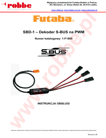 W Wyłączny przedstaw wiciel Futaaba-Robbe e w Polsce e, RC-Skorpion, ul. Nowy Świiat 38, 20-4 419 Lublin n, www.ro obbe.pl, www w.futaba.co om.pl, www.rrcskorpion.pl bb e. p l SBD D-1 – Deko oder S-BUS S S na P PWM ww w. ro Nu umer kattalogow wy: 1-F1 1695 INSTRU UKCJA OBSŁUG O GI ścicielem niniejszzej instrukcji jest ffirma RC‐Skorpioon (Robbe‐Polska)), zakaz kopiowan nia i rozpowszechhniania bez pisem mnej zgody autora a Strona 1 z 6 Wyłączny przedstawiciel Futaba-Robbe w Polsce, RC-Skorpion, ul. Nowy Świat 38, 20-419 Lublin, www.robbe.pl, www.futaba.com.pl, www.rcskorpion.pl Spistreści bb e. p l WSTĘP. ............................................................................................................................................................... 2 PODSTAWOWE ŚRODKI OSTROŻNOŚCI. ................................................................................................ 3 OPIS URZĄDZENIA I ZAWAROŚCI OPAKOWANIA. ................................................................................. 4 USTAWIANIE KANAŁÓW. ............................................................................................................................... 4 Zaprogramowanie numerów kanałów przy użyciu programatora SBC-1. ............................................. 4 UŻYCIE DEKODERA SBD-1. .......................................................................................................................... 5 Podłączenie. ................................................................................................................................................... 5 SPECYFIKACJA. ............................................................................................................................................... 6 INFORMACJE SERWISOWE. ......................................................................................................................... 6 w. ro Przed rozpoczęciem użytkowania dekodera S-BUS/PWM SBD-1, należy dokładnie przeczytać poniższą instrukcję, aby posługiwać się nim właściwie i bezpiecznie. Po przeczytaniu instrukcji, zachować ją w bezpiecznym miejscu. ww Żadna z części tej instrukcji nie może być powielana lub publikowana bez uprzedniej zgody. Zawartość instrukcji może ulec zmianie bez uprzedzenia. Instrukcja została dokładnie napisana. W przypadku nieścisłości bądź błędów, prosimy o kontakt z firmą Futaba-Robbe lub Robbe-Polska (RC-Skorpion). WSTĘP. Dziękujemy za zakup dekodera sygnału sterującego serwomechanizmami z S-BUS system (serial communication system FUTABA), na standardowy sygnał PWM dekodowalny dla standardowych serwomechanizmów zarówno cyfrowych jak i analogowych. Autorem i właścicielem niniejszej instrukcji jest firma RC‐Skorpion (Robbe‐Polska), zakaz kopiowania i rozpowszechniania bez pisemnej zgody autora Strona 2 z 6 W Wyłączny przedstaw wiciel Futaaba-Robbe e w Polsce e, RC-Skorpion, ul. Nowy Świiat 38, 20-4 419 Lublin n, www.ro obbe.pl, www w.futaba.co om.pl, www.rrcskorpion.pl bb e. p l PODSTAW WOWE ŚR RODKI OS STROŻNOŚ ŚCI. Znaki spe ecjalne: Należy zw wrócić szczzególną uw wagę na b bezpieczeń ństwo w cz zęściach innstrukcji oz znaczonycch poniższym mi symbola ami: ABRONIO ONE, ZA W WAŻNE! OBOWIĄZ ZKOWE, Niie podłączzać żadnyc ch urządzzeń (żyroskopu, bate erii itp.) in nnych niż se erwomech hanizmy do o złącza s serw dekodera SBD-1, poniew waż istniejje ryzyko błłędnego dzziałania lu ub uszkod dzenia urzą ądzenia. w. ro ekodera SBD-1, do żadnego ż iinnego po ortu niż Nie podłączzać złącza S-BUS de po ort S-BUS odbiornik ka, poniew waż istnieje ryzyko błędnego b działania lub us szkodzenia a urządzenia. O OSTRZEŻE ENIE! Za awsze nale eży starann nie wykona ać instalac cję w mode elach, urząddzenie i po ołączenia muszą być trwale zamocowane d do kadłuba a śmigłowc ca czy sam molotu. Nie owane urzą ądzenia i nie zabezpiieczone po ołączenia, mogą pod wpływem wibracji przymoco rozłączyć się co w efekcie e moż że doprow wadzić do utraty u kontrroli i upadkku modelu.. ww Firma FUT TABA Corp. Nie ponosi odpow wiedzialności za szkod dy wyrządzzone przez z niewłaściw we użytkow wanie urzą ądzeń jak rrównież kojjarzenia urrządzeń z iinnymi niż oryginalne e Futaba. Autorem i właścicielem niniejszzej instrukcji jest ffirma RC‐Skorpioon (Robbe‐Polska)), zakaz kopiowan nia i rozpowszechhniania bez pisem mnej zgody autora a Strona 3 z 6 Wyłączny przedstawiciel Futaba-Robbe w Polsce, RC-Skorpion, ul. Nowy Świat 38, 20-419 Lublin, www.robbe.pl, www.futaba.com.pl, www.rcskorpion.pl bb e. p l OPIS URZĄDZENIA I ZAWAROŚCI OPAKOWANIA. Dodatkowo w opakowaniu: naklejki z numerami kanałów (należy nakleić na gniazda serw w celu identyfikacji numeru zaprogramowanego kanału), naklejki ozdobne S-BUS Futaba-Robbe, instrukcja obsługi (właśnie ją czytasz), USTAWIANIE KANAŁÓW. w. ro Przed zainstalowaniem dekodera SBD-1 do kadłuba modelu, należy ustawić numery kanałów na każdym ze złącz (gniazd) serw (od SX-1 do SX-3). Zaprogramowanie kanałów można wykonać przy pomocy programatora kanałów urządzeń S-BUS, SBC-1 zgodnie z instrukcją programatora, lub przy pomocy komputera PC i adaptera USB CIU-2, oraz oprogramowania PC-Link. Zaprogramowanie numeru kanału dekodera SBD-1, nie jest możliwe przy pomocy odbiornika S-BUS R6108SB. Oprogramowanie PC-Link, jest dostępne do ściągnięcia na stronie www.robbe.pl, lub u lokalnego dystrybutora. Zaprogramowanie numerów kanałów przy użyciu programatora SBC-1. ww 1. Podłącz dekoder SBD-1 (złączem S-BUS) do gniazda w programatorze SBC-1. 2. Podłącz zasilanie (pakiet akumulatorów) do złącza baterii w programatorze SBC-1. *Dioda LED statusu będzie migać powoli (ok. 1 raz na sekundę). 3. Szybko wciśnij i puść przycisk programowania SW programatora SBC-1, i wybierz port serwa do ustawienia kanału. *Po każd