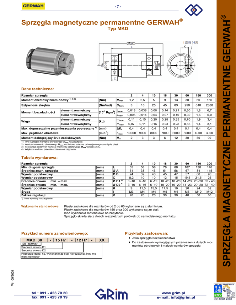 Sprzęgła magnetyczne permanentne GERWAH® Typ MKD Dane techniczne: Rozmiar sprzęgła Moment obrotowy znamionowy 1) 2) 3) Sztywność skrętna element zewnętrzny Moment bezwładności 10 18 30 60 150 300 1,2 2,5 5 9 13 30 60 150 (Nm/rad) CTdyn 3 10 25 45 83 250 610 2300 Jzew. 0,018 0,038 0,08 0,14 0,21 0,60 1,8 6,7 Jwew. 0,005 0,014 0,04 0,07 0,10 0,30 1,6 5,0 mzew. 0,11 0,15 0,20 0,28 0,35 0,70 1,9 3,4 mwew. 0,07 0,11 0,16 0,23 0,28 0,53 1,4 3,1 ΔKr 0,4 0,4 0,4 0,4 0,4 0,4 0,4 0,4 -3 element zewnętrzny 2 (kg) element wewnętrzny Max. dopuszczalne przemieszczenia poprzeczne 4 Mmax (10 Kgm ) element wewnętrzny Waga 2 (Nm) 4) (mm) -1 Max. prędkość obrotowa (min ) nmax 10000 9000 8000 7000 6000 5000 4000 3000 Moment dokręcający śrub zaciskowych (Nm) MA 2 3 3 6 12 30 50 90 2 55 31 24 8,2 3 -10 3 -10 9 M3 20 4 58 38 32 10 6 -16 6 -16 11,5 M4 20 1) 2) 3) 4) Inne wartości momentu obrotowego Mmax na zapytanie. Wartość momentu obrotowego Mmax jest liniowo zależna od wzajemnego zsunięcia piast. Tolerancja podanych wartości momentu obrotowego Mmax wynosi ± 5%. Większe wartości przemieszczenia na zapytanie. Tabela wymiarowa: Rozmiar sprzęgła Min. długość sprzęgła Średnica zewn. sprzęgła Wymiar podstawowy Wymiar podstawowy Średnica otworu min. – max. Średnica otworu min. – max. Wymiar podstawowy Śruba Zakres regulacji (mm) (mm) (mm) (mm) (mm) (mm) (mm) (mm) L ØA ØB C H7 Ø D1 H7 Ø D2 K I V 10 18 30 60 150 300 58 78 88 107 130 146 46 51 56 67 84 115 40 45 47 57 68 96 10 12 15 19,5 21,5 26 6 -19 10 -20 10 -20 14 -23 20 -28 32 - 40 6 -19 10 -20 10 -20 14 -23 20 -28 32 - 40 15,5 17,5 16 20 24 32 M4 M5 M6 M8 M10 M12 20 30 30 40 50 60 *) Inne wymiary na zapytanie. Wykonanie standardowe: Piasty zaciskowe dla rozmiarów od 2 do 60 wykonane są z aluminium. Piasty zaciskowe dla rozmiarów 150 oraz 300 wykonane są ze stali. Inne wykonania materiałowe na zapytanie. Sprzęgło składa się z dwóch niezależnych połówek do samodzielnego montażu. Przykład numeru zamówieniowego: MKD 30 - 15 H7 - 12 H7 - XX mentów obrotowych i małych wymiarów sprzęgła W1-09/2009 Typ i rozmiar Średnica otworu D1 Średnica otworu D2 Pozostałe dane, np. wykonanie ze stali nierdzewnej, inny moment obrotowy Przykłady zastosowań: Jako sprzęgło bezpieczeństwa Do zastosowań wymagających przenoszenia dużych mo- tel.: 091 - 423 70 20 fax: 091 - 423 70 19 www.grim.pl e-mail: [email protected] SPRZĘGŁA MAGNETYCZNE PERMANENTNE GERWAH® -7-