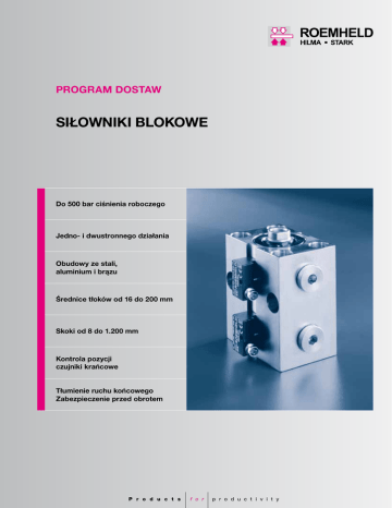 PROGRAM DOSTAW SIŁOWNIKI BLOKOWE Do 500 bar ciśnienia roboczego Jedno- i dwustronnego działania Obudowy ze stali, aluminium i brązu Średnice tłoków od 16 do 200 mm Skoki od 8 do 1.200 mm Kontrola pozycji czujniki krańcowe Tłumienie ruchu końcowego Zabezpieczenie przed obrotem Program dostaw SIŁOWNIKI BLOKOWE Max. ciśnienie zasilania Czujniki krańcowe Wykonanie Karta katalogowa 500 bar nie Standard Standard B 1.5091 B 1.5094 Jednostronnego Dwustronnego działania działania Rodzaj tak Tłoczysko z gwintem zewnętrznym Siłownik ciągnący Czujniki krańcowe Czujniki krańcowe/ tłumienie końcowe B 1.542 B 1.570 B 1.520 B 1.530 Dwustronnego działania Jednostronnego działania Dwustronnego działania Dwustronnego działania Materiał obudowy Stal Stal Stal Stal Stal Stal Siła nacisku przy max. ciśnieniu 2 … 392 kN 2 … 1.570 kN 24,5 … 156 kN 10 … 392 kN 10 … 392 kN 24 … 392 kN Średnice tłoków 16 … 100 mm 16 … 200 mm 25 … 63 mm 16 … 100 mm 16 … 100 mm 25 … 100 mm Skok 8 … 100 mm 16 … 200 mm 50 … 63 mm 8 … 12 mm 16 … 100 mm 25 … 100 mm 0,25 m/s 0,25 m/s 0,25 m/s 0,25 m/s 0,25 m/s 0,25 m/s Rurowe lub kanałowe Rurowe lub kanałowe Rurowe lub kanałowe Rurowe lub kanałowe Rurowe lub kanałowe Rurowe lub kanałowe Tłumienie końcowe – – – – – ● (regulowane) Zabezpieczenie przed obrotem – – – – – – Gwint zewnętrzny na tłoczysku ❏ ❏ ● ❏ ❏ ❏ Rowek poprzeczny w obudowie ■ ■ ■ ■ ■ ■ Uszczelnienia oraz max. temp. pracy NBR: +100 °C FKM: +200 °C NBR: +100 °C FKM: +200 °C NBR: +100 °C FKM: +200 °C NBR: +100 °C FKM: +200 °C FKM: +120 °C NBR: +100 °C FKM: +120 °C ❏ INOX ❏ INOX – – – – – – – – Max. prędkość tłoka Przyłącze hydrauliczne Wykonanie nierdzewne Opcje Czujniki pozycji i pozycji krańcowych Czujniki krańcowe Czujniki krańcowe •Sensor •Zbliżeniowy •Zbliżeniowy •Typ •indukcyjny, hermetyczny •indukcyjny, hermetyczny •Regulacja punktu włączenia •do max. 5 mm pozycji końcowej •do max. 5 mm pozycji końcowej •max. temp. pracy •+80°C lub +120°C •+80 °C lub +120 °C Legenda: ● Seria ❍ Opcja ■ Wariant standardowy ❏ Wykonanie specjalne – niedostępne 500 bar tak z przelotowym tłoczyskiem 350 bar tak nie z regulowanymi czujnikami magnetycznymi Elementy do zabudowy z regulowanymi czujnikami magnetycznymi 250 bar tak z poligonalnym tłoczyskiem Blokowo-rurowy B 1.552 B 1.553 B 1.5401 B 1.554 B 1.560 B 1.590 Dwustronnego działania Dwustronnego działania Dwustronnego działania Dwustronnego działania Dwustronnego działania Dwustronnego działania Stal Brąz – Aluminium Aluminium Stal 24,5 … 156 kN 24,5 … 156 kN 10 … 392 kN 17,1 … 109 kN 28,1 … 68,7 kN 12,3 … 126 kN 25 … 63 mm 25 … 63 mm 16 … 100 mm 25 … 63 mm 32 … 50 mm 25 … 80 mm 20 … 50 mm 20 … 100 mm 16 … 100 mm 20 … 100 mm 25 … 100 mm 70 … 1.200 mm (bezstopniowo) 0,25 m/s 0,25 m/s 0,25 m/s 0,25 m/s 0,25 m/s 0,5 m/s Rurowe lub kanałowe Rurowe lub kanałowe – – Rurowe lub kanałowe Rurowe – Rurowe lub kanałowe – – – – – ● (regulowane) – – – – ● – ❏ ❏ ❏ ❏ – ● ■ ■ – ■ ■ ● NBR: +100 °C FKM: +120 °C NBR: +100 °C FKM: +200 °C NBR: +100 °C FKM: +120 °C NBR: +100 °C FKM: +200 °C – ❍ – ❍ – FKM: +200 °C – Kontrola pozycji Kontrola pozycji Kontrola pozycji Kontrola pozycji Kontrola pozycji Czujniki krańcowe •Zbliżeniowy •Magnetyczny •Magnetyczny • Magnetyczny •Magnetyczny •Zbliżeniowy •indukcyjny, hermetyczny •indukcyjny •w całym zakresie skoku •w całym zakresie skoku •w całym zakresie skoku •w całym zakresie skoku •w całym zakresie skoku •indukcyjny, hermetyczny •+70 °C lub +120 °C •+100 °C •+100 °C •+100 °C •+100 °C •+80 °C lub +120 °C Ważne informacje techniczne Materiały obudowy Dopuszczalna siła promieniowa Mocowanie Stal ulepszana, stopy brązu lub specjalne stopy aluminium. Promieniowe obciążenia tłoka i tłoczyska skracają żywotność siłownika i mogą być przyczyną nieszczelności lub zniszczenia siłownika. Należy zatem unikać sił poprzecznych – szczególnie przy siłownikach jednostronnego działania. W każdym przypadku siła promieniowa na tłoczysku nie może przekraczać 3% max. siły siłownika przy max. ciśnieniu roboczym (dla skoków do 50 mm). Przy większych skokach prosimy o kontakt. Do przykręcenia siłowników blokowych należy stosować śruby w klasie wytrzymałościowej 8.8. Przy zabudowie poziomej w zależności od ciśnienia zasilania siłowniki muszą być podparte. Siłowniki blokowe: od 160 / 250 bar Siłowniki blokowo-rurowe:od 100 / 160 bar (siłownik ciągnący/pchający) Materiały uszczelnień • NBR = Kauczuk butadienowo - akrylonitrylowy Nazwa handlowa np.: Perbunan Temp. pracy: – 30 do +100 °C • FKM = Kauczuk fluorowy Nazwa handlowa np.: VITON® Temp. pracy: – 20 do +150 °C Pozycja montażu Wszystkie siłowniki blokowe moga być montowane w dowolnej pozycji. Śrubunki rurowe Do rurowych gwintów Whitworth G pasują śrubunki zgodne z DIN 2353, złączki B wg DIN 3852 część 2 (z krawędzią uszczelniającą lub uszczelką). Do siłowników blokowych z obudową aluminiową lub z brązu należy stosować tylko śrubunki z miękkim uszczelnieniem (uszczelki elastyczne). Uwaga! Nie wolno stosować jakichkolwiek dodatkowych uszczelnień jak np. taśmy teflonowe! Wystarczające jest, aby podparcie miało tylko kilka milimetrów. Siłowniki blokowe ROEMHELD w stanie statycznym są bezprzeciekowe. Minimalizacja przecieków w trakcie ruchu tłoka osiagnięta została dzięki zastosowaniu podwójnego uszczelnienia. W trosce o żywotność uszczelnienia wskazane jest utrzymywanie się na tłoczysku cienkiego filmu olejowego . Dopuszczalne wartości przecieków na każde 1000 podwójnych skoków wynoszą przy oleju HLP 22: – do 32 mm średnicy tłoka: < 0