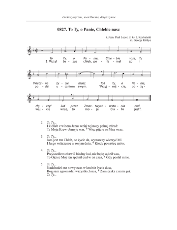 Eucharystyczne, uwielbienia, dziękczynne 0827. To Ty, o Panie, Chlebie nasz t. Jean. Paul Lecor, tł. ks. J. Kochański m. George Kirbye To Ty, o Pa - nie, Chle - bie nasz, Ty 1. Wziął Je - zus chleb, po - ła - mał go i Wiecz - ne ży - cie masz. Toś Ty, o Pa - nie, po - dał u - czniom swym: “Przyj - mij - cie, po - ży - złą - czył lud przez Zmar- twych - wsta - nia cud. waj - cie wraz, to mo - je Cia - ło jest”. 2. To Ty... I kielich z winem Jezus wziął tej nocy pełnej zdrad: Ta Moja Krew obmyje was, * Więc pijcie ze Mną wraz. 3. To Ty... Jam jest ten Chleb, co życie da, wystarczy wierzyć Mi I Ja go wskrzeszę w owym dniu, * Kiedy powrócę znów. 4. To Ty... Przyszedłem zbawić biedny lud, nie będę sądził was, To Ojciec Mój ten spełnił cud w on czas, * Gdy posłał mnie. 5. To Ty... Nadchodzi oto nowy czas w krainie życia dusz, Bóg sam zgromadzi wszystkich nas, * Zamieszka z nami już. To Ty...