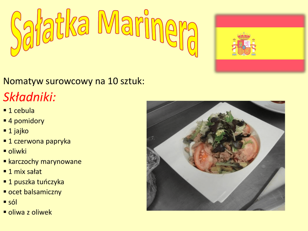 Nomatyw surowcowy na 10 sztuk: Składniki: 1 cebula 4 pomidory 1 jajko 1 czerwona papryka oliwki karczochy marynowane 1 mix sałat 1 puszka tuńczyka ocet balsamiczny sól oliwa z oliwek Sposób przyrządzenia: Sałatę kroimy w paski, następnie cebulę w piórka. Układamy dookoła 4 pomidory pokrojone na 16 kawałków. Następnie kładziemy na to 2 połówki jajka, dodajemy ok. 5-7 kawałków papryki pokrojonej w paski, ok. garści oliwek oraz 4-5 kawałków karczocha. Dodajemy na to mix sałat, a dookoła tuńczyka oraz trochę oliwy z oliwek, soli oraz octu balsamicznego do dekoracji. Klaudia Duszczyk Klasa IIm Saffron Restaurant & Tapas