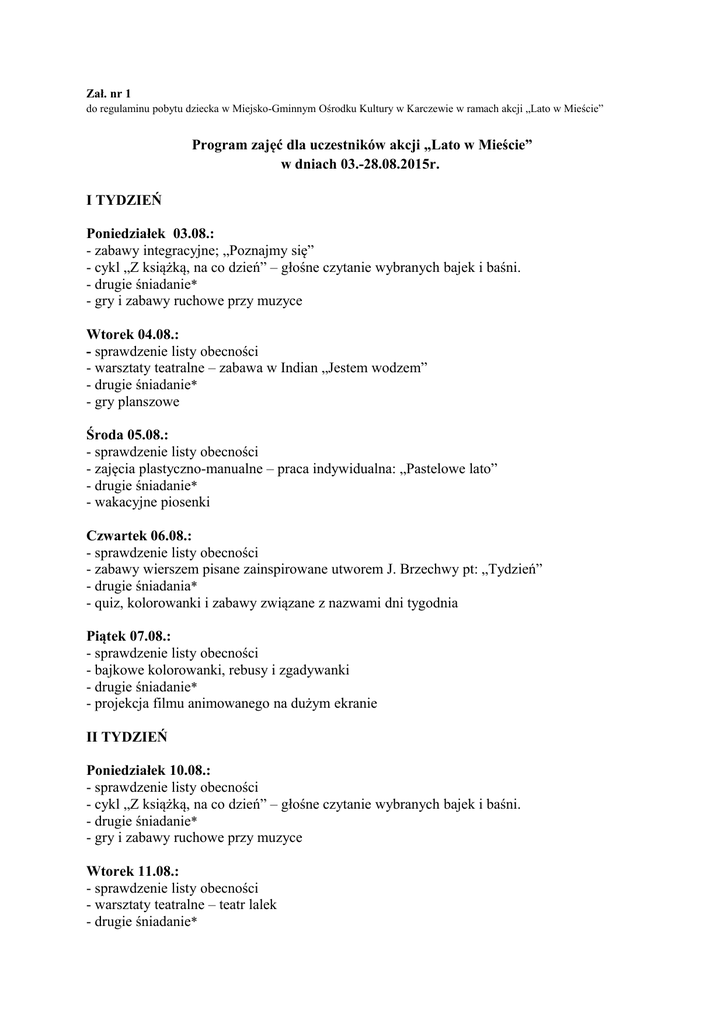 Zał. nr 1 do regulaminu pobytu dziecka w Miejsko-Gminnym Ośrodku Kultury w Karczewie w ramach akcji „Lato w Mieście” Program zajęć dla uczestników akcji „Lato w Mieście” w dniach 03.-28.08.2015r. I TYDZIEŃ Poniedziałek 03.08.: - zabawy integracyjne; „Poznajmy się” - cykl „Z książką, na co dzień” – głośne czytanie wybranych bajek i baśni. - drugie śniadanie* - gry i zabawy ruchowe przy muzyce Wtorek 04.08.: - sprawdzenie listy obecności - warsztaty teatralne – zabawa w Indian „Jestem wodzem” - drugie śniadanie* - gry planszowe Środa 05.08.: - sprawdzenie listy obecności - zajęcia plastyczno-manualne – praca indywidualna: „Pastelowe lato” - drugie śniadanie* - wakacyjne piosenki Czwartek 06.08.: - sprawdzenie listy obecności - zabawy wierszem pisane zainspirowane utworem J. Brzechwy pt: „Tydzień” - drugie śniadania* - quiz, kolorowanki i zabawy związane z nazwami dni tygodnia Piątek 07.08.: - sprawdzenie listy obecności - bajkowe kolorowanki, rebusy i zgadywanki - drugie śniadanie* - projekcja filmu animowanego na dużym ekranie II TYDZIEŃ Poniedziałek 10.08.: - sprawdzenie listy obecności - cykl „Z książką, na co dzień” – głośne czytanie wybranych bajek i baśni. - drugie śniadanie* - gry i zabawy ruchowe przy muzyce Wtorek 11.08.: - sprawdzenie listy obecności - warsztaty teatralne – teatr lalek - drugie śniadanie* - gry planszowe Środa 12.08.: - sprawdzenie listy obecności - zajęcia plastyczno-manualne - praca zespołowa „Geometryczny świat” - drugie śniadanie* - wakacyjne piosenki Czwartek 13.08.: - sprawdzenie listy obecności - wyjazd do Warszawy na wybrany film z repertuaru kina Piątek 14.08.: - sprawdzenie listy obecności - zabawy wierszem pisane zainspirowane utworem S. Kraszewskiego pt.: „Witaminowe abecadło” - drugie śniadanie* - quiz o zdrowym odżywianiu III TYDZIEŃ Poniedziałek 17.08.: - sprawdzenie listy obecności - cykl „Z książką, na co dzień” – głośne czytanie wybranych bajek i baśni. - drugie śniadanie* - gry i zabawy ruchowe przy muzyce Wtorek 18.08.: - sprawdzenie listy obecności - warsztaty teatralne – odtwarzanie scenek i zabawa w naśladowanie - drugie śniadanie* - gry planszowe Środa 19.08.: - sprawdzenie listy obecności - zajęcia plastyczno-manualne – praca indywidualna: „Ołówkowy zwierzyniec” - drugie śniadanie* - wakacyjne piosenki Czwartek 20.08.: - sprawdzenie listy obecności - wyjazd na basen do Józefowa Piątek 21.08.: - sprawdzenie listy obecności - bajkowe kolorowanki, rebusy i zgadywanki - drugie śniadanie* - projekcja filmu animowanego na dużym ekranie IV TYDZIEŃ Poniedziałek 24.08.: - sprawdzenie listy obecności - cykl „Z książką, na co dzień” - głośne czytanie wybranych bajek i baśni. - drugie śniadanie* - gry i zabawy ruchowe przy muzyce Wtorek 25.08: - sprawdzenie listy obecności - warsztaty teatralne – zabawa w lustrzane odbicie i fotografa. - drugie śniadanie* - bajkowe kolorowanki, rebusy i zgadywanki Środa 26.08.: - sprawdzenie listy obecności - zajęcia plastyczno-manualne – praca grupowa: „Wracamy do szkoły” - drugie śniadanie* - wakacyjne piosenki Czwartek 27.08: - sprawdzenie listy obecności - wyjazd do Warszawy na wybrany film z repertuaru kina Piątek 28.08: - sprawdzenie listy obecności - dyskoteka na zakończenie akcji *- drugie śniadanie we własnym zakresie Organizatorzy zastrzegają sobie prawo do zmian poszczególnych punktów programu. Informacje o planowanym wyjeździe do kina i na basen zostaną przekazane uczestnikom po ustaleniu szczegółów. Istnieje możliwość wzbogacenia oferty o wycieczkę, ewentualna data i koszt zostaną ustalone w trakcie trwania akcji.
