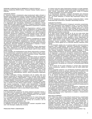 WARUNKI UCZESTNICTWA W IMPREZACH TURYSTYCZNYCH Agencji Turystycznej ARION Dorota i Krzysztof Radwan Spółka Jawna w Krakowie ZAWARCIE UMOWY § 1 Zawarcie umowy o świadczenie usług turystycznych (dalej „Umowa’) z Klientem przez Organizatora Imprezy Turystycznej (dalej „Organizator”) lub Agenta upowaŜnionego do sprzedaŜy imprezy Turystycznej Organizatora, następuje z chwilą jej podpisania oraz po wpłaceniu przez Klienta, o ile strony pisemnie nie postanowią inaczej, zaliczki w wysokości 25% wskazanej w Umowie łącznej ceny imprezy turystycznej zamawianej przez Klienta. § 2 Organizator jest zobowiązany niezwłocznie po podpisaniu Umowy wydać Klientowi jeden egzemplarz Umowy z niniejszymi warunkami uczestnictwa wraz z potwierdzeniem przyjęcia zgłoszenia uczestnictwa w imprezie turystycznej zamawianej przez Klienta. § 3 Klient jest zobowiązany poinformować Organizatora o pełnych i prawidłowych danych osobowych oraz danych kontaktowych (w szczególności: adres e-mail, bezpośredni telefon, fax), niezbędnych ze względu na rodzaj zamawianej przez Klienta imprezy turystycznej; oraz jest zobowiązany informować niezwłocznie Organizatora o kaŜdorazowej zmianie podanych danych i informacji do momentu wykonania zawartej Umowy, aby było moŜliwe dopełnienie wymaganych formalności związany z realizacja zamówionej przez Klienta imprezy turystycznej. § 4 Organizator ma prawo zwrócić się do Klienta o przedłoŜenie do wglądu dokumentów potwierdzających prawdziwość i poprawność danych osobowych podanych przez Klienta, niezbędnych do zawarcia i wykonania Umowy. Klient jest zobowiązany ponadto przedłoŜyć na kaŜdorazowe wezwanie Organizatora, dokument niezbędny do uczestnictwa w imprezie, w szczególności dowód osobisty, paszport, Kartę Kolonijną. § 5 Klient jest zobowiązany sprawdzić poprawność danych dotyczących jego osoby, wskazanych w Umowie oraz potwierdzeniu zgłoszenie uczestnictwa w imprezie turystycznej, jak równieŜ danych osób na rzecz których zawarł Umowę. § 6 W przypadku nie przedstawienia przez Klienta dokumentów na potwierdzenie prawdziwości i poprawności podanych przez Klienta danych osobowy i informacji niezbędnych do zawarcia i wykonania Umowy, Organizator ma prawo odmówić zawarcia Umowy z Klientem. § 7 W razie zawarcia przez Organizatora z Klientem Umowy na podstawie podanych przez Klienta nieprawidłowych lub nieprawdziwych danych w konsekwencji odmowy przedstawienia przez Klienta na Ŝądanie Organizatora dokumentów na potwierdzenie poprawności i prawdziwości zgłoszonych danych, Organizator nie ponosi odpowiedzialności za niewykonanie lub nienaleŜyte wykonanie w całości lub w części Umowy, jeŜeli nastąpiło to wyłącznie z powodu podania przez Klienta nieprawdziwych lub nieprawidłowych danych osobowych. Organizator jest wówczas zobowiązany do zwrotu uiszczonej przez Klienta części ceny odpowiadającej niewykonanym lub nienaleŜycie wykonanym zobowiązaniom z Umowy. Organizator jest uprawniony potrącić jednak ze zwracanej Klientowi części ceny koszty poniesione przez Organizatora w związku z podaniem przez Klienta nieprawdziwych lub nieprawidłowych danych, których poniesienia Organizator nie mógł uniknąć. § 8 Klient zawierający Umowę, zobowiązany jest do zapłaty całej ceny imprezy turystycznej za wszystkie wymienione w Umowie osoby na rzecz których zawarł Umowę z Organizatorem, o której to cenie przed podpisaniem Umowy został poinformowany, w szczególności poprzez dane zawarte w sposób dokładny i zrozumiały w broszurach, folderach lub katalogach. § 9 Klient zobowiązany jest ponadto poinformować wszystkie osoby wskazane w Umowie na rzecz których zawarł Umowę, o szczegółach dotyczących imprezy turystycznej, o których został zawiadomiony. Podpisując Umowę na pokój wieloosobowy Klient ponadto ponosi pełną odpowiedzialność finansową za ewentualne nie wykorzystanie miejsc, w przypadku rezygnacji którejkolwiek z osób na rzecz których zawarł Umowę. ZMIANY WARUNKÓW UMOWY § 10 Organizator jest uprawniony do zmiany istotnych warunków Umowy z przyczyn od niego niezaleŜnych, przed nadejściem określonej w Umowie daty rozpoczęcia imprezy, z zastrzeŜeniem postanowień § 18, pod warunkiem niezwłocznego powiadomienia o tym Klienta. § 11 W przypadku zaistnienia sytuacji opisanej w § 10, to jest zmiany istotnych warunków Umowy przez Organizatora z przyczyn od niego niezaleŜnych, Klient powinien niezwłocznie, nie później niŜ w terminie 3 dni na piśmie poinformować Organizatora, czy: a) przyjmuje proponowaną zmianę umowy albo b) odstępuje od umowy za natychmiastowym zwrotem wszystkich świadczeń i bez obowiązku zapłaty kary umownej. PRZEJSCIE PRAW I ZOBOWIAZAŃ § 12 Klient moŜe bez zgody Organizatora przenieść na osobę spełniającą warunki udziału w imprezie turystycznej wszelkie przysługujące mu z tytułu Umowy uprawnienia, jeŜeli jednocześnie osoba ta przejmie wszystkie wynikające z tej Umowy obowiązki. § 13 Przeniesienie uprawnień i przejęcie obowiązków jest skuteczne wobec Organizatora, jeŜeli Klient zawiadomi go o tym pisemnie w terminie 7 dni przed wskazaną w Umowie datą rozpoczęcia imprezy turystycznej. § 14 Za niewpłaconą część ceny imprezy turystycznej Klient i osoba przejmująca jego uprawnienia i obowiązki odpowiadają solidarnie. WARUNKI PŁATNOŚCI § 15 Stosownie do postanowień § 1niniejszych warunków uczestnictwa, Klient jest zobowiązany przy podpisaniu umowy, o ile strony pisemnie nie postanowią inaczej, uiścić zaliczkę w wysokości 25% ceny imprezy turystycznej wskazanej w Umowie, która podlega zaliczeniu na poczet całości ceny. Pozostałą do zapłaty część ceny Klient zobowiązany jest uregulować nie później niŜ w terminie 30 dni przed wskazaną w Umowie datą rozpoczęcia imprezy turystycznej. § 16 JeŜeli Umowa zostaje zawarta na 30 dni lub mniej przed datą rozpoczęci