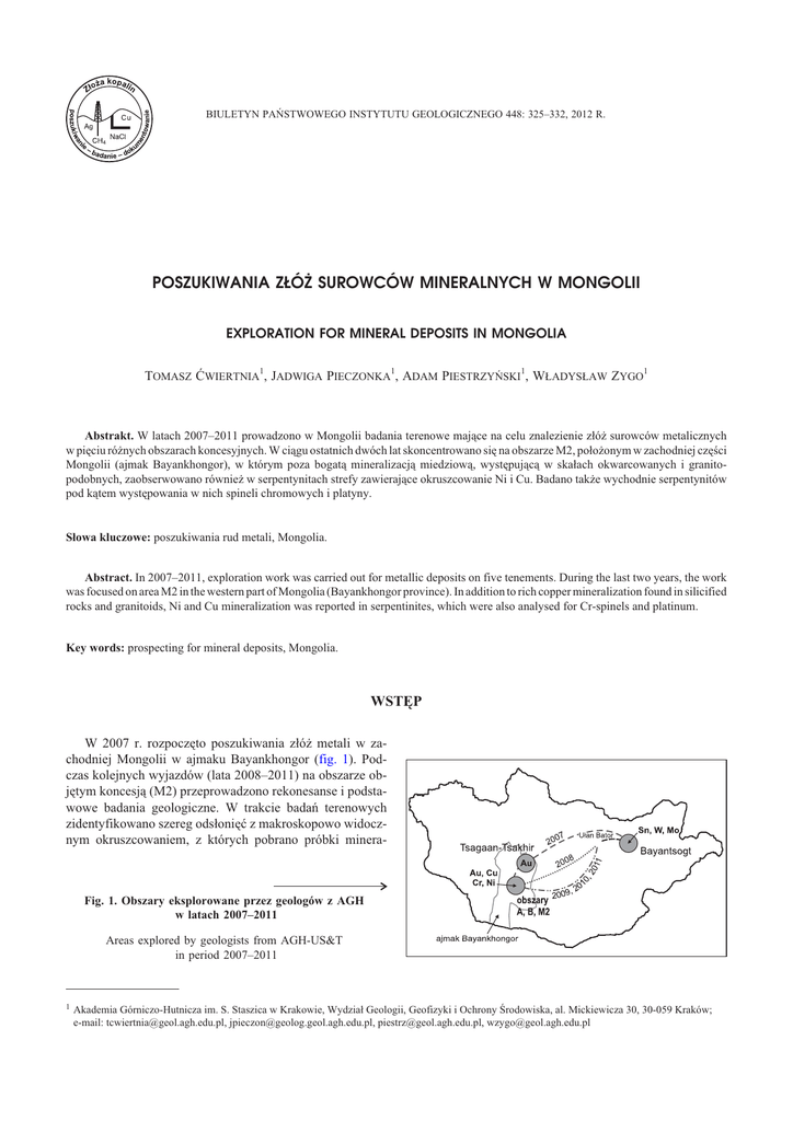 BIULETYN PAÑSTWOWEGO INSTYTUTU GEOLOGICZNEGO 448: 325–332, 2012 R. POSZUKIWANIA Z£Ó¯ SUROWCÓW MINERALNYCH W MONGOLII EXPLORATION FOR MINERAL DEPOSITS IN MONGOLIA TOMASZ ÆWIERTNIA1, JADWIGA PIECZONKA1, ADAM PIESTRZYÑSKI1, W£ADYS£AW ZYGO1 Abstrakt. W latach 2007–2011 prowadzono w Mongolii badania terenowe maj¹ce na celu znalezienie z³ó¿ surowców metalicznych w piêciu ró¿nych obszarach koncesyjnych. W ci¹gu ostatnich dwóch lat skoncentrowano siê na obszarze M2, po³o¿onym w zachodniej czêœci Mongolii (ajmak Bayankhongor), w którym poza bogat¹ mineralizacj¹ miedziow¹, wystêpuj¹c¹ w ska³ach okwarcowanych i granitopodobnych, zaobserwowano równie¿ w serpentynitach strefy zawieraj¹ce okruszcowanie Ni i Cu. Badano tak¿e wychodnie serpentynitów pod k¹tem wystêpowania w nich spineli chromowych i platyny. S³owa kluczowe: poszukiwania rud metali, Mongolia. Abstract. In 2007–2011, exploration work was carried out for metallic deposits on five tenements. During the last two years, the work was focused on area M2 in the western part of Mongolia (Bayankhongor province). In addition to rich copper mineralization found in silicified rocks and granitoids, Ni and Cu mineralization was reported in serpentinites, which were also analysed for Cr-spinels and platinum. Key words: prospecting for mineral deposits, Mongolia. WSTÊP W 2007 r. rozpoczêto poszukiwania z³ó¿ metali w zachodniej Mongolii w ajmaku Bayankhongor (fig. 1). Podczas kolejnych wyjazdów (lata 2008–2011) na obszarze objêtym koncesj¹ (M2) przeprowadzono rekonesanse i podstawowe badania geologiczne. W trakcie badañ terenowych zidentyfikowano szereg ods³oniêæ z makroskopowo widocznym okruszcowaniem, z których pobrano próbki minera- Fig. 1. Obszary eksplorowane przez geologów z AGH w latach 2007–2011 Areas explored by geologists from AGH-US&T in period 2007–2011 1 Akademia Górniczo-Hutnicza im. S. Staszica w Krakowie, Wydzia³ Geologii, Geofizyki i Ochrony Œrodowiska, al. Mickiewicza 30, 30-059 Kraków; e-mail: [email protected], [email protected], [email protected], [email protected] 326 Tomasz Æwiertnia i in. logiczne, s³u¿¹ce do rozpoznania buduj¹cych je ska³ i okreœlenia ich znaczenia surowcowego. Pobrano te¿ próbki glebowe oraz bruzdowe do badañ geochemicznych. W kolejnych latach oprócz rekonesansów geologicznych wykonano mapy szlichowe, mapy geochemiczne wyselekcjonowanych czêœci obszaru (2009 r.) oraz zaplanowano wykonanie badañ geofizycznych (2010 r.) i wiertniczych (2011 r.). W roku 2011, we wskazanych miejscach mongolska firma wiertnicza wykona³a cztery otwory wiertnicze o ³¹cznej d³ugoœci ponad 1000 m. W niniejszym artykule przedstawiono podsumowanie i ocenê dotychczasowych wyników badañ. GEOLOGIA W ZARYSIE Obszar Mongolii znajduje siê pomiêdzy kratonem syberyjskim na pó³nocy a kratonami tarimskim i sino-koreañskim od po³udnia i po³udniowego wschodu (Badarch i in., 2002). Takie po³o¿enie sprawia, ¿e przez Mongoliê przebiega centralna czêœæ œrodkowoazjatyckiego pasa orogenicznego, na który sk³adaj¹ siê utwory stref akrecji, ³uków wysp, ofiolitów oraz szelfów kontynentalnych (Osozawa i in., 2008). Mongolia jest podzielona na dwie czêœci, pó³nocn¹ – sk³adaj¹c¹ siê g³ównie ze ska³ wieku prekambryjskiego i dolnego paleozoiku oraz po³udniow¹ – z przewa¿aj¹cymi ska³ami dolnego i górnego paleozoiku (Badarch i in., 2002). Obie czêœci rozdziela g³ówny lineament mongolski, stanowi¹cy przybli¿on¹ regionaln¹, morfologiczn¹ i strukturaln¹ granicê. Badarch i in. (2002) dziel¹ te¿ obszar Mongolii na 44 jednostki geologiczne (terrany) oddzielone uskokami. Obszar, na którym prowadzono poszukiwania, nale¿y do jednostki Gobi Altai. Jest to w¹ska strefa rozci¹gaj¹ca siê na po³udnie od g³ównego lineamentu mongolskiego, wyd³u¿ona w kierunku wschód–zachód. Badarch i in. (2002) zaliczaj¹ j¹ do jednostek nale¿¹cych do stref zwi¹zanych z ³ukami wysp. Sk³ada siê ona g³ównie z utworów facji zieleñcowej, piaskowców, wapieni p³ytkowodnych, zlepieñców oraz ska³ pochodzenia wulkanicznego. Udokumentowano równie¿ wyst¹pienia karboñskich i permskich granitów oraz sylurskich i dewoñskich plagiogranitów (Badarch i in., 2002). PRACE TERENOWE Pierwszym etapem poszukiwañ by³o wykonanie rekonesansu geologicznego wzd³u¿ zaplanowanych tras, podczas którego rozpoznano kilka utlenionych stref charakteryzuj¹cych siê obecnoœci¹ czap ¿elaznych (gossan) (fig. 2A, B). Zidentyfikowano równie¿ kilka wychodni z makroskopowo rozpoznawaln¹ mineralizacj¹ kruszcow¹, g³ównie z pirytem i magnetytem (fig. 2C). W trakcie dalszych badañ pobrano próbki materia³u klastycznego z rozpoznanych, wyschniêtych koryt rzecznych w celu wykonania szlichów. Pobierano 10 litrów materia³u, który by³ przesiewany na sicie o œrednicy oczek 4 mm, co pozwala³o na usuniêcie najgrubszej frakcji, a nastêpnie p³ukany na miskach, a¿ do uzyskania czarnego lub szarego szlichu (fig. 2D). W pierwszym roku poszukiwañ pobrano 52 próbki szlichowe. Dla porównania w kolejnych latach pobierano ju¿ tylko 4 (2009 r.), 3 (2010 r.) oraz 17 (2011 r.) próbek. Bruzdowe próbki glebowe i litologiczne by³y pobierane w miejscach stwierdzonej mineralizacji kruszcowej, wzd³u¿ wytyczonych linii (fig. 2E), zwykle poprzecznie do rozpoznanej rozci¹g³oœci ska³. Równolegle do innych badañ by³y prowadzone glebowe badania geochemiczne. Ka¿dorazowo pobierano 20 litrów materia³u z g³êbokoœci oko³o 20 cm, a nastêpnie przesiewano przez sito o œrednicy oczek 0,2 mm, wstêpnie redukuj¹c wielkoœæ próbki. Glebowe badania geochemiczne by³y wykonywane tylko w wybranych czêœciach obszaru. Jedn¹ z nich by³a strefa granitoidów, w której obrêbie zlokalizowano wychodniê z mineralizacj¹ miedziow¹. Wszystkie miejsca pobrania próbek lokalizowano urz¹dzeniami GPS, a ich po³o¿enie nanoszono na mapy. W terenie pos³ugi