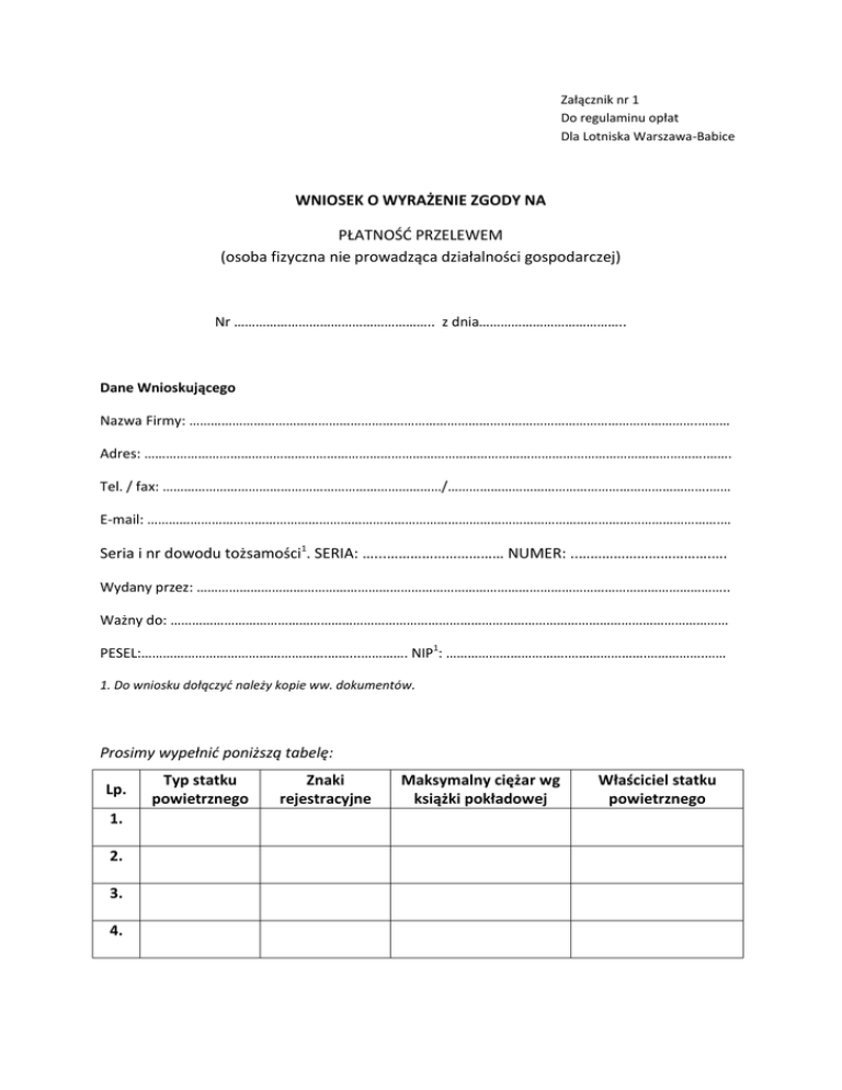 Załącznik nr 1 Do regulaminu opłat Dla Lotniska Warszawa-Babice WNIOSEK O WYRAŻENIE ZGODY NA PŁATNOŚĆ PRZELEWEM (osoba fizyczna nie prowadząca działalności gospodarczej) Nr ……………………………………………….. z dnia………………………………….. Dane Wnioskującego Nazwa Firmy: …………………………………………………………………………………………………………………………….……… Adres: ………………………………………………………………………………………………………………………………………….……. Tel. / fax: ……………………………………………………………………/……………………………………………………………….…… E-mail: …………………………………………………………………………………………………………………………………………….… Seria i nr dowodu tożsamości1. SERIA: …...………………………… NUMER: ..…………………………….…. Wydany przez: ………………………………………………………………………………………………………………………………….. Ważny do: ………………………………………………………………………………………………………………………………………… PESEL:…………………………………………….……...…………. NIP1: …………………………….………………….…………….…… 1. Do wniosku dołączyć należy kopie ww. dokumentów. Prosimy wypełnić poniższą tabelę: Lp. 1. 2. 3. 4. Typ statku powietrznego Znaki rejestracyjne Maksymalny ciężar wg książki pokładowej Właściciel statku powietrznego Poniżej prosimy zaznaczyć pole poprzez postawienie znaku X (w kwadracie). 1. Proszę o udzielenie zgody na płatność przelewem za usługi świadczone przez Zarządzającego Lotniskiem Warszawa-Babice – Centrum Usług Logistycznych „Lotnisko Warszawa-Babice” na rzecz Wnioskującego na podstawie otrzymanej faktury. Zobowiązuję się do: a) Uiszczania płatności za usługi lotniskowe w terminie do 14 dni od daty wystawienia faktury obejmującej wykonanie usługi świadczonej przez Zarządzającego Lotniskiem Warszawa-Babice na rzecz Wnioskującego wg obowiązujących stawek za usługi ujęte w regulaminie opłat dla Lotniska Warszawa-Babice, b) Terminowego regulowania należności, c) Uaktualniania danych (zmiany nazwy operatora, zmiany numerów telefonów, sprzedaży statku powietrznego, aktualnego wykazu floty powietrznej). W przypadku płatności na rachunek zarządzającego Lotniskiem Warszawa-Babice, za dzień zapłaty uznaje się datę wpływu środków na rachunek Zarządzającego. Zarządzający Lotniskiem Warszawa-Babice wystawi fakturę VAT po dokonaniu usługi. Opłaty za usługi lotniskowe prosimy dokonywać na niżej podane konto wg. aktualnego cennika: ZARZĄDZAJĄCY LOTNISKIEM: Centrum Usług Logistycznych „Lotnisko Warszawa-Babice” ul. Słoneczna 37 00-789 Warszawa NIP: 701 – 027 – 09 – 11 UWAGA! Nowy numer konta bankowego (od 1/03/2015): Bank BGK 64 1130 1017 0020 1465 3920 0004 Adres do korespondencji: CUL – „Lotnisko Warszawa-Babice” ul. gen bryg S. Kaliskiego 57 01-476 Warszawa Uwaga zmiana numer telefonu: tel. +48 261 855 481 fax: +48 261 855 363 Wypełnia Wnioskujący*: Wnioskowany okres, na który została zawarta powyższa umowa obowiązuje od dnia ……………………………………………………… do dnia…………………………………… * * ( po upływie wnioskowanego terminu należy ponownie złożyć wniosek) Wniosek sporządzono w dwóch jednobrzmiących egzemplarzach, po jednym dla każdej ze Stron. Wypełnia Zarządzający Lotniskiem Warszawa-Babice: Należy zaznaczyć właściwe pole poprzez postawienie znaku X (w kwadracie). Wyrażam zgodę ………………………………………………………………. Podpis osoby upoważnionej przez Zarządzającego Lotniskiem Warszawa-Babice Nie wyrażam zgody ……………………………………………………………….. Podpis wnioskującego