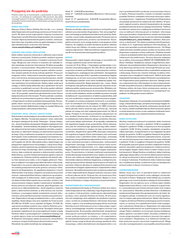 Przygotuj sie do podróży Podróż rodzi się w marzeniach, a jeśli jesteś w tym miejscu tzn., że właśnie je realizujesz! Nie pozwól, aby jakiś szczegół popsuł Ci plany. Dlatego polecamy, byś przed wyjazdem przeczytał ważne informacje i przygotował się do podróży. PRZED ODLOTEM Wszyscy Klienci Wezyr Holiday Service Sp. z o.o. (zwaną dalej Organizatorem) podróżują czarterowymi liniami lotniczymi. Na dzień przed rozpoczęciem Imprezy turystycznej Organizator prześle Klientowi bezpośrednio lub za pośrednictwem Agenta potwierdzenie godzin wylotów. Jednocześnie informuje, iż godziny lotów są ogólnodostępne i na bieżąco aktualizowane na stronie internetowej www.wezyrholidays.pl/rozklad_lotow. GODZINY ODLOTÓW I PRZYLOTÓW Dzień odlotu i powrotu wlicza się w całkowity czas trwania Imprezy turystycznej. Godziny przelotu ustalane są przez przewoźnika w porozumieniu z Urzędem Lotnictwa Cywilnego. Mogą one ulec zmianie w stosunku do rozkładu lotów zawartego na stronie internetowej. W takim przypadku prosimy o wyrozumiałość. Wszystkie firmy przewozowe starają się przestrzegać podanych godzin odlotów i przylotów. Czasem jednak nie da się uniknąć opóźnień. Przyczyny mogą być różne: niekorzystne warunki pogodowe, wzmożony ruch lotniczy, konieczne prace konserwacyjne, usterki techniczne. W takich wypadkach bezpieczeństwo jest dla nas ważniejsze niż punktualność. Należy także wziąć pod uwagę, iż odloty będą odbywały się w godzinach rannych a przyloty w godzinach nocnych. Do zmian godzin odlotów może dojść nawet na kilka godzin przed planowanym terminem. W przypadku zaistnienia jakichkolwiek zmian Klienci będą niezwłocznie informowani. Prosimy jednak o osobiste, telefoniczne potwierdzenie godziny odlotu bezpośrednio u Organizatora na dzień przed planowaną podróżą. W przypadku lotów nocnych ceny poszczególnych Imprez turystycznych zostały skalkulowane mając na uwadze faktyczną liczbę świadczeń oferowanych Klientom. PASZPORT, WIZA, OPŁATA TURYSTYCZNA Dokumentem uprawniającym do przekroczenia granicy Turcji, Egiptu, Maroka, Tunezji jest paszport i wiza, natomiast do krajów należących do strefy Schengen – Grecja, Hiszpania – dowód osobisty lub paszport, Bułgaria należąca do Unii Europejskiej – dowód osobisty lub paszport. Wymagane jest, aby dokument ten był ważny (niezależnie od wieku uczestnika) przez co najmniej 6 miesięcy po planowanym powrocie do kraju. Czas oczekiwania na paszport wynosi od miesiąca do 6 tygodni. Czas oczekiwania na paszport tymczasowy wydawany małoletnim, którzy nie ukończyli 5 roku życia, wynosi od 3 tygodni do 30 dni. Obywatele polscy, legitymujący się paszportem zagranicznym korzystający z usług biura Organizatora, powinni zapoznać się z przepisami wizowymi i paszportowymi kraju docelowego. Dane uczestnika (nazwisko, imiona, data urodzenia) wpisane w dokumentach podróży (bilet lotniczy, voucher hotelowy)muszą być zgodne z danymi w paszporcie. Podczas podróży paszport lub dowód należy mieć zawsze przy sobie, a nie w bagażu głównym. Paszport ze zdjęciem wymagany jest także dla dzieci i niemowląt. Organizator nie ponosi odpowiedzialności za osoby, które nie zostaną przepuszczone przez granicę z przyczyn niezależnych od Organizatora. Za zagubienie paszportu i innych dokumentów oraz koszty związane z procedurą otrzymania nowych, odpowiada Klient (koszty uzależnione są od placówek wydających te dokumenty). Jeżeli z powodu zagubienia dokumentów Klient spóźni się na samolot, na który miał zarezerwowane miejsce, będzie musiał pokryć dodatkowe koszty powrotu we własnym zakresie, gdyż Organizator nie ponosi za to odpowiedzialności. Jeżeli zagubiony zostanie jeden z dokumentów podróży, tj. bilet lotniczy lub voucher hotelowy, a wymagane będzie wystawienie nowych dokumentów, wówczas Klient powinien niezwłocznie poinformować Organizatora lub jego przedstawiciela w celu wydania duplikatu. Koszt zakupu wizy przy wjeździe do Turcji wynosi 20 USD lub 15 EUR, a przy wjeździe do Egiptu 15 USD. By usprawnić przebieg wydania wizy radzimy Państwu przygotować uprzednio odliczoną kwotę. Szczegóły dotyczące przepisów wjazdowych do poszczególnych krajów znajdą Państwo także w poszczególnych rozdziałach katalogu lub w opisie regionu, kraju na tronie www.wezyrholidays.pl W Katalonii obowiązuje opłata turystyczna, którą Klienci wnoszą w recepcji hotelowej podczas kwaterowania. Wysokość tej opłaty kształtuje się następująco: Hotel 5* - 2,50 EUR/osoba/doba, Hotel 4* - 1,00 EUR /osoba/doba (Barcelona 1,25 euro/osoba/doba), Hotel 3*, 2*, apartamenty - 0,50 EUR /osoba/doba (Barcelona 0,75 euro/osoba/doba). ODPRAWA NA LOTNISKU Zbiórka na lotnisku odbywa się minimum na 2 godzin przed odlotem przy stanowisku Organizatora. Tam otrzymają Państwo od naszego przedstawiciela dokumenty podróży (bilet, voucher, numer polisy ubezpieczeniowej). Ponieważ czas na odprawę jest ograniczony, prosimy o punktualność. Szczególnie zwracamy na to uwagę osobom wykupującym dolot krajowy. Ze względu na ściśle określone godziny odlotów należy liczyć się z faktem, że osoby znacznie spóźnione nie zostaną odprawione. Odprawa biletowo bagażowa kończy się 40 minut przed planowaną godziną odlotu. BAGAŻ Dopuszczalny ciężar bagażu wliczonego w cenę biletu lotniczego uzależniony jest od linii lotniczych i wynosi od 15 do 20 kg + 5 kg bagażu podręcznego o wymiarach nie przekraczających: 55 x 40 x 20 cm, tak aby można go było umieścić pod fotelem, przed sobą lub w schowku bagażowym, znajdującym się nad fotelem. Szczegółowe informacje dotyczące ilości i sposobu przewożenia bagażu znajdują się na stronie www.wezyrholidays.pl. Za każdy kg nadbagażu pasażer musi uiścić dodatkową opłatę, którą określa przewoźnik. Bagaż specjalny (np.: rower, deska surfingowa, kije golfowe) zabierany jest