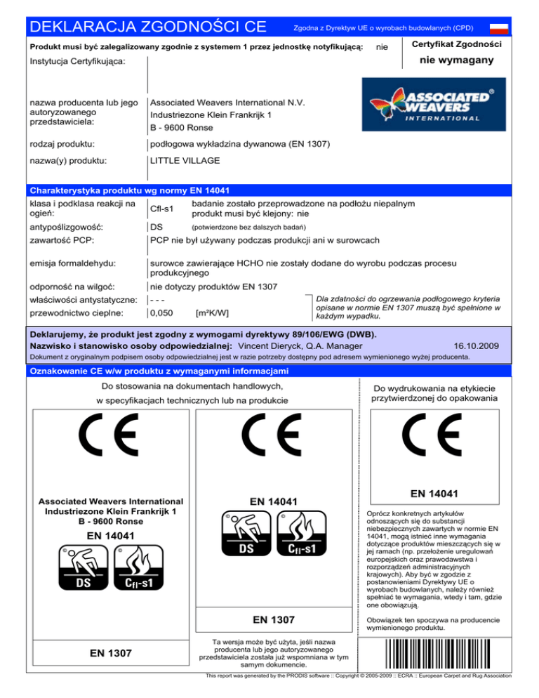 DEKLARACJA ZGODNOŚCI CE Zgodna z Dyrektyw UE o wyrobach budowlanych (CPD) Produkt musi być zalegalizowany zgodnie z systemem 1 przez jednostkę notyfikującą: nie Certyfikat Zgodności nie wymagany Instytucja Certyfikująca: nazwa producenta lub jego autoryzowanego przedstawiciela: Associated Weavers International N.V. Industriezone Klein Frankrijk 1 B - 9600 Ronse rodzaj produktu: podłogowa wykładzina dywanowa (EN 1307) nazwa(y) produktu: LITTLE VILLAGE Charakterystyka produktu wg normy EN 14041 klasa i podklasa reakcji na ogień: Cfl-s1 badanie zostało przeprowadzone na podłożu niepalnym produkt musi być klejony: nie antypoślizgowość: DS (potwierdzone bez dalszych badań) zawartość PCP: PCP nie był używany podczas produkcji ani w surowcach emisja formaldehydu: surowce zawierające HCHO nie zostały dodane do wyrobu podczas procesu produkcyjnego odporność na wilgoć: nie dotyczy produktów EN 1307 właściwości antystatyczne: --- przewodnictwo cieplne: 0,050 Dla zdatności do ogrzewania podłogowego kryteria opisane w normie EN 1307 muszą być spełnione w każdym wypadku. [m²K/W] Deklarujemy, że produkt jest zgodny z wymogami dyrektywy 89/106/EWG (DWB). Nazwisko i stanowisko osoby odpowiedzialnej: Vincent Dieryck, Q.A. Manager 16.10.2009 Dokument z oryginalnym podpisem osoby odpowiedzialnej jest w razie potrzeby dostępny pod adresem wymienionego wyżej producenta. Oznakowanie CE w/w produktu z wymaganymi informacjami Do stosowania na dokumentach handlowych, w specyfikacjach technicznych lub na produkcie 7 Associated Weavers International Industriezone Klein Frankrijk 1 B - 9600 Ronse 7 7 EN 14041 Z T ZT EN 14041 EN 1307 EN 1307 Do wydrukowania na etykiecie przytwierdzonej do opakowania EN 14041 Oprócz konkretnych artykułów odnoszących się do substancji niebezpiecznych zawartych w normie EN 14041, mogą istnieć inne wymagania dotyczące produktów mieszczących się w jej ramach (np. przełożenie uregulowań europejskich oraz prawodawstwa i rozporządzeń administracyjnych krajowych). Aby być w zgodzie z postanowieniami Dyrektywy UE o wyrobach budowlanych, należy również spełniać te wymagania, wtedy i tam, gdzie one obowiązują. Obowiązek ten spoczywa na producencie wymienionego produktu. Ta wersja może być użyta, jeśli nazwa producenta lub jego autoryzowanego przedstawiciela została już wspomniana w tym samym dokumencie. This report was generated by the PRODIS software :: Copyright © 2005-2009 :: ECRA :: European Carpet and Rug Association