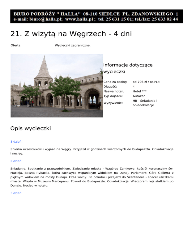 21. Z wizytą na Węgrzech - 4 dni Oferta: Wycieczki zagraniczne. Informacje dotyczące wycieczki Cena za osobę: od 796 zł / os.PLN Długość: 4 Nazwa hotelu: Hotel *** Typ dojazdu: Autokar Wyżywienie: HB - Śniadania i obiadokolacje Opis wycieczki 1 dzień: Zbiórka uczestników i wyjazd na Węgry. Przyjazd w godzinach wieczornych do Budapesztu. Obiadokolacja i nocleg. 2 dzień: Śniadanie. Spotkanie z przewodnikiem. Zwiedzanie miasta - Wzgórze Zamkowe, kościół koronacyjny św. Macieja, Baszta Rybacka, która zachwyca wspaniałym widokiem na Dunaj, Parlament, Góra Gellerta z pięknym widokiem na mosty Dunaju. Czas wolny. Po południu przejazd do Szentendre - spacer uliczkami miasta. Wizyta w Muzeum Marcepanu. Powrót do Budapesztu. Obiadokolacja. Wieczorem rejs statkiem po Dunaju. Nocleg w hotelu. 3 dzień: Śniadanie. Dalsze zwiedzanie Budapesztu z przewodnikiem - Plac Bohaterów z pomnikiem Millenium, Park Miejski z bajkową budowlą Pałacyku Vajdahunyad. Dalsza trasa to Bazylika św. Stefana oraz Parlament wzorowany na parlamencie londyńskim. Czas wolny. Po południu przejazd do Egeru - jednego z najładniejszych miasta na Węgrzech. Spacer po mieście - zamek, tureckie łaźnie, z których jedna z nich przykryta jest kopułą pokrytą małymi złotymi płytkami. Eger słynie również ze wspaniałego wina Egri Bikaver (Bycza Krew). Przejazd do Doliny Pięknej Pani, która jest miejscem składowania najlepszych win Eteru. Degustacja wina (dodatkowo płatne). Przejazd na obiadokolację i nocleg do Miszkolca. 4 dzień: Śniadanie. Pobyt w Miszkolcu - kąpielisko termalne w grotach solnych. Powrót do Polski w godzinach wieczornych. Cena obejmuje: Transport autokarowy (video, barek, klimatyzacja), ubezpieczenie KL i NNW, 3 noclegi na Węgrzech (pokoje 2,3 os. z łazienkami), wyżywienie: 3 śniadania (bufet), 3 obiadokolacje, opieka pilota, podatek VAT. Cena nie obejmuje: Biletów wstępu do zwiedzanych obiektów i usług przewodników lokalnych oraz degustacja wina w Egerze w kwocie ok. 40 Euro/osoba. (płatne obowiązkowo) Uwaga: O kalkulacje przy mniejszej grupie zapytaj w biurze. Cena skalkulowana przy założonym kursie 1 euro = 4,3 zł