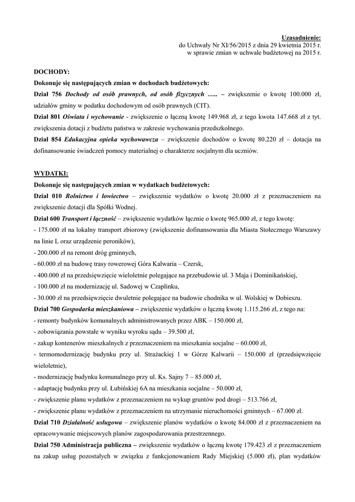 Uzasadnienie: do Uchwały Nr XI/56/2015 z dnia 29 kwietnia 2015 r. w sprawie zmian w uchwale budżetowej na 2015 r. DOCHODY: Dokonuje się następujących zmian w dochodach budżetowych: Dział 756 Dochody od osób prawnych, od osób fizycznych ….. – zwiększenie o kwotę 100.000 zł, udziałów gminy w podatku dochodowym od osób prawnych (CIT). Dział 801 Oświata i wychowanie - zwiększenie o łączną kwotę 149.968 zł, z tego kwota 147.668 zł z tyt. zwiększenia dotacji z budżetu państwa w zakresie wychowania przedszkolnego. Dział 854 Edukacyjna opieka wychowawcza – zwiększenie dochodów o kwotę 80.220 zł – dotacja na dofinansowanie świadczeń pomocy materialnej o charakterze socjalnym dla uczniów. WYDATKI: Dokonuje się następujących zmian w wydatkach budżetowych: Dział 010 Rolnictwo i łowiectwo – zwiększenie wydatków o kwotę 20.000 zł z przeznaczeniem na zwiększenie dotacji dla Spółki Wodnej. Dział 600 Transport i łączność – zwiększenie wydatków łącznie o kwotę 965.000 zł, z tego kwotę: - 175.000 zł na lokalny transport zbiorowy (zwiększenie dofinansowania dla Miasta Stołecznego Warszawy na linie L oraz urządzenie peroników), - 200.000 zł na remont dróg gminnych, - 60.000 zł na budowę trasy rowerowej Góra Kalwaria – Czersk, - 400.000 zł na przedsięwzięcie wieloletnie polegające na przebudowie ul. 3 Maja i Dominikańskiej, - 100.000 zł na modernizację ul. Sadowej w Czaplinku, - 30.000 zł na przedsięwzięcie dwuletnie polegające na budowie chodnika w ul. Wolskiej w Dobieszu. Dział 700 Gospodarka mieszkaniowa – zwiększenie wydatków o łączną kwotę 1.115.266 zł, z tego na: - remonty budynków komunalnych administrowanych przez ABK – 150.000 zł, - zobowiązania powstałe w wyniku wyroku sądu – 39.500 zł, - zakup kontenerów mieszkalnych z przeznaczeniem na mieszkania socjalne – 60.000 zł, - termomodernizację budynku przy ul. Strażackiej 1 w Górze Kalwarii – 150.000 zł (przedsięwzięcie wieloletnie), - modernizację budynku komunalnego przy ul. Ks. Sajny 7 – 85.000 zł, - adaptację budynku przy ul. Łubińskiej 6A na mieszkania socjalne – 50.000 zł, - zwiększenie planu wydatków z przeznaczeniem na wykup gruntów pod drogi – 513.766 zł, - zwiększenie planu wydatków z przeznaczeniem na utrzymanie nieruchomości gminnych – 67.000 zł. Dział 710 Działalność usługowa – zwiększenie planów wydatków o kwotę 84.000 zł z przeznaczeniem na opracowywanie miejscowych planów zagospodarowania przestrzennego. Dział 750 Administracja publiczna – zwiększenie wydatków o łączną kwotę 179.423 zł z przeznaczeniem na zakup usług pozostałych w związku z funkcjonowaniem Rady Miejskiej (5.000 zł), plan wydatków Urzędu (143.623 zł, w tym kwota 10.000 zł na komputeryzację), promocję JST poprzez wydanie albumu o Górze Kalwarii (15.000 zł) i wydatki związane z funkcjonowaniem sołectw (15.800 zł). Dział 754 Bezpieczeństwo publiczne i ochrona ppoż. – zwiększenie planu wydatków łącznie o kwotę 310.000 zł, z tego kwota 10.000 zł na dofinasowanie działań policji a kwota 300.000 zł na dofinansowanie zakupu samochodu pożarniczego dla OSP Wojciechowice. Dział 756 Dochody od osób prawnych, od osób fizycznych ….. – zwiększenie planu wydatków o kwotę 6.000 zł z przeznaczeniem na koszty prowadzonej windykacji podatków lokalnych od osób prawnych i innych jednostek organizacyjnych. Dział 801 Oświata i wychowanie – zwiększenie wydatków o łączna kwotę 506.082 zł, w tym: - 25.000 zł na budowę ogrodzenia szkoły w Brześcach, - 5.500 zł - zwiększenie planu finansowego wydatków przedszkola Nr 1 w Górze Kalwarii, - 2.333 zł na zwiększenie dotacji dla przedszkoli niepublicznych w związku ze zwiększeniem planu wydatków przedszkola Nr 1 w Górze Kalwarii, - 366.899 zł na zwiększenie planu wydatków przedsięwzięcia wieloletniego polegającego na modernizacji boiska przy ZSO w Górze Kalwarii, - 81.000 zł - zwiększenie planu finansowego ZSO i ZS w Baniosze (zakup energii, usług i nagród konkursowych), - 23.050 zł – z przeznaczeniem na wynagrodzenia w szkołach podstawowych i oddziałach przedszkolnych w szkołach podstawowych, - 2.300 zł – na zakup energii w ZOPO. Ponadto, w omawianej dziedzinie, zwiększono wydatki z dotacji celowej z budżetu państwa na realizację zadań własnych z zakresu wychowania przedszkolnego w kwocie 147.668 zł oraz wycofano udział środków własnych Gminy. Dział 852 Pomoc społeczna – zwiększenie wydatków o łączna kwotę 409.000 zł, w tym: - 320.000 zł – z przeznaczeniem na dopłaty do DPS, - 25.000 zł – zwiększenie wydatków na rodziny zastępcze, - 64.000 zł – zwiększenie planów wydatków OPS-u (zakup usług remontowych i pozostałych, czynsz za wynajem lokalu oraz wynagrodzenia osobowe). Dział 854 Edukacyjna opieka wychowawcza - zwiększenie planu wydatków o łączna kwotę 65.170 zł, w wyniku: - zwiększenia planu wydatków o kwotę 80.220 zł na dofinansowanie świadczeń pomocy materialnej o charakterze socjalnym dla uczniów (zgodnie z otrzymana dotacją), - zmniejszenia planu wydatków o kwotę 15.050 zł (oszczędności po wypłacie 13 wynagrodzenia) z przeznaczeniem na zwiększenie planu wydatków dot. wynagrodzeń osobowych w oddziałach przedszkolnych w szkołach podstawowych. Dział 900 Gospodarka komunalna i ochrona środowiska - zwiększenie planu wydatków o łączną kwotę 809.147 zł, z tego: - 40.000 zł – na bieżące utrzymanie kanalizacji deszczowej na terenie miasta, - 350.000 zł – na przedsięwzięcie wieloletnie polegające na budowie kanalizacji sanitarnej i deszczowej w rejonie ulic Dominikańskiej i 3 Maja w Górze Kalwarii, - 180.447 zł – wynagrodzenia pracowników obsługujących system gospodarki odpadami komunalnymi, - 38.600 zł – na oczyszczanie miasta i obszarów wiejskich, - 30.000 zł – na opracowanie założeń do planu zaopatrze