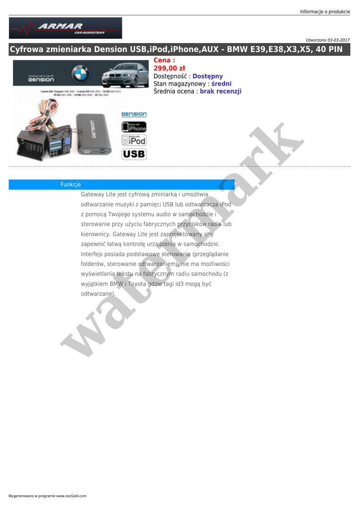 Informacje o produkcie Utworzono 03-03-2017 Cyfrowa zmieniarka Dension USB,iPod,iPhone,AUX - BMW E39,E38,X3,X5, 40 PIN Cena : 299,00 zł Funkcje er m ar k Dostępność : Dostępny Stan magazynowy : średni Średnia ocena : brak recenzji Gateway Lite jest cyfrową zminiarką i umożliwia odtwarzanie muzyki z pamięci USB lub odtwarzacza iPod z pomocą Twojego systemu audio w samochodzie i sterowanie przy użyciu fabrycznych przycisków radia lub kierownicy. Gateway Lite jest zaprojektowany aby zapewnić łatwą kontrolę urządzenia w samochodzie. Interfejs posiada podstawowe sterowanie (przeglądanie folderów, sterowanie odtwarzaniem), nie ma możliwości wyświetlania tekstu na fabrycznym radiu samochodu (z wyjątkiem BMW i Toyota gdzie tagi id3 mogą być w at odtwarzane). Wygenerowano w programie www.oscGold.com - Łatwe sterowanie iPod iPhone 3G i iPhone 4/4S (min. wersja oprogramowania. OS4.1) bezpośrednio z radia fabrycznego lub kierownicy - Współpraca z iPod nano (7 generacja) iPod touch (5. generacji) iPhone 5, 5S,5C ze złączem Lightning - Zintegrowana funkcja ładowania dla 4G iPod & iPhone (umożliwia ładowanie iPhone 4/4S/5/5S/5C prąd ładowania 1A) - Łatwy dostęp do folderów lub list odtwarzania zapisanych na nośniku pamięci USB. - Port USB host dla wielu urządzeń USB takich jak pamięci USB, odtwarzacze MP3 itp. (obsługiwane formaty: MP3, er m ar k OGG, WMA, MLS, M3U) - Najlepszą możliwą jakość dźwięku, ponieważ sygnały audio są przesyłane za pomocą interfejsu zmieniarki CD - Wybór różnych opcjonalnych, rodzajów połączeń - Modułowe rozwiązanie plug and play, bez instalacji dodatkowych przewodów - Brak bałaganu w wiązce przewodów (Wszystkie dostępne przewody pozwalają na profesjonalny montaż w samochodzie) - Pełna funkcjonalność fabrycznego systemów nawigacji, i radia samochodowego - Możliwość aktualizacji oprogramowania poprzez port USB Dane techniczne USB:Flash Memory i twarde dyski (UBS1.1 i wyższe) at System plików:FAT16 lub FAT32 Pojemność nośników:do 250GB Obsługiwane formaty MP3, WMA i WAV, OGG muzyczne: w W przypadku podłączenia iPod, iPhone potrzebne są Kompatybilność: akcesoria dodatkowe - iPhone, iPhone 4S, 4, 3GS and 3G (1A ładowanie) - iPod (4thgeneration) - iPod nano (1st, 2nd, 3rd, 4th, 5thand 6th generation) - iPod mini - iPod Photo 4G - iPod Video 5G - iPod Classic - iPod Touch (1st, 2nd, 3rd and 4th generation) - iPod nano (7 generacja) - iPod touch (5. generacji) - iPhone 5, 5S,5C Dane Interfejs: Wymiary (dł. x szer.):100 x 75 mm Informacje o produkcie Waga:85g Właściwości USB: Typ połączenia:USB 1.1 i wyższe System plików:FAT16 lub FAT32 Pojemność:Do 250 GB Odtwarzane formaty MP3, WMA, WAV i OGG muzyczne: Zestaw: Cyfrowa zmieniarka Przewody Plug&Play Polska instrukcja użytkownika i montażu er m ar k Dension Gwarancja:24 m-ce polskiego dystrybutora Akcesoria dodatkowe do montażu - iPhone, iPhone 4S, 4, 3GS and 3G (1A ładowanie) - iPod at (4thgeneration) - iPod nano (1st, 2nd, 3rd, 4th, 5thand 6th w Stacja dokująca IP44CR9 generation) - iPod mini - iPod Photo 4G - iPod Video 5G IP44CR9 - iPod Classic - iPod Touch (1st, 2nd, 3rd and 4th generation) Wygenerowano w programie www.oscGold.com - iPhone, iPhone 4S, 4, 3GS and 3G (1A ładowanie) - iPod (4thgeneration) - iPod nano (1st, 2nd, Przewód połączeniowy IPO5DC9 wraz z uchwytami 3rd, 4th, 5thand 6th generation) - iPod mini - iPod Photo 4G - iPod Video 5G - iPod Classic IPO5DC9 er m ar k - iPod Touch (1st, 2nd, 3rd and 4th generation) - iPhone, iPhone 4S, 4, 3GS and 3G (1A ładowanie) - iPod (4thgeneration) - iPod nano (1st, 2nd, 3rd, 4th, 5thand 6th Kabel połączeniowy IPDC1GW generation) - iPod mini - iPod Photo 4G IPDC1GW - iPod Video 5G - iPod Classic at - iPod Touch (1st, 2nd, 3rd and 4th w generation) Stacja dokująca iPhone IPH1GW0 doposażenie o Bluetooth - iPhone 4S, 4 IPH1GW0 W przypadku podłączenia iPhone 5, 5S, - iPod nano (7 5C lub iPod Nano (7 generacja) iPod generacja) Touch (5 generacja) do przewodu - iPod touch (5. IPO5DC9 wymagana jest przejściówka generacji) ze złacza Lightning na złącze 30 PIN - iPhone 5, 5S,5C MD823ZM/A Informacje o produkcie - Gateway Lite (GWL3xxx) - Gateway Lite BT (GBL3xxx) Adapter do Gateway (LIA1GW0) jest- iGateway opcjonalnym akcesorium do Gateway(GW17xxx) Lite, Gateway Lite BT, iGateway,- Gateway 300 Gateway 500, Gateway 300.(GW33xxx) Urządzenie pozwala na podłączenie- Gateway 500 Lite urządzeń Apple ze złączem Lightning.MOST (GWL1MO1) LIA łączy ze sobą iPod Dock oraz- Gateway 500 Lite Gateway ze złączem USB doD2B (GWL1DB1) er m ar k podłączenia iPhone'a / iPoda ( iPhone- Gateway 500 5, 5S, 5C, iPod nano 7 th , dotykowy -(GW51MO2) LIA1GW 5 th ) przy użyciu kabla USB (IPLC1GW)- Zalecamy lub iPhone 5 kołyskikorzystanie z (IP5LCRU/IP5LCRP)."Lightning" do kabla USB (IPLC1GW) lub " podstawka dla iPhone 5" (IP5LCRU lub IP5LCRP) Od momentu wprowadzenia iPhone 5 nowych iPhone'ów (5s, 5c i 5) które są wyposażone w złącza Lightning firma Dension wprowadziła nowy typ podstawki aby umożliwić podłączenie - iPhone 5, 5S,5C nowych iPhone do Gateway Lite i Lite at BT z iPhone przez USB. Do podłączenia podstawki wymagany zasilacz LIA1GW0 IP5LCRU Podstawka dla iPhone 5 do w profesjonalnego montażu w samochodzie. W podstawce będzie można umieścić iPhone 5, 5S lub 5c i profesjonalnie zamontować w samochodzie, zapewniając łatwy - iPhone 5, 5S,5C dostęp do smartfonu. Zestaw zawiera klips odpowietrznik i płytę montażową, która ułatwi montaż do konsoli lub deski rozdzielczej samochodu. Do podłączenia podstawki wymagany zasilacz LIA1GW0 Wygenerowano w programie www.oscGold.com IP5LCRP - Wszystkie urządzenia z Przewód AUX (CABL-AUX) wyjściem Jack 3,5 mm CABL-AUX BMWModel radia Business BMW 3 (E46) 1998-2005Professional 4:3 Navigation BMW 3 Compact (E46) 2001-2006Business er m ar k Business BMW 5 (E39) 1996-2000 Professional 4:3 Navigation 16:9 Navigati