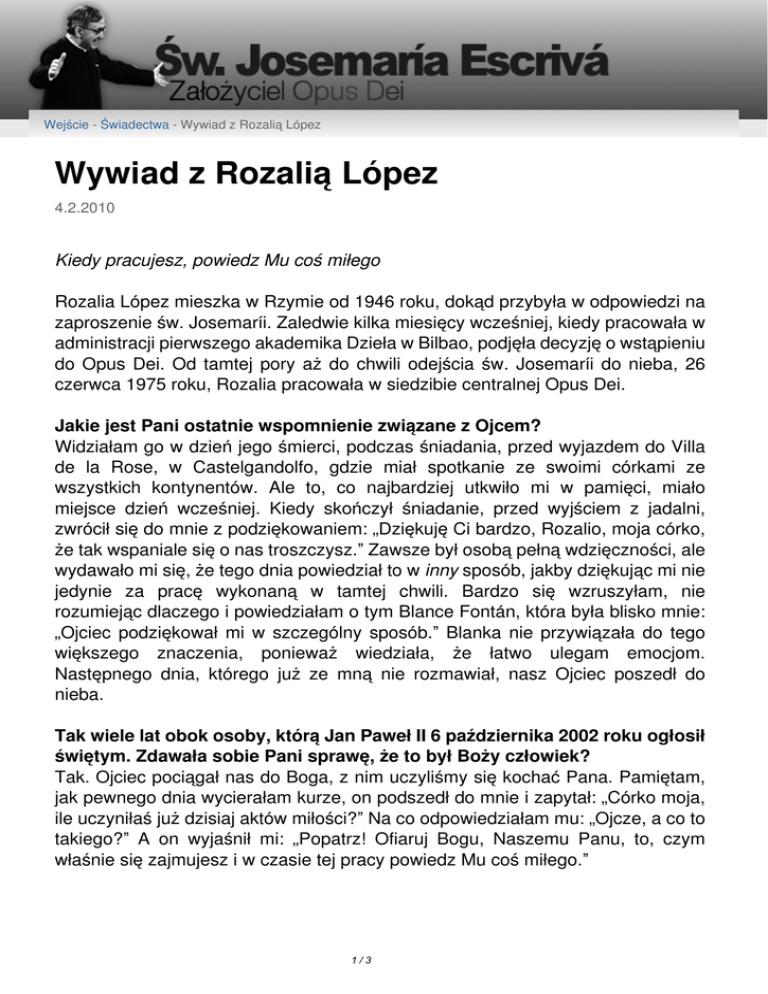 Wejście - Świadectwa - Wywiad z Rozalią López Wywiad z Rozalią López 4.2.2010 Kiedy pracujesz, powiedz Mu coś miłego Rozalia López mieszka w Rzymie od 1946 roku, dokąd przybyła w odpowiedzi na zaproszenie św. Josemaríi. Zaledwie kilka miesięcy wcześniej, kiedy pracowała w administracji pierwszego akademika Dzieła w Bilbao, podjęła decyzję o wstąpieniu do Opus Dei. Od tamtej pory aż do chwili odejścia św. Josemaríi do nieba, 26 czerwca 1975 roku, Rozalia pracowała w siedzibie centralnej Opus Dei. Jakie jest Pani ostatnie wspomnienie związane z Ojcem? Widziałam go w dzień jego śmierci, podczas śniadania, przed wyjazdem do Villa de la Rose, w Castelgandolfo, gdzie miał spotkanie ze swoimi córkami ze wszystkich kontynentów. Ale to, co najbardziej utkwiło mi w pamięci, miało miejsce dzień wcześniej. Kiedy skończył śniadanie, przed wyjściem z jadalni, zwrócił się do mnie z podziękowaniem: „Dziękuję Ci bardzo, Rozalio, moja córko, że tak wspaniale się o nas troszczysz.” Zawsze był osobą pełną wdzięczności, ale wydawało mi się, że tego dnia powiedział to w inny sposób, jakby dziękując mi nie jedynie za pracę wykonaną w tamtej chwili. Bardzo się wzruszyłam, nie rozumiejąc dlaczego i powiedziałam o tym Blance Fontán, która była blisko mnie: „Ojciec podziękował mi w szczególny sposób.” Blanka nie przywiązała do tego większego znaczenia, ponieważ wiedziała, że łatwo ulegam emocjom. Następnego dnia, którego już ze mną nie rozmawiał, nasz Ojciec poszedł do nieba. Tak wiele lat obok osoby, którą Jan Paweł II 6 października 2002 roku ogłosił świętym. Zdawała sobie Pani sprawę, że to był Boży człowiek? Tak. Ojciec pociągał nas do Boga, z nim uczyliśmy się kochać Pana. Pamiętam, jak pewnego dnia wycierałam kurze, on podszedł do mnie i zapytał: „Córko moja, ile uczyniłaś już dzisiaj aktów miłości?” Na co odpowiedziałam mu: „Ojcze, a co to takiego?” A on wyjaśnił mi: „Popatrz! Ofiaruj Bogu, Naszemu Panu, to, czym właśnie się zajmujesz i w czasie tej pracy powiedz Mu coś miłego.” 1/3 Na co zwróciłaby Pani uwagę w jego sposobie bycia? To był prawdziwy Ojciec, który potrafił kochać i potrafił wymagać. Kochał nas bardzo, był blisko, pomagał nam. Widziałam go, jak ścielił łożka, jak sprzątał, układał, porządkował. Nie dzielił pracy na kategorie w zależności od jej rodzaju – wszystkie zajęcia uważał za jednakowo ważne i wszystkie należało wykonać dobrze, z miłości do Boga. Najważniejsi byli dla niego jego synowie i jego córki. Latem 1962 roku spędził kilka tygodni w Londynie. Pojachałam tam również i ja, wraz z innymi osobami, aby prowadzić dom, w którym Ojciec mieszkał. Kiedy Ojciec zdał sobie sprawę, że dzień przewidziany na jego powrót do Rzymu wypadał w dzień moich imienin – 4 września, postanowił zmienić bilety. Powiedział: „Jak możemy wyjechać, skoro moja córka ma imieniny?”. Codziennie miałyśmy chwilę rozmowy z nim i z Álvaro del Portillo, i Ojciec nie chciał, aby właśnie tego dnia go zabrakło. Inne wspominienia Pierwsze miesiące w Rzymie były wyjątkowe. Kiedy przylecieliśmy do Rzymu, Ojciec z Álvaro przyjechali odebrać nas z lotniska. Przed naszym przybyciem do mieszkania przy Piazza della Città Leonina, gdzie miałyśmy mieszkać, wymył naczynia i posprzątał kuchnię, abyśmy zastały wszystko w najlepszym porządku. Tej nocy przygotowałyśmy na kolację omlet z ziemniakami i kurczaka, które przywiozłyśmy ze sobą ze świadomością, że w Rzymie wszystkiego brakowało i że głodowali. To był okres powojenny. Nie mieliśmy ani środków, ani pieniędzy. Jedzenie – dla duchownych, których Ojciec zapraszał na obiad, żeby mówić im o Dziele – przygotowywałyśmy na grzejnikach, które służyły nam do ogrzewania mieszkania. Brakowało najbardziej podstawowych rzeczy, ale dzięki pomysłowości i pomocy św. Josemaríi dobrze sobie radziłyśmy. Kiedy sprzątałam, widziałam go wiele razy, jak modlił się na tarasie, patrząc w kierunku apartamentów papieskich – było dla mnie jasne, że modlił się za Papieża. Inne wspomnienie jest związane z 27 kwietnia 1954 roku, kiedy Ojciec „umarł”, jak ja to mówię. Kiedy weszłam do jadalni, Álvaro zajmował się Ojcem, który znajdował się w szoku anafilaktycznym w wyniku cukrzycy, na którą od lat chorował, i usiłował wsadzić mu do buzi trochę cukru. Przynaglił mnie, abym poszukała lekarza. Ja w owym momencie zobaczyłam Ojca martwego. Po południu tego samego dnia, Ojciec i Álvaro, wracając do domu, weszli przez Villa Sacchetti 36, zamiast, jak mieli w zwyczaju, wejść od strony ulicy Bruno Buozzi. Odebrałam to jako gest pełen czułości, który miał na celu uspokojenie nas, że zupełnie powrócił do zdrowia. Później poprosił, żebyśmy przygotowały mu omlet. Następnego dnia, widząc mnie, powiedział: „Rozalio, już możesz podawać mi cukier, bo zostałem uzdrowiony z cukrzycy.” 2/3 Wielokrotnie mawiał mi: kiedy będziesz przechodzić przed witrażem Madonny, proś ją, żeby wysłuchała Ojca. Rozalio, na co chciałaby Pani szczególnie zwrócić uwagę w tej rozmowie? Na wiarę Ojca. Wszystkie sprawy powierzał Bogu na modlitwie, bo wiedział, że Dzieło pochodzi od Boga. Kiedy pojawiały się trudności, mawiał: „Ty módl się”. W ciągu tego całego czasu widziałam, jak Dzieło się rozwinęło. Sprawiła to wiara Ojca: wszystko, co powiedział, doszło do skutku. Był również człowiekiem wielkiej nadziei – poruszało nim pragnienie nieba i ujrzenia Pana – i ogromna miłość do Boga i do wszystkich ludzi. 3/3 Powered by TCPDF (www.tcpdf.org)