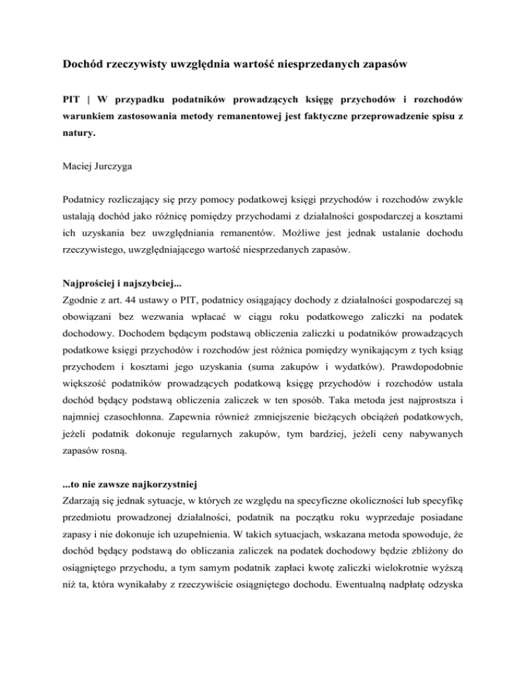 Dochód rzeczywisty uwzględnia wartość niesprzedanych zapasów PIT | W przypadku podatników prowadzących księgę przychodów i rozchodów warunkiem zastosowania metody remanentowej jest faktyczne przeprowadzenie spisu z natury. Maciej Jurczyga Podatnicy rozliczający się przy pomocy podatkowej księgi przychodów i rozchodów zwykle ustalają dochód jako różnicę pomiędzy przychodami z działalności gospodarczej a kosztami ich uzyskania bez uwzględniania remanentów. Możliwe jest jednak ustalanie dochodu rzeczywistego, uwzględniającego wartość niesprzedanych zapasów. Najprościej i najszybciej... Zgodnie z art. 44 ustawy o PIT, podatnicy osiągający dochody z działalności gospodarczej są obowiązani bez wezwania wpłacać w ciągu roku podatkowego zaliczki na podatek dochodowy. Dochodem będącym podstawą obliczenia zaliczki u podatników prowadzących podatkowe księgi przychodów i rozchodów jest różnica pomiędzy wynikającym z tych ksiąg przychodem i kosztami jego uzyskania (suma zakupów i wydatków). Prawdopodobnie większość podatników prowadzących podatkową księgę przychodów i rozchodów ustala dochód będący podstawą obliczenia zaliczek w ten sposób. Taka metoda jest najprostsza i najmniej czasochłonna. Zapewnia również zmniejszenie bieżących obciążeń podatkowych, jeżeli podatnik dokonuje regularnych zakupów, tym bardziej, jeżeli ceny nabywanych zapasów rosną. ...to nie zawsze najkorzystniej Zdarzają się jednak sytuacje, w których ze względu na specyficzne okoliczności lub specyfikę przedmiotu prowadzonej działalności, podatnik na początku roku wyprzedaje posiadane zapasy i nie dokonuje ich uzupełnienia. W takich sytuacjach, wskazana metoda spowoduje, że dochód będący podstawą do obliczania zaliczek na podatek dochodowy będzie zbliżony do osiągniętego przychodu, a tym samym podatnik zapłaci kwotę zaliczki wielokrotnie wyższą niż ta, która wynikałaby z rzeczywiście osiągniętego dochodu. Ewentualną nadpłatę odzyska zaś dopiero w momencie rozliczenia rocznego, w którym obowiązkowo uwzględni remanent końcowy. Przykład Krótko po rozpoczęciu roku podatnik – Krzysztof Majewski podjął decyzję o zamknięciu jednego z czterech punktów handlowych, w związku z czym przesunął towar do innych punktów i równocześnie ograniczył bieżące zakupy towarów. Wartość zapasów w każdym z punktów wynosi stale około 20 000 zł. Przychód uzyskany w styczniu przez pana Krzysztofa wyniósł 100 000 zł, natomiast koszty uzyskania przychodu 40 000 zł. Dochód obliczony według metody uproszczonej wyniesie: 100 000 zł – 40 000 zł = 60 000 zł. Jeżeli jednak pan Krzysztof ustaliłby dochód z uwzględnieniem różnic remanentowych, to dochód ten byłby skorygowany o: KONIEC PRZYKŁADU 20 000 zł x 4 – 20 000 zł x 3 = 20 000 zł. Można wybrać inny sposób W takich sytuacjach, aby uniknąć negatywnych skutków w zakresie podatku dochodowego, podatnicy mogą wybrać metodę obliczenia dochodu z uwzględnieniem tzw. różnic remanentowych. Pozwala na to wskazany wcześniej art. 44 ustawy o PIT, odsyłający do art. 24 ust. 2 ustawy o PIT. Ten drugi przepis stanowi, że jeżeli podatnik na koniec miesiąca sporządza remanent towarów, surowców i materiałów pomocniczych, to dochód ustala się jako różnicę pomiędzy przychodem a kosztami uzyskania: powiększoną o różnicę pomiędzy wartością remanentu końcowego i początkowego (jeżeli wartość remanentu końcowego jest wyższa niż wartość remanentu początkowego) lub pomniejszoną o różnicę pomiędzy wartością remanentu początkowego i końcowego (jeżeli wartość remanentu początkowego jest wyższa). Obliczenie dochodu jest tutaj analogiczne do jego ustalenia na koniec roku, z tą różnicą, że pod uwagę bierze się wartość remanentu na koniec danego miesiąca lub kwartału. Pozytywne skutki tej metody w zakresie wysokości podatku dochodowego wystąpią, gdy wartość remanentu na koniec danego miesiąca jest niższa niż wartość remanentu początkowego. Dochód obliczony w sposób uproszczony jest wtedy pomniejszany o różnicę pomiędzy wartością remanentu początkowego i remanentu końcowego. Trzeba zawiadomić organ Nie można jednak zapomnieć, że w przypadku podatników prowadzących podatkową księgę przychodów i rozchodów warunkiem zastosowania tej metody jest faktyczne przeprowadzenie spisu z natury, łącznie z uprzednim powiadomieniem właściwego naczelnika urzędu skarbowego o zamiarze jego przeprowadzenia w terminie co najmniej 7 dni przed datą sporządzenia tego spisu. Decyduje o tym § 28 ust. 4 rozporządzenia ministra finansów z 26 sierpnia 2003 r. w sprawie prowadzenia podatkowej księgi przychodów i rozchodów. Nie ma przy tym konieczności comiesięcznego informowania o przeprowadzeniu spisu, gdyż informację o takim zamiarze można zawrzeć w piśmie składanym do 24 stycznia każdego roku. Termin ten wynika z obowiązku informowania organu podatkowego na 7 dni naprzód o zamiarze przeprowadzenia spisu z natury. Trzeba natomiast mieć na uwadze, że przeprowadzenie spisu może zostać skontrolowane przez pracowników urzędu skarbowego. Dlatego decydując się na to rozwiązanie, spis należy faktycznie przeprowadzać. Dwie opcje W przypadku wyboru metody remanentowej, obliczenie różnicy remanentowej można przeprowadzić na dwa sposoby. Pierwsza metoda to ustalanie dochodu za każdy miesiąc z osobna, z uwzględnieniem wartości remanentu na początek i koniec danego miesiąca, a następnie sumowanie tak otrzymanych wyników. Prawidłowość takiego rozwiązania potwierdził Naczelny Sąd Administracyjny w wyroku z 5 lutego 1997 r. (I SA/Lu 408/96). Druga metoda to sumowanie przychodów i kosztów ich uzyskania od początku roku, obliczenie różnicy pomiędzy tymi wielkościami i korekta o różnicę pomiędzy wartością remanentu na początek roku i koniec aktualnego m