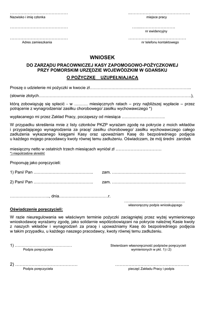 wniosek o pożyczkę UZUPEŁNIAJACĄ