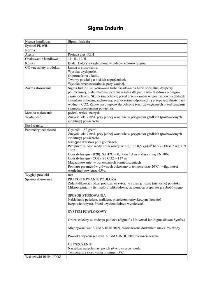 Sigma Indurin Nazwa handlowa Symbol PKWiU Norma Atesty Opakowanie handlowe Kolory Główne zalety produktu: Zakres stosowania Metoda malowania Wydajność Ilość warstw Parametry techniczne Wygląd powłoki Sposób stosowania Sigma Indurin Posiada atest PZH 1l., 4l., 12,5l. Biała i kolory uwzględnione w palecie kolorów Sigma. Łatwa w stosowaniu. Wysoka wydajność. Odporność na alkalia. Tworzy powłokę o niskich naprężeniach. Wysoka przepuszczalność pary wodnej. Sigma Indurin, silikonowana farba fasadowa na bazie specjalnej dyspersji polimerowej, biała, matowa, przepuszczalna dla par. Farba fasadowa o długim czasie ochrony. Skuteczną ochronę przed przenikaniem wilgoci zapewnia dodatek związków silikonu, zachowując jednocześnie odpowiednią przepuszczalność pary wodnej i CO2. Zapewnia długotrwałą ochronę ścian zewnętrznych przed opadami i zanieczyszczeniami powietrza. pędzel, wałek, natrysk Zużycie: ok. 7 m2/l. przy jednej warstwie w przypadku gładkich (pozbawionych struktury) powierzchni Gęstość: 1,52 g/cm3 Zużycie: ok. 7 m2/l. przy jednej warstwie w przypadku gładkich (pozbawionych struktury) powierzchni Następna warstwa po 5 godzinach Przepuszczalność wody deszczowej: w = 0,1 do 0,5 kg/(m2 h1/2) – klasa 2 wg. EN 1062 Opór dyfuzyjny (H20): Sd H2O = 0,14 do 1,4 m – klasa 2 wg EN 1062 Opór dyfuzyjny (CO2): Sd CO2 = 117 m Magazynowanie: w ogrzewanych pomieszczeniach Pomiaru parametrów głównych dokonano w temperaturze 20oC i wilgotności względnej powietrza 65%. mat PRZYGOTOWANIE PODŁOŻA Zidentyfikować rodzaj podłoża, oczyścić je i usunąć luźne (nienośne) powłoki. Mikroorganizmy (ich naloty) zlikwidować za pomocą preparatu grzybobójczego SPOSÓB STOSOWANIA Nakładanie pędzlem, wałkiem, pistoletem natryskowym (również bezpowietrznym). Przed użyciem dobrze wymieszać. SYSTEM POWŁOKOWY Grunt: zależny od rodzaju podłoża (Sigmafix Universal lub Sigmasiloxan Synfix.) Międzywarstwa: SIGMA INDURIN, rozcieńczona dodatkiem maks. 5% wody Powłoka wykończeniowa: SIGMA INDURIN, nierozcieńczona CZYSZCZENIE Narzędzia natychmiast po ich użyciu czyścić wodą. Temperatura stosowania minimum 5oC. Wskazówki BHP i PPOŻ KARTA BEZPIECZEŃSTWA I CHARAKTERYSTYKI zgodna z dyrektywą Unii Europejskiej nr 93/112/EC INDURIN Wersja 2.0 Data wydruku 17/01/2003 1. DANE NA TEMAT PRODUKTU I JEGO PRODUCENTA Informacja o produkcie Nazwa handlowa : INDURIN PRODUCENT Telefon Fax : Sigma Coatings GmbH Kluesenerstr. 54 44805 Bochum : + 492348690 : + 49234869358 Telefon awaryjny : + 49 234 869-236 2. INFORMACJE NA TEMAT SKŁADU PRODUKTU Zgodnie z dyrektywą Unii Europejskiej nr 67/548/EG produkt nie zawiera żadnych niebezpiecznych składników. 3. INFORMACJE NA TEMAT ZAGROŻEŃ I ŚRODKÓW OSTROŻNOŚCI Środki ostrożności (S) : S2 S46 - chronić przed dziećmi - w razie połknięcia niezwłocznie zasięgnij porady lekarza - pokaż opakowanie lub etykietę Uwaga : produkt nie zawiera żadnych niebezpiecznych substancji w rozumieniu zarządzenia dotyczącego substancji niebezpiecznych oraz wg dyrektyw Unii Europejskiej 67/548/EWG i 99/45/EC 4. PIERWSZA POMOC Uwagi ogólne Kontakt z oczami Kontakt ze skórą Inhalacja Połknięcie Przy utrzymywaniu się symptomów kontaktu z produktem lub w przypadku wątpliwości zasięgnąć porady lekarskiej. Nigdy osobie nieprzytomnej nie podawać czegokolwiek doustnie. Podrażnione oczy obficie przemyć czystą, bieżącą wodą przez co najmniej 10 minut odchylając przez ten czas powieki. Usunąć soczewki kontaktowe. Zasięgnąć porady lekarskiej. Natychmiast zdjąć skażoną odzież. Wyczyścić gruntownie skórą mydłem i wodą lub odpowiednim środkiem do mycia skóry. Nie UŻYWAĆ rozpuszczalników ani rozcieńczalników. Wyprowadzić na świeże powietrze. Ubrać ciepło i pozostawić w spokoju. Jeżeli oddech jest nieregularny lub zatrzymany, zastosować środki wspomagające oddychanie. Nieprzytomnego ocucić i zasięgnąć porady lekarskiej. W przypadku połknięcia natychmiast sprowadzić pomoc lekarską. Pozostawić w spokoju. Nie wywoływać wymiotów. 5. ZAPOBIEGANIE ROZPRZESTRZENIANIU SIĘ I ZWALCZANIE OGNIA Specyficzne uwagi w czasie zwalczania ognia Zamknięte pojemniki narażone na działanie ognia należy chłodzić kurtyną wody. Nie dopuszczać do przedostawania się wody użytej do chłodzenia do rowów odwadniających lub cieków wodnych. niepotrzebne Specjalne wyposażenie ochronne strażaków Dostępne środki gaśnicze produkt niepalny Środki gaśnicze które bezwarunkowo nie mogą być użyte nie ma 1/1 KARTA BEZPIECZEŃSTWA I CHARAKTERYSTYKI zgodna z dyrektywą Unii Europejskiej nr 93/112/EC INDURIN Wersja 2.0 Data wydruku 17/01/2003 6. DZIAŁANIA DO PODJĘCIA PO ROZPOSTRZENIENIU SIĘ PRODUKTU Osobiste środki ochronne Używać środków ochrony osobistej. Wietrzyć pomieszczenia. Przestrzegać środków wymienionych w punktach 7 i 8. Nosić środki ochrony dróg oddechowych. Produkt wylany na podłoże może spowodować, że będzie ono śliskie. Zapobiegać przedostawaniu się produktu do rowów odwadniających lub cieków Środki ochraniające wodnych. Jeżeli zanieczyszczone zostaną rzeki, jeziora lub rowy odwadniające środowisko powiadomić odpowiednie służby. Czyścić detergentami. Unikać rozpuszczalników. Przechowywać i magazynować razem z Metody czyszczenia niepalnymi materiałami absorbującymi (np. piasek, ziemia, ziemią okrzemkową wermikulitem) i umieszczać w pojemnikach zgodnych z lokalnymi regulacjami prawnymi. Specyficzne uregulowania dla danego kraju znajdują się w punkcie 15. Dodatkowe informacje 7. UŻYTKOWANIE I PRZECHOWYWANIE Użytkowanie Zasady bezpiecznego użytkowania Przechowywanie Wymagania dotyczące magazynów i pojemników Wskazówki dotyczące przechowywania z innymi materiałami Nie dopuszczać do przekraczania maksymalnych dopuszczalnych stężeń podanych w punkcie 8. Stosować tylko w miejscach zaopatrzonych w odpowiednią wentyla