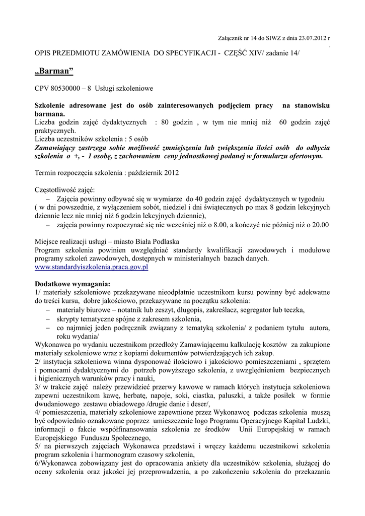 Załącznik nr 14 do SIWZ z dnia 23.07.2012 r . OPIS PRZEDMIOTU ZAMÓWIENIA DO SPECYFIKACJI - CZĘŚĆ XIV/ zadanie 14/ „Barman” CPV 80530000 – 8 Usługi szkoleniowe Szkolenie adresowane jest do osób zainteresowanych podjęciem pracy na stanowisku barmana. Liczba godzin zajęć dydaktycznych : 80 godzin , w tym nie mniej niŜ 60 godzin zajęć praktycznych. Liczba uczestników szkolenia : 5 osób Zamawiający zastrzega sobie moŜliwość zmniejszenia lub zwiększenia ilości osób do odbycia szkolenia o +, - 1 osobę, z zachowaniem ceny jednostkowej podanej w formularzu ofertowym. Termin rozpoczęcia szkolenia : październik 2012 Częstotliwość zajęć: − Zajęcia powinny odbywać się w wymiarze do 40 godzin zajęć dydaktycznych w tygodniu ( w dni powszednie, z wyłączeniem sobót, niedziel i dni świątecznych po max 8 godzin lekcyjnych dziennie lecz nie mniej niŜ 6 godzin lekcyjnych dziennie), − zajęcia powinny rozpoczynać się nie wcześniej niŜ o 8.00, a kończyć nie później niŜ o 20.00 Miejsce realizacji usługi – miasto Biała Podlaska Program szkolenia powinien uwzględniać standardy kwalifikacji zawodowych i modułowe programy szkoleń zawodowych, dostępnych w ministerialnych bazach danych. www.standardyiszkolenia.praca.gov.pl Dodatkowe wymagania: 1/ materiały szkoleniowe przekazywane nieodpłatnie uczestnikom kursu powinny być adekwatne do treści kursu, dobre jakościowo, przekazywane na początku szkolenia: − materiały biurowe – notatnik lub zeszyt, długopis, zakreślacz, segregator lub teczka, − skrypty tematyczne spójne z zakresem szkolenia, − co najmniej jeden podręcznik związany z tematyką szkolenia/ z podaniem tytułu autora, roku wydania/ Wykonawca po wydaniu uczestnikom przedłoŜy Zamawiającemu kalkulację kosztów za zakupione materiały szkoleniowe wraz z kopiami dokumentów potwierdzających ich zakup. 2/ instytucja szkoleniowa winna dysponować ilościowo i jakościowo pomieszczeniami , sprzętem i pomocami dydaktycznymi do potrzeb powyŜszego szkolenia, z uwzględnieniem bezpiecznych i higienicznych warunków pracy i nauki, 3/ w trakcie zajęć naleŜy przewidzieć przerwy kawowe w ramach których instytucja szkoleniowa zapewni uczestnikom kawę, herbatę, napoje, soki, ciastka, paluszki, a takŜe posiłek w formie dwudaniowego zestawu obiadowego /drugie danie i deser/, 4/ pomieszczenia, materiały szkoleniowe zapewnione przez Wykonawcę podczas szkolenia muszą być odpowiednio oznakowane poprzez umieszczenie logo Programu Operacyjnego Kapitał Ludzki, informacji o fakcie współfinansowania szkolenia ze środków Unii Europejskiej w ramach Europejskiego Funduszu Społecznego, 5/ na pierwszych zajęciach Wykonawca przedstawi i wręczy kaŜdemu uczestnikowi szkolenia program szkolenia i harmonogram czasowy szkolenia, 6/Wykonawca zobowiązany jest do opracowania ankiety dla uczestników szkolenia, słuŜącej do oceny szkolenia oraz jakości jej przeprowadzenia, a po zakończeniu szkolenia do przekazania Zamawiającemu wyników badania opinii uczestników szkolenia wraz z kopiami ankiet 7/w ramach realizacji zamówienia Wykonawca zapewni badania lekarskie w tym badania sanepid wymagane przy udziale w kursie, 8/ Wykonawca dokona ubezpieczenia NNW na czas uczestnictwa w szkoleniu, 9/ Wykonawca dokona końcowego sprawdzenia wiadomości egzaminem wewnętrznym i wyda uczestnikom zaświadczenia o ukończeniu szkolenia. 10/ Wykonawca przekaŜe Zamawiającemu po zakończeniu szkolenia: oryginały list obecności; /obecność na zajęciach uczestnik potwierdza własnoręcznym podpisem/, kopie dziennika zajęć, rejestr wydanych oraz kopie zaświadczeń/certyfikatów potwierdzających ukończenie szkolenia, oświadczeń uczestników potwierdzających odbiór materiałów szkoleniowych wraz z kopiami dokumentów potwierdzających ich zakup, potwierdzenie przez uczestników odbioru gorących posiłków, kopie zaświadczeń z przeprowadzonych badań lekarskich.