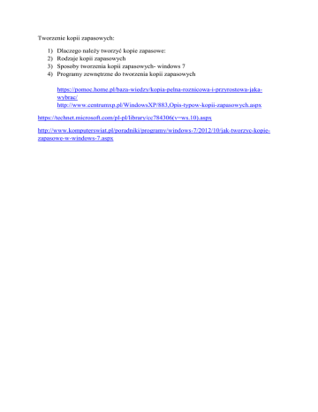 Tworzenie kopii zapasowych: 1) 2) 3) 4) Dlaczego należy tworzyć kopie zapasowe: Rodzaje kopii zapasowych Sposoby tworzenia kopii zapasowych- windows 7 Programy zewnętrzne do tworzenia kopii zapasowych https://pomoc.home.pl/baza-wiedzy/kopia-pelna-roznicowa-i-przyrostowa-jakawybrac/ http://www.centrumxp.pl/WindowsXP/883,Opis-typow-kopii-zapasowych.aspx https://technet.microsoft.com/pl-pl/library/cc784306(v=ws.10).aspx http://www.komputerswiat.pl/poradniki/programy/windows-7/2012/10/jak-tworzyc-kopiezapasowe-w-windows-7.aspx