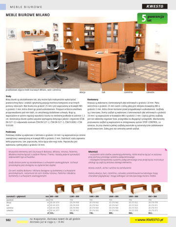 MEBLE BIUROWE 5 MEBLE BIUROWE MILANO przykładowe zdjęcie mebli biurowych Milano, wzór czereśnia akacja Stoły Blaty biurek są ukształtowane tak, aby można było maksymalnie wykorzystać powierzchnię blatu i znaleźć optymalną pozycję monitora komputera oraz innych pomocy roboczych. Blat biurka ma grubość 25 mm i jest wyposażony w krawędź ABS o grubości 2 mm, która chroni go przed uszkodzeniem. Przepust w blacie umożliwia przeprowadzenie pod nim kabli, co umożliwiają dodatkowe uchwyty. Nogi są wyposażone w system regulacji wysokości biurka na nierównej podłodze w zakresie 1,5 cm. Konstrukcja biurek spełnia wysokie wymagania dotyczące jakości i ergonomii (ČSN EN 527–1) i odpowiada normom ČSN EN 527–2, ČSN EN 527–3, ČSN 910001 i ČSN 910100. buk czereśnia gwarancja lat calvados Kontenery Korpusy są wykonane z laminowanych płyt wiórowych o grubości 18 mm. Płyta wierzchnia o grubości 25 mm razem z dolną płytą jest oklejona krawędzią ABS o grubości 2 mm, która chroni kontener przed przypadkowym uszkodzeniem. Szuflady są z tworzywa, fronty szuflad są wykonane z laminowanych płyt wiórowych o grubości 18 mm i są wyposażone w krawędzie ABS o grubości 2 mm. Częścią górnej szuflady jest też oddzielny organizer (tzw. przegródka na długopisy) i przegródki. Mechanizmy przesuwania szuflad są wyposażone w zintegrowany system STOP–CONTROL, co oznacza, że przy otwarciu jednej szuflady pozostałe są automatycznie zablokowane przed otwarciem. Zaletą jest też centralny zamek szuflad. Podstawy Podstawy stołów są wykonane z laminatu o grubości 18 mm i są wyposażone po stronie zewnętrznej i wewnętrznej w krawędź ABS o grubości 2 mm. Stabilność stołu zapewnia belka poprzeczna, tzw. poprzeczka, która łączy obie nogi stołu. Poprzeczka jest wykonana z pełnej płyty o grubości 18 mm. Wszystkie elementy serii biurowych Bolzano, Milano, Verona, Palermo, Modena można łączyć z szafami Roma i Trento. Należy jedynie sprawdzić odpowiedni typ uchwytów. Szafy dostarczane są standardowo z uchwytem zaokrąglonym. Uchwyt prostokątny jest dostępny na żądanie bez dopłat. Do serii stołów Bolzano i Milano dostępne są kontenery z uchwytami prostokątnymi, natomiast do serii stołów Verona, Palermo i Modena kontenery z uchwytami zaokrąglonymi. Montaż – wszystkie serie stołów zawierają elementy, które można łączyć w zestawy przy pomocy prostego systemu połączeniowego – niezbędne komponenty systemu połączeniowego oraz przejrzysta instrukcja obsługi są częścią zestawu danego elementu Wzory orzech, olcha i wiśnia na zamówienie. Kolory akacja, buk, czereśnia, calvados prezentowane w katalogu mają charakter poglądowy i mogą odbiegać od rzeczywistego koloru mebla. szerokość × głębokość mm 800 × 800 1200 × 800 1400 × 800 1600 × 800 1800 × 800 850 × 800 wysokość akacja buk czereśnia calwados mm nr nr nr nr zł 755 2D 276 958 2D 276 959 2D 276 960 2D 276 961 656,- 755 2D 276 962 2D 276 963 2D 276 964 2D 276 965 738,- 755 2D 276 966 2D 276 967 2D 276 968 2D 276 969 800,- 755 2D 272 921 2D 272 922 2D 272 923 2D 272 925 866,- 755 2D 276 970 2D 276 971 2D 276 972 2D 276 973 812,- 502 755 2D 341 874 2D 341 875 2D 341 876 2D 341 877 533,- n a ma g az y n i e , d o s t aw a n awe t d o 4 8 g o dzin dos taw a j u ż w ci ąg u 5 – 8 d n i • www.KWESTO.pl