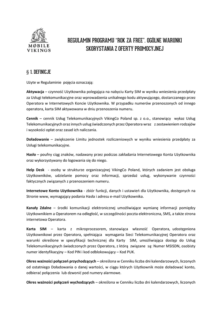 REGULAMIN PROGRAMU “ROK ZA FREE”. OGÓLNE WARUNKI SKORYSTANIA Z OFERTY PROMOCYJNEJ § 1. DEFINICJE Użyte w Regulaminie pojęcia oznaczają: Aktywacja – czynność Użytkownika polegająca na nabyciu Karty SIM w wyniku wniesienia przedpłaty za Usługi telekomunikacyjne oraz wprowadzenia unikalnego kodu aktywującego, dostarczanego przez Operatora w Internetowych Koncie Użytkownika. W przypadku numerów przenoszonych od innego operatora, karta SIM aktywowana w dniu przenoszenia numeru. Cennik – cennik Usług Telekomunikacyjnych VikingCo Poland sp. z o.o., stanowiący wykaz Usług Telekomunikacyjnych oraz innych usług świadczonych przez Operatora wraz z zestawieniem rodzajów i wysokości opłat oraz zasad ich naliczania. Doładowanie – zwiększenie Limitu jednostek rozliczeniowych w wyniku wniesienia przedpłaty za Usługi telekomunikacyjne. Hasło – poufny ciąg znaków, nadawany przez podczas zakładania Internetowego Konta Użytkownika oraz wykorzystywany do logowania się do niego. Help Desk - osoby w strukturze organizacyjnej VikingCo Poland, których zadaniem jest obsługa Użytkowników, udzielanie pomocy oraz informacji, sprzedaż usług, wykonywanie czynności faktycznych związanych z przenoszeniem numeru. Internetowe Konto Użytkownika - zbiór funkcji, danych i ustawień dla Użytkownika, dostępnych na Stronie www, wymagający podania Hasła i adresu e-mail Użytkownika. Kanały Zdalne – środki komunikacji elektronicznej umożliwiające wymianę informacji pomiędzy Użytkownikiem a Operatorem na odległość, w szczególności poczta elektroniczna, SMS, a także strona internetowa Operatora. Karta SIM – karta z mikroprocesorem, stanowiąca własność Operatora, udostępniona Użytkownikowi przez Operatora, spełniająca wymagania Sieci Telekomunikacyjnej Operatora oraz warunki określone w specyfikacji technicznej dla Karty SIM, umożliwiająca dostęp do Usług Telekomunikacyjnych świadczonych przez Operatora, z którą związane są: Numer MSISDN, osobisty numer identyfikacyjny – Kod PIN i kod odblokowujący – Kod PUK. Okres ważności połączeń przychodzących – określona w Cenniku liczba dni kalendarzowych, liczonych od ostatniego Doładowania o danej wartości, w ciągu których Użytkownik może doładować konto, odbierać połączenia lub dzwonić pod numery alarmowe. Okres ważności połączeń wychodzących – określona w Cenniku liczba dni kalendarzowych, liczonych od ostatniego Doładowania konta Użytkownika o danej wartości, w ciągu których Użytkownik może inicjować połączenia, , kontaktować się z Help Desk, numerami alarmowymi lub wykonywać inne czynności, określone w Cenniku. Ostatni dzień ważności konta przychodzących. Użytkownika – ostatni dzień Okresu ważności połączeń Oferta Promocyjna – dokument zawierający warunki świadczenia Usług Telekomunikacyjnych inne niż określone w Regulaminie i Cenniku. Pakiet Play Viking – usługa w wartości 8 PLN, której aktywacja umożliwia wykonywanie nielimitowanych połączeń przez 31 dni do sieci Mobile Vikings, Play, Red Bull Mobile, Virgin Mobile, Truphone, Netia Mobile oraz Tele25 Polecający – przyszły Użytkownik, który w procesie rejestracji w odpowiednim polu znajdującym się pod hasłem „Nagrodź znajomego” na stronie internetowej www.mobilevikings.pl podczas rejestracji wpisze numer telefonu w formacie 48xxxxxxxxx lub adres e-mailowy Użytkownika, od którego dowiedziała się o sieci Mobile Vikings. Punkty Vikinga – jednostka wymienna na doładowania w sieci Mobile Vikings, przyznawana Użytkownikom za polecanie oferty Mobile Vikings przyszłym Użytkownikom. 10 Punktów Vikinga odpowiada 1 PLN. Polecony – Użytkownik sieci Mobile Vikings , którego numer telefonu lub adres e-mail zostanie wpisany w odpowiednie pole znajdujące się pod hasłem „Nagrodź znajomego” na stronie internetowej www.mobilevikings.pl podczas rejestracji. Prawo Telekomunikacyjne – ustawa z dnia 16 lipca 2004 r. – Prawo telekomunikacyjne (Dz.U. nr171 poz. 1800 ze zm.). Regulamin – niniejszy dokument. Sieć Telekomunikacyjna – sieć telekomunikacyjna w rozumieniu Prawa Telekomunikacyjnego, wykorzystywana przez Operatora do świadczenia Usług Telekomunikacyjnych. Strona www - strona internetowa Sieci Mobile Vikings, dostępna pod domeną www.mobilevikings.pl. Telefon – urządzenie elektroniczne umożliwiające za pośrednictwem Karty SIM korzystanie z usług świadczonych przez Operatora, posiadające odpowiedni dokument lub oznaczenie zgodności z obowiązującymi przepisami prawa, dopuszczone do pracy w Sieci Telekomunikacyjnej. Umowa – umowa o świadczenie usług telekomunikacyjnych zawarta z VikingCo Poland poprzez uaktywnienie w telefonie Karty SIM, na podstawie której VikingCo Poland zobowiązuje się do świadczenia usług telekomunikacyjnych dla Użytkownika zgodnie z Regulaminem świadczenia Usług Telekomunikacyjnych. Usługa Telekomunikacyjna – usługa w rozumieniu Prawa Telekomunikacyjnego, świadczona Użytkownikowi przez Operatora. Użytkownik – osoba fizyczna, osoba prawna, jednostka organizacyjna nieposiadająca osobowości prawnej, która nie jest stroną pisemnej Umowy, korzystająca z usług przedpłaconych, która zawarła z Operatorem Umowę poprzez uaktywnienie w telefonie Karty SIM. VikingCo Poland – VikingCo Poland sp. z o.o. z siedzibą we Wrocławiu, ul. Tęczowa 13/210, 53-601 Wrocław, wpisana do rejestru przedsiębiorców prowadzonego przez Sąd Rejonowy dla Wrocławia Fabrycznej, VI Wydział Gospodarczy Krajowego Rejestru Sądowego, pod numerem KRS 0000484436, NIP 8971793639 i o numerze REGON 022284492 z kapitałem zakładowym w wysokości 2 000 000 PLN. Zużycie – wykorzystanie przez Użytkownika określonej liczby jednostek rozliczeniowych z Pakietu. § 2. ZASADY OGÓLNE 1. Organizatorem promocji „Rok za free” jest VikingCo Poland. 2. Promocja jest skierowana do przyszłych i obecnych Użytkowni