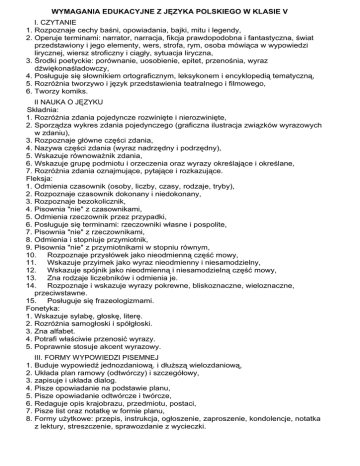WYMAGANIA EDUKACYJNE Z JĘZYKA POLSKIEGO W KLASIE V I. CZYTANIE 1. Rozpoznaje cechy baśni, opowiadania, bajki, mitu i legendy, 2. Operuje terminami: narrator, narracja, fikcja prawdopodobna i fantastyczna, świat przedstawiony i jego elementy, wers, strofa, rym, osoba mówiąca w wypowiedzi lirycznej, wiersz stroficzny i ciągły, sytuacja liryczna, 3. Środki poetyckie: porównanie, uosobienie, epitet, przenośnia, wyraz dźwiękonaśladowczy, 4. Posługuje się słownikiem ortograficznym, leksykonem i encyklopedią tematyczną, 5. RozróŜnia tworzywo i język przedstawienia teatralnego i filmowego, 6. Tworzy komiks. II NAUKA O JĘZYKU Składnia: 1. RozróŜnia zdania pojedyncze rozwinięte i nierozwinięte, 2. Sporządza wykres zdania pojedynczego (graficzna ilustracja związków wyrazowych w zdaniu), 3. Rozpoznaje główne części zdania, 4. Nazywa części zdania (wyraz nadrzędny i podrzędny), 5. Wskazuje równowaŜnik zdania, 6. Wskazuje grupę podmiotu i orzeczenia oraz wyrazy określające i określane, 7. RozróŜnia zdania oznajmujące, pytające i rozkazujące. Fleksja: 1. Odmienia czasownik (osoby, liczby, czasy, rodzaje, tryby), 2. Rozpoznaje czasownik dokonany i niedokonany, 3. Rozpoznaje bezokolicznik, 4. Pisownia "nie" z czasownikami, 5. Odmienia rzeczownik przez przypadki, 6. Posługuje się terminami: rzeczowniki własne i pospolite, 7. Pisownia "nie" z rzeczownikami, 8. Odmienia i stopniuje przymiotnik, 9. Pisownia "nie" z przymiotnikami w stopniu równym, 10. Rozpoznaje przysłówek jako nieodmienną część mowy, 11. Wskazuje przyimek jako wyraz nieodmienny i niesamodzielny, 12. Wskazuje spójnik jako nieodmienną i niesamodzielną część mowy, 13. Zna rodzaje liczebników i odmienia je. 14. Rozpoznaje i wskazuje wyrazy pokrewne, bliskoznaczne, wieloznaczne, przeciwstawne. 15. Posługuje się frazeologizmami. Fonetyka: 1. Wskazuje sylabę, głoskę, literę. 2. RozróŜnia samogłoski i spółgłoski. 3. Zna alfabet. 4. Potrafi właściwie przenosić wyrazy. 5. Poprawnie stosuje akcent wyrazowy. III. FORMY WYPOWIEDZI PISEMNEJ 1. Buduje wypowiedź jednozdaniową. i dłuŜszą wielozdaniową, 2. Układa plan ramowy (odtwórczy) i szczegółowy, 3. zapisuje i układa dialog. 4. Pisze opowiadanie na podstawie planu, 5. Pisze opowiadanie odtwórcze i twórcze, 6. Redaguje opis krajobrazu, przedmiotu, postaci, 7. Pisze list oraz notatkę w formie planu, 8. Formy uŜytkowe: przepis, instrukcja, ogłoszenie, zaproszenie, kondolencje, notatka z lektury, streszczenie, sprawozdanie z wycieczki. IV ORTOGRAFIA I INTERPUNKCJA Zna następujące zasady pisowni: • - z ó, rz, Ŝ, h, ch wymiennym i niewymiennym • - u • - wielką literą • - zakończeń bezokolicznika • - zakończeń form czasu przeszłego • - ę, en, em, ą, on, om • - ę, -en, -ą, -om w końcówkach fleksyjnych wyrazów • -spółgłosek miękkich • -przyimków z rzeczownikiem • -"nie" z poznanymi częściami mowy • - interpunkcja - zdanie pojedyncze i złoŜone • - zakończenia bezokoliczników -ść, -Ŝć • - i, j, po spółgłoskach • - pisownia form trybu przypuszczającego • - pisownia liczebników WYMAGANIA EDUKACYJE Z JĘZYKA POLSKIEGO W KLASIE V NA POSZCZEGÓLNE OCENY: OCENĘ CELUJĄCĄ (wymagania wykraczające) otrzymuje uczeń, którego wiedza znacznie wykracza poza obowiązujący program nauczania. - Twórczo i samodzielnie rozwija własne uzdolnienia i zainteresowania. - Proponuje rozwiązania oryginalne i wykraczające poza materiał programowy. - Jego wypowiedzi ustne i pisemne są bezbłędne oraz cechują się dojrzałością myślenia. - Nie powiela cudzych poglądów, potrafi krytycznie ustosunkować się do językowej, literackiej i kulturalnej rzeczywistości. - Bierze udział i osiąga sukcesy w konkursach szkolnych, międzyszkolnych. - Podejmuje działalność literacką lub kulturalną w róŜnych formach (np. udział w akademiach, inscenizacje teatralne, współpraca ze szkolną. gazetkę itd.), prezentuje wysoki poziom merytoryczny oraz artystyczny. - Posiada poszerzone umiejętności z zakresu kształcenia językowego oraz nauki o języku przewidziane programem nauczania w klasie V. - Wykazuje ponadprogramowe umiejętności w zakresie kształcenia literackiego i kulturalnego. -Czyta lektury uzupełniające (dzienniczek lektur). OCENĘ BARDZO DOBRĄ (wymagania dopełniające) otrzymuje uczeń, który opanował pełny zakres wiadomości określony programem nauczania dla klasy V. Kształcenie literackie i kulturowe - Uczeń buduje wypowiedzi (ustne i pisemne) całkowicie poprawne pod względem stylistyczne -językowym, ortograficznym, merytorycznym i logicznym. - Umie skoncentrować uwagę na dłuŜszej wypowiedzi, określić temat tekstu i intencji nadawcy. - Potrafi czytać teksty o róŜnym zabarwieniu emocjonalnym, czyta ze zrozumieniem. - Doskonale potrafi posługiwać się poznanymi w klasie piątej formami wypowiedzi (rozmowa, przemówienie, Ŝyczenia, podziękowanie, powitanie, poŜegnanie; opis przedmiotu, wyglądu człowieka z elementami charakterystyki; opowiadanie twórcze; list prywatny; zaproszenie, sprawozdanie z wydarzenia). - Podejmuje próby charakterystyki postaci (na wyrazistych przykładach). - Samodzielnie sporządza notatki z czytanych lektur, streszczenia. - Bezbłędnie układa plan odtwórczy lektury, plan kompozycyjny własnej wypowiedzi. - Bardzo dobra znajomość przeczytanego tekstu pozwala na swobodne jego analizowanie, ocenię postępowania i poglądów bohaterów; pisanie opowiadania twórczego z elementami opisu, z dialogiem. - Zwraca uwagę na problematykę moralną. zawartą w poznanych lekturach. - Biegle posługuje się Słownikiem ortograficznym, Słownikiem wyrazów bliskoznacznych. - Potrafi określić cechy gatunkowe legendy, mitu, podania (fikcja realistyczna i fantastyczna), powieści przygodowej i obyczajowej (akcja, narrator, autor) oraz bajki. - Analizuje utwór liryczny (środki rymotwórcze, poetyckie obrazo