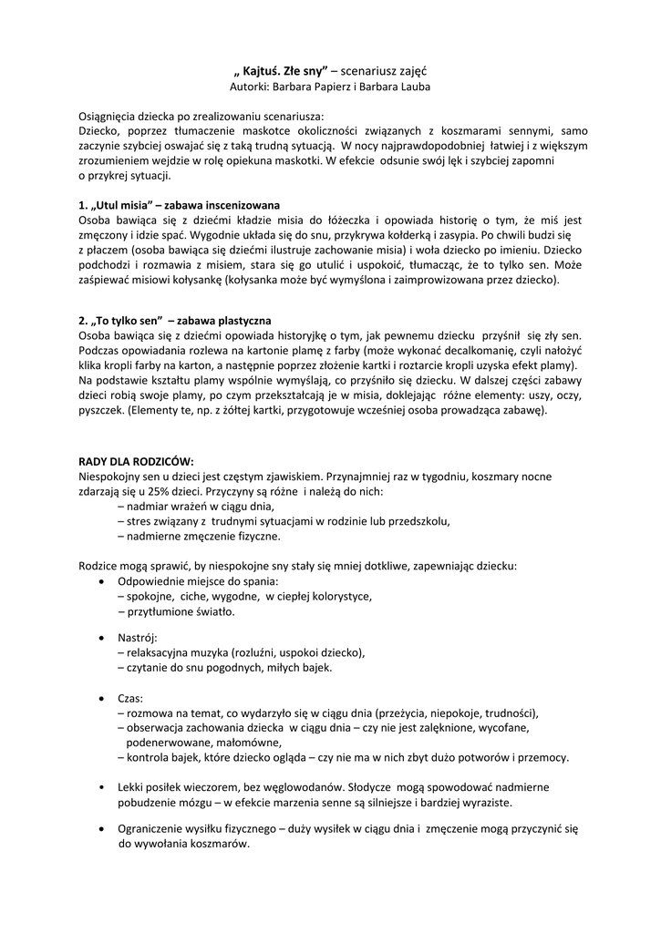 „ Kajtuś. Złe sny” – scenariusz zajęć Autorki: Barbara Papierz i Barbara Lauba Osiągnięcia dziecka po zrealizowaniu scenariusza: Dziecko, poprzez tłumaczenie maskotce okoliczności związanych z koszmarami sennymi, samo zaczynie szybciej oswajać się z taką trudną sytuacją. W nocy najprawdopodobniej łatwiej i z większym zrozumieniem wejdzie w rolę opiekuna maskotki. W efekcie odsunie swój lęk i szybciej zapomni o przykrej sytuacji. 1. „Utul misia” – zabawa inscenizowana Osoba bawiąca się z dziećmi kładzie misia do łóżeczka i opowiada historię o tym, że miś jest zmęczony i idzie spać. Wygodnie układa się do snu, przykrywa kołderką i zasypia. Po chwili budzi się z płaczem (osoba bawiąca się dziećmi ilustruje zachowanie misia) i woła dziecko po imieniu. Dziecko podchodzi i rozmawia z misiem, stara się go utulić i uspokoić, tłumacząc, że to tylko sen. Może zaśpiewać misiowi kołysankę (kołysanka może być wymyślona i zaimprowizowana przez dziecko). 2. „To tylko sen” – zabawa plastyczna Osoba bawiąca się z dziećmi opowiada historyjkę o tym, jak pewnemu dziecku przyśnił się zły sen. Podczas opowiadania rozlewa na kartonie plamę z farby (może wykonać decalkomanię, czyli nałożyć klika kropli farby na karton, a następnie poprzez złożenie kartki i roztarcie kropli uzyska efekt plamy). Na podstawie kształtu plamy wspólnie wymyślają, co przyśniło się dziecku. W dalszej części zabawy dzieci robią swoje plamy, po czym przekształcają je w misia, doklejając różne elementy: uszy, oczy, pyszczek. (Elementy te, np. z żółtej kartki, przygotowuje wcześniej osoba prowadząca zabawę). RADY DLA RODZICÓW: Niespokojny sen u dzieci jest częstym zjawiskiem. Przynajmniej raz w tygodniu, koszmary nocne zdarzają się u 25% dzieci. Przyczyny są różne i należą do nich: – nadmiar wrażeń w ciągu dnia, – stres związany z trudnymi sytuacjami w rodzinie lub przedszkolu, – nadmierne zmęczenie fizyczne. Rodzice mogą sprawić, by niespokojne sny stały się mniej dotkliwe, zapewniając dziecku: • Odpowiednie miejsce do spania: – spokojne, ciche, wygodne, w ciepłej kolorystyce, – przytłumione światło. • Nastrój: – relaksacyjna muzyka (rozluźni, uspokoi dziecko), – czytanie do snu pogodnych, miłych bajek. • Czas: – rozmowa na temat, co wydarzyło się w ciągu dnia (przeżycia, niepokoje, trudności), – obserwacja zachowania dziecka w ciągu dnia – czy nie jest zalęknione, wycofane, podenerwowane, małomówne, – kontrola bajek, które dziecko ogląda – czy nie ma w nich zbyt dużo potworów i przemocy. • Lekki posiłek wieczorem, bez węglowodanów. Słodycze mogą spowodować nadmierne pobudzenie mózgu – w efekcie marzenia senne są silniejsze i bardziej wyraziste. • Ograniczenie wysiłku fizycznego – duży wysiłek w ciągu dnia i zmęczenie mogą przyczynić się do wywołania koszmarów.