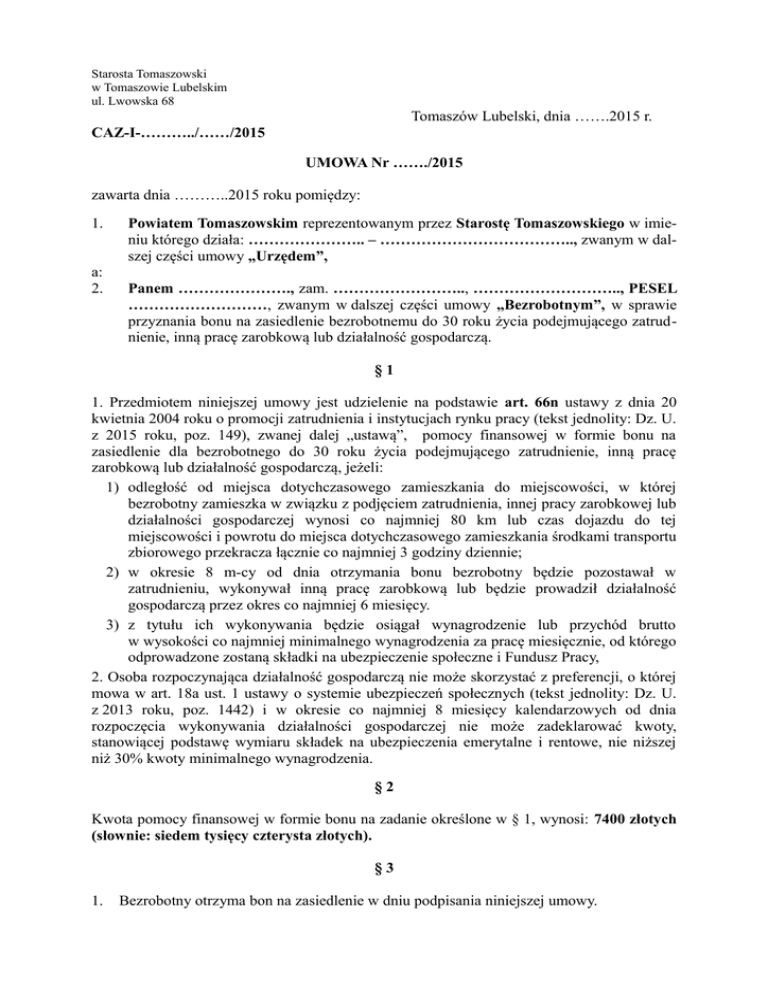 Starosta Tomaszowski w Tomaszowie Lubelskim ul. Lwowska 68 Tomaszów Lubelski, dnia …….2015 r. CAZ-I-………../……/2015 UMOWA Nr ……./2015 zawarta dnia ………..2015 roku pomiędzy: 1. a: 2. Powiatem Tomaszowskim reprezentowanym przez Starostę Tomaszowskiego w imieniu którego działa: ………………….. – ……………………………….., zwanym w dalszej części umowy „Urzędem”, Panem …………………., zam. …………………….., ……………………….., PESEL ………………………, zwanym w dalszej części umowy „Bezrobotnym”, w sprawie przyznania bonu na zasiedlenie bezrobotnemu do 30 roku życia podejmującego zatrudnienie, inną pracę zarobkową lub działalność gospodarczą. §1 1. Przedmiotem niniejszej umowy jest udzielenie na podstawie art. 66n ustawy z dnia 20 kwietnia 2004 roku o promocji zatrudnienia i instytucjach rynku pracy (tekst jednolity: Dz. U. z 2015 roku, poz. 149), zwanej dalej „ustawą”, pomocy finansowej w formie bonu na zasiedlenie dla bezrobotnego do 30 roku życia podejmującego zatrudnienie, inną pracę zarobkową lub działalność gospodarczą, jeżeli: 1) odległość od miejsca dotychczasowego zamieszkania do miejscowości, w której bezrobotny zamieszka w związku z podjęciem zatrudnienia, innej pracy zarobkowej lub działalności gospodarczej wynosi co najmniej 80 km lub czas dojazdu do tej miejscowości i powrotu do miejsca dotychczasowego zamieszkania środkami transportu zbiorowego przekracza łącznie co najmniej 3 godziny dziennie; 2) w okresie 8 m-cy od dnia otrzymania bonu bezrobotny będzie pozostawał w zatrudnieniu, wykonywał inną pracę zarobkową lub będzie prowadził działalność gospodarczą przez okres co najmniej 6 miesięcy. 3) z tytułu ich wykonywania będzie osiągał wynagrodzenie lub przychód brutto w wysokości co najmniej minimalnego wynagrodzenia za pracę miesięcznie, od którego odprowadzone zostaną składki na ubezpieczenie społeczne i Fundusz Pracy, 2. Osoba rozpoczynająca działalność gospodarczą nie może skorzystać z preferencji, o której mowa w art. 18a ust. 1 ustawy o systemie ubezpieczeń społecznych (tekst jednolity: Dz. U. z 2013 roku, poz. 1442) i w okresie co najmniej 8 miesięcy kalendarzowych od dnia rozpoczęcia wykonywania działalności gospodarczej nie może zadeklarować kwoty, stanowiącej podstawę wymiaru składek na ubezpieczenia emerytalne i rentowe, nie niższej niż 30% kwoty minimalnego wynagrodzenia. §2 Kwota pomocy finansowej w formie bonu na zadanie określone w § 1, wynosi: 7400 złotych (słownie: siedem tysięcy czterysta złotych). §3 1. Bezrobotny otrzyma bon na zasiedlenie w dniu podpisania niniejszej umowy. 2. Środki, o których mowa w § 2 wypłacone zostaną jednorazowo na wskazany rachunek bankowy bezrobotnego o nr………………………………, najpóźniej do dnia …………………. roku. 3. Przyznane środki powinny być wykorzystane na pokrycie kosztów zamieszkania związanych ze zmianą miejsca zamieszkania (np. czynsz za wynajem mieszkania itp.). §4 1. a) Po otrzymaniu bonu na zasiedlenie bezrobotny jest zobowiązany w terminie do: 30 dni od dnia otrzymania bonu na zasiedlenie dostarczyć do Urzędu dokument potwierdzający podjęcie zatrudnienia, innej pracy zarobkowej lub działalności gospodarczej, jeżeli z tytułu ich wykonywania będzie osiągał wynagrodzenie lub przychód brutto w wysokości co najmniej minimalnego wynagrodzenia za pracę miesięcznie od którego odprowadzone zostaną składki na ubezpieczenie społeczne i Fundusz Pracy wraz oświadczeniem w brzmieniu stanowiącym załącznik Nr 2 do niniejszej umowy; b) 7 dni, od dnia utraty zatrudnienia, innej pracy zarobkowej lub zaprzestania prowadzenia działalności gospodarczej, przedstawić do Urzędu oświadczenie w brzmieniu stanowiącym załącznik Nr 3 do niniejszej umowy; c) 7 dni, od dnia podjęcia nowego zatrudnienia, innej pracy zarobkowej lub działalności gospodarczej, przedstawić do Urzędu oświadczenie w brzmieniu stanowiącym załącznik Nr 4 do niniejszej umowy; d) 8 miesięcy od dnia otrzymania bonu na zasiedlenie udokumentować pozostawanie w zatrudnieniu, wykonywanie innej pracy zarobkowej lub prowadzenie działalności gospodarczej i osiąganie wynagrodzenia lub przychodu brutto w wysokości co najmniej minimalnego wynagrodzenia za pracę miesięcznie od którego odprowadzone zostaną składki na ubezpieczenie społeczne i Fundusz Pracy przez okres co najmniej 6 miesięcy. 2. Dokumentami potwierdzającymi spełnienie warunków, o których mowa w ust. 1 lit. d są: a) w przypadku zatrudnienia lub innej pracy zarobkowej- kserokopia umowy o pracę lub umowy cywilnoprawnej oraz zaświadczenie z ZUS za okres 6 m-cy o wysokości odprowadzonych składek ZUS w poszczególnych miesiącach. b) w przypadku prowadzenia działalności gospodarczej – kserokopia deklaracji ZUS P DRA wraz z kopiami dowodów wpłat składek ZUS od kwoty co najmniej minimalnego wynagrodzenia za pracę brutto miesięcznie. 3. Bezrobotny, który w ramach przyznanego bonu na zasiedlenie rozpoczął prowadzenie działalności gospodarczej przedkłada w PUP deklaracje o podleganiu do ubezpieczenia społecznego ZUS P DRA za pierwszy pełny miesiąc oraz za miesiące, w których nastąpiła zmiana wysokości opłaty składki ZUS lub decyzje KRUS oraz dowody wpłaty składek. 4. Rozliczenie z warunków umowy w przypadku prowadzenie działalności gospodarczej będzie możliwe po dostarczeniu zaświadczenia z Zakładu Ubezpieczeń Społecznych lub Kasy Rolniczego Ubezpieczenia Społecznego stwierdzającego okres podlegania do ubezpieczenia społecznego z tytułu prowadzenia działalności gospodarczej oraz zaświadczenia z Urzędu Skarbowego potwierdzającego okres prowadzenia działalności gospodarczej. 5. Dokumenty i oświadczenia, o których mowa w § 4 ust. 2, mogą być przekazywane w szczególności za pośrednictwem operatora 