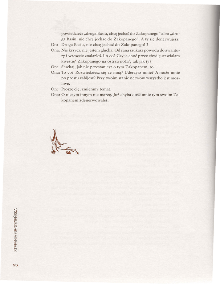 powiedzieć: "droga Basiu, chcę jechać do Zakopanego" albo "droga Basiu, nie chcę jechać do Zakopanego". A ty się denerwujesz. On: Droga Basiu, nie chcę jechać do Zakopanego!!! Ona: Nie krzycz, nie jestem głucha. Od rana szukasz powodu do awantury i wreszcie znalazłeś. loco? Czy ja choć przez chwilę stawiałam kwestię" Zakopanego na ostrzu noża", tak jak ty? On: Słuchaj, jak nie przestaniesz o tym Zakopanem, to ... Ona: To co? Rozwiedziesz się ze mną? Uderzysz mnie? A może mnie po prostu zabijesz? Przy twoim stanie nerwów wszystko jest możOn: liwe. Proszę cię, zmieńmy temat. Ona: O niczym innym nie marzę. Już chyba dość mnie tym swoim Zakopanem zdenerwowałeś. <I: ~ 'z w (f) N o O a: (9 ~ z ~ w I(f) 26