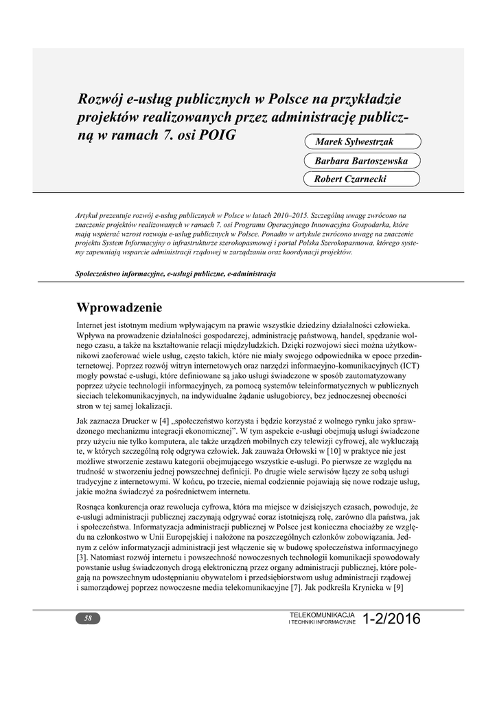 Rozwój e-usług publicznych w Polsce na przykładzie projektów realizowanych przez administrację publiczną w ramach 7. osi POIG Marek Sylwestrzak Barbara Bartoszewska Robert Czarnecki Artykuł prezentuje rozwój e-usług publicznych w Polsce w latach 2010–2015. Szczególną uwagę zwrócono na znaczenie projektów realizowanych w ramach 7. osi Programu Operacyjnego Innowacyjna Gospodarka, które mają wspierać wzrost rozwoju e-usług publicznych w Polsce. Ponadto w artykule zwrócono uwagę na znaczenie projektu System Informacyjny o infrastrukturze szerokopasmowej i portal Polska Szerokopasmowa, którego systemy zapewniają wsparcie administracji rządowej w zarządzaniu oraz koordynacji projektów. Społeczeństwo informacyjne, e-usługi publiczne, e-administracja Wprowadzenie Internet jest istotnym medium wpływającym na prawie wszystkie dziedziny działalności człowieka. Wpływa na prowadzenie działalności gospodarczej, administrację państwową, handel, spędzanie wolnego czasu, a także na kształtowanie relacji międzyludzkich. Dzięki rozwojowi sieci można użytkownikowi zaoferować wiele usług, często takich, które nie miały swojego odpowiednika w epoce przedinternetowej. Poprzez rozwój witryn internetowych oraz narzędzi informacyjno-komunikacyjnych (ICT) mogły powstać e-usługi, które definiowane są jako usługi świadczone w sposób zautomatyzowany poprzez użycie technologii informacyjnych, za pomocą systemów teleinformatycznych w publicznych sieciach telekomunikacyjnych, na indywidualne żądanie usługobiorcy, bez jednoczesnej obecności stron w tej samej lokalizacji. Jak zaznacza Drucker w [4] „społeczeństwo korzysta i będzie korzystać z wolnego rynku jako sprawdzonego mechanizmu integracji ekonomicznej”. W tym aspekcie e-usługi obejmują usługi świadczone przy użyciu nie tylko komputera, ale także urządzeń mobilnych czy telewizji cyfrowej, ale wykluczają te, w których szczególną rolę odgrywa człowiek. Jak zauważa Orłowski w [10] w praktyce nie jest możliwe stworzenie zestawu kategorii obejmującego wszystkie e-usługi. Po pierwsze ze względu na trudność w stworzeniu jednej powszechnej definicji. Po drugie wiele serwisów łączy ze sobą usługi tradycyjne z internetowymi. W końcu, po trzecie, niemal codziennie pojawiają się nowe rodzaje usług, jakie można świadczyć za pośrednictwem internetu. Rosnąca konkurencja oraz rewolucja cyfrowa, która ma miejsce w dzisiejszych czasach, powoduje, że e-usługi administracji publicznej zaczynają odgrywać coraz istotniejszą rolę, zarówno dla państwa, jak i społeczeństwa. Informatyzacja administracji publicznej w Polsce jest konieczna chociażby ze względu na członkostwo w Unii Europejskiej i nałożone na poszczególnych członków zobowiązania. Jednym z celów informatyzacji administracji jest włączenie się w budowę społeczeństwa informacyjnego [3]. Natomiast rozwój internetu i powszechność nowoczesnych technologii komunikacji spowodowały powstanie usług świadczonych drogą elektroniczną przez organy administracji publicznej, które polegają na powszechnym udostępnianiu obywatelom i przedsiębiorstwom usług administracji rządowej i samorządowej poprzez nowoczesne media telekomunikacyjne [7]. Jak podkreśla Krynicka w [9] 58 TELEKOMUNIKACJA I TECHNIKI INFORMACYJNE 1-2/2016 Marek Sylwestrzak, Barbara Bartoszewska, Robert Czarnecki Rozwój e-usług publicznych w Polsce na przykładzie projektów realizowanych przez administrację publiczną w ramach 7. osi POIG wzrost zainteresowania podmiotów skutecznym dostępem do informacji publicznej, zwłaszcza do informacji wytwarzanych i gromadzonych przez administrację, będzie wywoływał naciski na uruchomienie systemów elektronicznej administracji i usług publicznych zapewniających większą przejrzystość sprawowania władzy. W tym aspekcie, rozwój systemów e-administracji powinien poprawić funkcjonalności oraz e-dojrzałość istniejących usług publicznych. Poziom e-usług w Polsce Na przestrzeni kilku ostatnich lat można zaobserwować dynamiczny rozwój e-usług publicznych w Polsce. Procesowi temu sprzyja zarówno wzrastająca liczba osób posiadających sprzęt komputerowy z dostępem do internetu (wzrost o 27,5% w 2010 r. w porównaniu do 2006 r.), jak i wzrost możliwości świadczenia usług drogą elektroniczną [2]. Według danych Eurostatu w 2014 r. 75% gospodarstw domowych w Polsce miało dostęp do internetu, przy średniej unijnej wynoszącej 81%. Z roku na rok dystans do średniej UE ulega zmniejszeniu. Powodem tego jest dynamiczny rozwój oraz modernizacja infrastruktury telekomunikacyjnej. Osoby w wieku produkcyjnym dopiero wchodzące na rynek pracy nie mają oporów korzystania z technik ICT, w tym z internetu. Biegle posługują się dostępnymi aplikacjami i oprogramowaniem. Są jednocześnie świadome zagrożeń występujących w sieci i wiedzą, w jaki sposób się przed nimi uchronić. Nie dziwi więc fakt, że pojawiające się e-usługi świadczone przez podmioty publiczne są, dla coraz większej grupy społeczeństwa, czymś naturalnym mającym ułatwić życie. W Polsce w 2014 r. 39% użytkowników internetu, przynajmniej raz w roku, skorzystało z e-usług świadczonych przez administrację publiczną, co oznacza wzrost o 4% w stosunku do roku poprzedniego (rys. 1). Według metodologii przyjętej przez Eurostat w przeprowadzonym badaniu uwzględniono następujące e-usługi administracji publicznej: (1) pozyskiwanie informacji ze stron urzędów, bibliotek, placówek służby zdrowia oraz publicznych placówek edukacyjnych np. szkół, uczelni, (2) pobieranie formularzy, (3) przesyłanie formularzy np. rozliczenia podatkowe, wniosek o wyrobienie dowodu osobistego, wniosek o odpis aktu urodzenia. W badaniu nie uwzględniono informacji przesyłanych drogą e-mailową. W związku z dynamicznym rozwojem infrastruktury szerokopasmowej w Polsce należy się spodzie